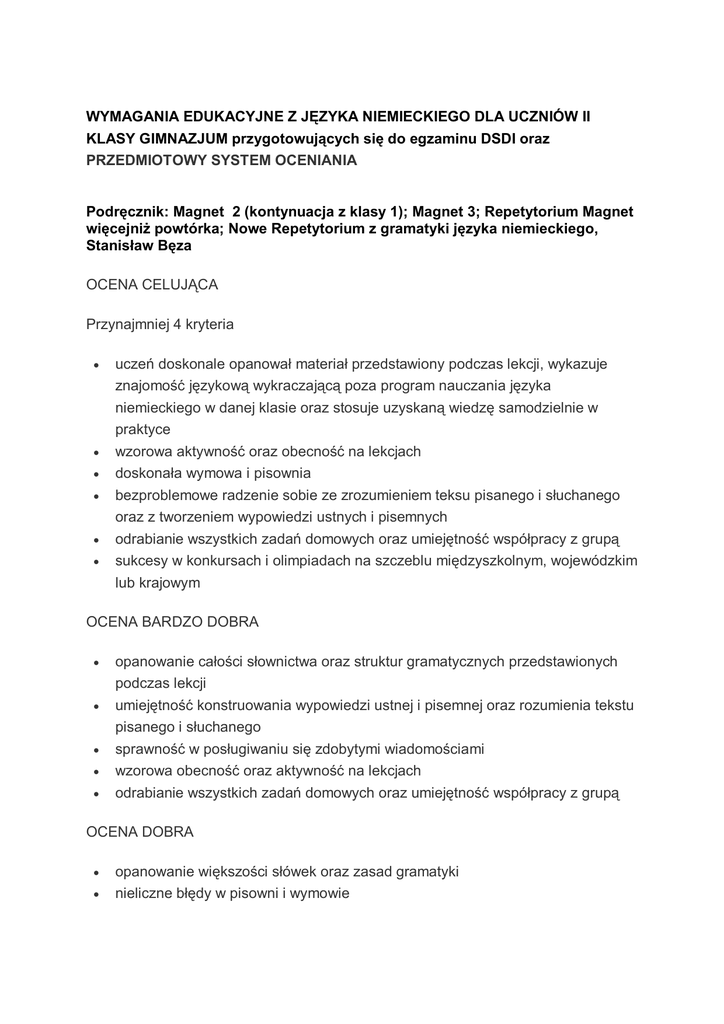 WYMAGANIA EDUKACYJNE Z JĘZYKA NIEMIECKIEGO DLA UCZNIÓW II KLASY GIMNAZJUM przygotowujących się do egzaminu DSDI oraz PRZEDMIOTOWY SYSTEM OCENIANIA Podręcznik: Magnet 2 (kontynuacja z klasy 1); Magnet 3; Repetytorium Magnet więcejniż powtórka; Nowe Repetytorium z gramatyki języka niemieckiego, Stanisław Bęza OCENA CELUJĄCA Przynajmniej 4 kryteria uczeń doskonale opanował materiał przedstawiony podczas lekcji, wykazuje znajomość językową wykraczającą poza program nauczania języka niemieckiego w danej klasie oraz stosuje uzyskaną wiedzę samodzielnie w praktyce wzorowa aktywność oraz obecność na lekcjach doskonała wymowa i pisownia bezproblemowe radzenie sobie ze zrozumieniem teksu pisanego i słuchanego oraz z tworzeniem wypowiedzi ustnych i pisemnych odrabianie wszystkich zadań domowych oraz umiejętność współpracy z grupą sukcesy w konkursach i olimpiadach na szczeblu międzyszkolnym, wojewódzkim lub krajowym OCENA BARDZO DOBRA opanowanie całości słownictwa oraz struktur gramatycznych przedstawionych podczas lekcji umiejętność konstruowania wypowiedzi ustnej i pisemnej oraz rozumienia tekstu pisanego i słuchanego sprawność w posługiwaniu się zdobytymi wiadomościami wzorowa obecność oraz aktywność na lekcjach odrabianie wszystkich zadań domowych oraz umiejętność współpracy z grupą OCENA DOBRA opanowanie większości słówek oraz zasad gramatyki nieliczne błędy w pisowni i wymowie nieliczne błędy w tworzeniu wypowiedzi ustnych i pisemnych oraz ze zrozumieniem tekstu pisanego i słuchanego przykładna aktywność i obecność na lekcjach odrabianie większości zadań domowych dobra współpraca z grupą OCENA DOSTATECZNA dosyć częste problemy ze zrozumieniem tekstu pisanego i słuchanego oraz z tworzeniem wypowiedzi ustnych i pisemnych opanowanie słownictwa oraz struktur gramatycznych na poziomie nie przekraczającym wymagań określonych przez podstawę programową odrabianie części zadań domowych pojawiające się problemy z pisownią i wymową zmienna aktywność oraz obecność na lekcjach pojawiająca się niechęć do współpracy z grupą OCENA DOPUSZCZAJĄCA liczne błędy w pisowni i wymowie częste nie radzenie sobie ze zrozumieniem tekstu pisanego i słuchanego oraz z konstruowaniem wypowiedzi ustnej i pisemnej odrabianie nielicznych zadań domowych słaba aktywność oraz obecność na lekcjach częsty brak współpracy z innymi uczniami znajomość tylko niektórych słówek oraz zasad gramatyki wykonywanie zadań o niewielkim stopniu trudności OCENA NIEDOSTATECZNA kompletne nie radzenie sobie ze zrozumieniem tekstu pisanego i słuchanego oraz z tworzeniem wypowiedzi ustnych i pisemnych nieznajomość podstawowego słownictwa oraz struktur gramatycznych bardzo liczne błędy w pisowni oraz wymowie niechęć wykonywania w stosunku do współpracy z grupą nieodrabianie zadań domowych bardzo słaba obecność oraz brak aktywności podczas zajęć braki uniemożliwiające promocję do wyższej klasy nie wyrażanie chęci do poprawy niewykonywanie zadań o elementarnym stopniu trudności 40% - 43% ⇒ dopuszczający 44% - 50% ⇒ dopuszczający 51% -54% ⇒ dopuszczający + 55% -58% ⇒ dostateczny 59% - 65% ⇒ dostateczny 66% - 69% ⇒ dostateczny + 70% - 73% ⇒ dobry 74% - 80% ⇒ dobry 81% - 84% ⇒ dobry + 85% - 88% ⇒ bardzo dobry 89% - 95% ⇒ bardzo dobry 96% -100% ⇒ celujący (kartkówki bardzo dobry +) Ocenie podlegają: Aktywność, zadania domowe- odrobione samodzielnie!, odpowiedzi ustne, czytanie na głos, wypowiedzi pisemne, zadania dodatkowe, udział w konkursie, praca na lekcji, zadania online, sprawdziany, testy (muszą zostać zapowiedziane i wpisane do terminarza) , kartkówki (nie muszą być zapowiedziane). Obowiązki ucznia: 1. Staranne i systematyczne prowadzenie zeszytu przedmiotowego oraz ćwiczeń 2. Samodzielne odrabianie zadań domowych i innych prac powierzonych przez nauczyciela 3. Przynoszenie podręcznika , zeszytu ćwiczeń, repetytoriów oraz wszelkich materiałów dodatkowych 4. Oddawanie wszystkich prac w terminie ustalonym przez nauczyciela 5. Napisanie zaległej kartkówki w terminie ustalonym z nauczycielem 6. Napisanie zaległego sprawdzianu w terminie do dwóch tygodni , w przypadku nieobecności ucznia z powodu dłuższej choroby 7. Napisanie zaległego sprawdzianu zaraz na drugi dzień w przypadku nieobecności 1-dniowej ucznia spowodowanej innym zdarzeniem losowym. Uczeń ma prawo 3 razy w ciągu jednego semestru zgłosić nieprzygotowanie Wymagania szczegółowe: Sport, Sport, Sport! dopuszczający Zna nazwy dyscyplin sportowych i sprzętu sportowego, zna odmianę czasowników modalnych w czasie teraźniejszym Es ist Zna czas Perfekt passiert! czasowników regularnych i nieregularnych, potrafi zastąpić zdanie w czasie teraźniejszym zdaniem w czasie Perfekt Krank Zna części ciała, und potrafi gesund opowiedzieć o swoich dolegliwościach Meine Nachbarn, mein Stadtviertel dostateczny Potrafi odpowiedzieć na pytania dotyczące sportu, złożyć i odrzucić propozycję spędzenia czasu wolnego, potrafi odpowiedzieć na pytania bardzo dobry Potrafi opowiedzieć o sporcie, omówić statystykę dotyczącą sportu Potrafi selekcjonować informacje i odpowiadać na pytania z zastosowaniem czasu Perfekt dobry Potrafi ułożyć dialog na temat sportu, pytać o umiejętności innych osób i informować o swoich, potrafi opisać swoje popołudnie, stosując czasowniki modalne Potrafi ułożyć dialog w czasie Perfekt na temat Mój dzień, potrafi określić intencje nadawcy tekstu Potrafi zapytać o stan zdrowia innych osób i odpowiedzieć na takie pytanie Potrafi ułożyć dialog U lekarza i nazywać znane środki lecznicze Potrafi opowiedzieć o swojej wizycie u lekarza i wyjaśnić przyczyny, stosując zdania podrzędne Uczeń nazywa środki lokomocji, określa przynależność, rozumie treść planu miasta Uczeń przedstawia i charakteryzuje inne osoby, identyfik