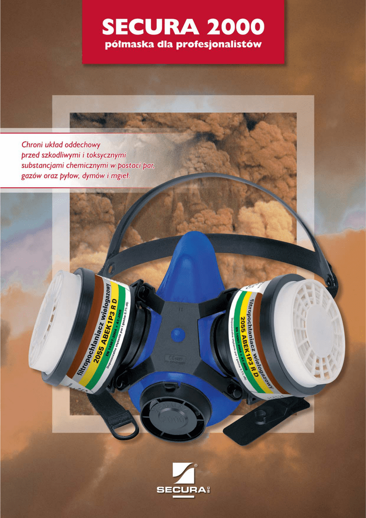 zawór wydechowy usytuowany w najni˝szym miejscu dla dobrego odprowadzania skroplonej pary wodnej z∏àcza bagnetowe umo˝liwiajàce szybkie i pewne mocowanie poch∏aniaczy, filtrów i filtropoch∏aniaczy cz´Êç twarzowa o doskona∏ym doszczelnieniu, delikatnym dotyku, bezwonna i nie powodujàca podra˝nieƒ wykonana z kauczuku silikonowego lub neoprenu nag∏owie tekstylno-gumowe z plastikowymi taÊmami nie dra˝niàce skóry i nie szarpiàce w∏osów wàski profil wokó∏ nosa umo˝liwia prac´ w okularach krzy˝ak równo rozk∏adajàcy docisk do twarzy, nawet przy najci´˝szych filtropoch∏aniaczach pewny i wygodny system zapinania z ty∏u g∏owy SECURA 2000 pó∏maska z bagnetowym mocowaniem filtrów, poch∏aniaczy i filtropoch∏aniaczy • lekka (105g), niewielkich rozmiarów, nie utrudnia pracy i nie ogranicza pola widzenia • wykonana w ca∏oÊci z tworzyw sztucznych nie wch∏aniajàcych ˝adnych substancji chemicznych, odporna na temperatur´ (trudnopalna), antystatyczna • wyposa˝ona w pe∏en zestaw poch∏aniaczy, filtrów i filtropoch∏aniaczy o bardzo du˝ych ch∏onnoÊciach i ma∏ych oporach oddychania • dwa rozmiary, zapewniajàce dopasowanie do ka˝dej twarzy • ∏atwa w demonta˝u, do mycia i dezynfekcji • niezniszczalna – wszystkie elementy wymienne system wygodnego i szybkiego dociàgania taÊm nag∏owia na twarzy u˝ytkownika POCH¸ANIACZE SELEKTYWNE typu A1, B1, E1, K1 oraz A2, B2, E2, K2 klasy 1 (A1...): chronià przed szkodliwymi parami i gazami o st´˝eniach nie wi´kszych ni˝ 0,1%, klasy 2 (A2...) przed szkodliwymi parami i gazami o st´˝eniach nie przekraczajàcych 0,5%. Poch∏aniacze klasy 2 u˝yte przy st´˝eniach do 0,1% zamiast poch∏aniaczy klasy 1 zapewniajà d∏u˝szy czas ochronnego dzia∏ania. Optymalna ochrona w warunkach zagro˝enia jednym rodzajem gazu o znanym st´˝eniu. FILTRY AEROZOLOWE typu P1 NR, P1 R, P2 R, P3 R filtry klasy P1 NR oraz P1 R chronià przed aerozolami z czàstek sta∏ych i ciek∏ych, do st´˝eƒ nie przekraczajàcych 4xNDS. Wyst´pujà jako p∏atki wk∏adane do uchwytu lub nak∏adane na poch∏aniacze w celu przed∏u˝enia czasu ich pracy. Filtry P2 R stosowane do st´˝eƒ nie przekraczajàcych 10xNDS wyst´pujà jako filtry p∏askie wk∏adane do uchwytu, filtry plisowane wykonane z kartonu szklanego lub filtry dwustronne z materia∏u o w∏asnoÊciach tryboelektrycznych - mocowane bezpoÊrednio do cz´Êci twarzowej pó∏maski. Filtry klasy P3 R chronià przed szkodliwymi lub toksycznymi py∏ami, dymami i mg∏ami, w tym w∏óknami azbestu i py∏ami radioaktywnymi, o st´˝eniach nie przekraczajàcych 30xNDS. Wyst´pujà w postaci filtrów plisowanych wykonanych z kartonu szklanego lub filtrów dwustronnych wykonanych z materia∏u o w∏asnoÊciach tryboelektrycznych - montowanych bezpoÊrednio do cz´Êci twarzowej. FILTROPOCH¸ANIACZE SELEKTYWNE typu A1P2 RD, B1P2 RD, E1P2 RD, K1P2 RD oraz A2P2 RD, B2P2 RD, E2P2 RD, K2P2 RD chronià przed parami i gazami o st´˝eniach do 0,1% (klasy 1) lub o st´˝eniach do 0,5% (klasy 2) oraz wyst´pujàcymi równoczeÊnie szkodliwymi py∏ami, dymami i mg∏ami o ile st´˝enie fazy rozproszonej nie przekracza 10 x NDS. Filtr P2 przed∏u˝a równie˝ znacznie czas ochronnego dzia∏ania poch∏aniacza. FILTROPOCH¸ANIACZE SELEKTYWNE typu A1P3 RD, B1P3 RD, E1P3 RD, K1P3 RD oraz A2P3 RD, B2P3 RD, E2P3 RD, K2P3 RD chronià przed parami i gazami o st´˝eniach do 0,1% (klasy 1) lub o st´˝eniach do 0,5% (klasy 2) oraz wyst´pujàcymi równoczeÊnie toksycznymi py∏ami, dymami i mg∏ami o o ile st´˝enie fazy rozproszonej nie przekracza 30 x NDS. Zalecane do d∏ugiej pracy w warunkach zagro˝enia toksycznymi aerozolami zwiàzków chemicznych. POCH¸ANIACZE I FILTROPOCH¸ANIACZE WIELOGAZOWE typu ABEK1, ABEK1P2 RD, ABEK1P3 RD, ABEK1P2 RD/CO chronià przed mieszaninami gazów i par toksycznych oraz wyst´pujàcymi równoczeÊnie szkodliwymi i toksycznymi py∏ami, dymami i mg∏ami. Filtropoch∏aniacze ABEK1P3 RD zalecane sà do u˝ycia, gdy nie ma pewnoÊci co do charakteru zagro˝eƒ, np. przy ewakuacji z terenu awarii chemicznej, a filtropoch∏aniacze ABEK1P2 RD/CO przy ewakuacji z po˝aru. Zestawy SECURA 2000: SECURA 2000 DUST Zestaw chroniàcy przed py∏ami, dymami i mg∏ami. U˝ycie du˝ych, owalnych filtrów z efektem tryboelektrycznym pozwala na uzyskanie wysokiej skutecznoÊci przy niskich oporach oddychania i wysokiej ch∏onnoÊci py∏owej, zwi´kszajàc komfort oddychania. Kszta∏t filtrów minimalizuje ograniczenie pola widzenia. Typowe zastosowania zestawu z filtrami klasy P1: urabianie surowców mineralnych (oprócz azbestu); obróbka (ci´cie, szlifowanie) ˝elaza, stali i kamienia; obróbka drewna mi´kkiego; czyszczenie odlewów i konstrukcji stalowych; produkcja, prze∏adunek i stosowanie wapna, cementu, nawozów sztucznych, surowców dla przemys∏u szklarskiego i ceramicznego, surowców dla przemys∏u gumowego. Typowe zastosowania zestawu z filtrami klasy P2: urabianie surowców mineralnych zawierajàcych ponad 50% wolnej krzemionki; pozyskiwanie i przeróbka rud metali (˝elaza, miedzi, cynku, o∏owiu); wytapianie i odlewanie metali (oprócz cynku i o∏owiu); spawanie elektryczne; obróbka aluminium i jego stopów; ci´cie i szlifowanie drewna twardego; produkcja màki, pasz i produktów farmaceutycznych. W sk∏ad zestawu wchodzà: • pó∏maska SECURA 2000 neoprenowa lub silikonowa – 1 szt. • ∏àcznik puszkowy – 2 szt. • filtry tryboelektryczne SECAIR 2000.12 P1 R lub SECAIR 2000.06 P2 R – 12 szt. SECURA 2000 GWAREK Zestaw do d∏ugotrwa∏ej pracy przy du˝ym st´˝eniu szkodliwych py∏ów, dymów lub mgie∏. Filtry SECAIR 2000.01 P3 R zapewniajà najwy˝szà, odpowiadajàcà klasie P3 skutecznoÊç filtracji aerozoli, w tym bakterii i wirusów oraz aerozoli radioaktywnych i py∏ów azbestu przy oporach oddychania odpowiadajàcych klasie P1. Oznacza to np. mo˝liwoÊç pracy przez ca