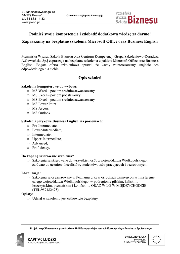 ul. Niedziałkowskiego 18 61-579 Poznań tel. 61 833-14-33 www.pwsb.pl Człowiek – najlepsza inwestycja Podnieś swoje kompetencje i zdobądź dodatkową wiedzę za darmo! Zapraszamy na bezpłatne szkolenia Microsoft Office oraz Business English Poznańska Wyższa Szkoła Biznesu oraz Centrum Kompetencji Grupa Szkoleniowo-Doradcza A.Gawrońska Sp.j zapraszają na bezpłatne szkolenia z pakietu Microsoft Office oraz Business English. Bogata oferta szkoleniowa sprawi, że każdy zainteresowany znajdzie coś odpowiedniego dla siebie. Opis szkoleń Szkolenia komputerowe do wyboru: • MS Word – poziom średniozaawansowany • MS Excel – poziom podstawowy • MS Excel – poziom średniozaawansowany • MS Power Point • MS Access • MS Outlook Szkolenia językowe Business English, na poziomach: • Pre-Intermediate, • Lower-Intermediate, • Intermediate, • Upper-Intermediate, • Advanced, • Proficiency. Do kogo są skierowane szkolenia? • Szkolenia są skierowane do wszystkich osób z województwa Wielkopolskiego, zarówno do uczniów, licealistów, studentów, osób pracujących i bezrobotnych. Lokalizacja: • Szkolenia są organizowane w Poznaniu oraz w ośrodkach zamiejscowych na terenie całego województwa Wielkopolskiego, w podregionie pilskim, kaliskim, leszczyńskim, poznańskim i konińskim, ORAZ W LO W MIĘDZYCHODZIE (TEL.957482475) Opłaty: • Udział w szkoleniu jest całkowicie bezpłatny Projekt współfinansowany ze środków Unii Europejskiej w ramach Europejskiego Funduszu Społecznego ul. Niedziałkowskiego 18 61-579 Poznań tel. 61 833-14-33 www.pwsb.pl Człowiek – najlepsza inwestycja Tryp szkolenia: • blended learning w proporcjach 50/50, z obligatoryjnym wykorzystaniem platformy e-learingowej, dotyczy zarówno szkoleń komputerowych, jak i językowych Ilość godzin szkoleniowych: • Szkolenia językowe realizowane są w ilości 60 godzin (30 godzin zajęć, 30 godzin ćwiczeń na platformie e-learningowej). • Szkolenia komputerowe realizowane są w ilości 32 godzin zajęć (16 godzin zajęć, 16 godzin ćwiczeń na platformie e-learningowej). Korzyści wynikające z uczestnictwa w szkoleniach • Masz możliwość bezpłatnie podnieść swoje kompetencje, dzięki czemu będziesz lepiej przygotowany do coraz bardziej konkurencyjnego rynku pracy, • Zdobędziesz nowe, jakże przydatne umiejętności, które przydadzą się w codziennym życiu zawodowym i nie tylko, • Otrzymasz praktyczną i wysoką jakość kształcenia, a także dokładnie przygotowane materiały szkoleniowe. Zainwestuj w siebie i prześlij swoje zgłoszenie: Dyrektor administracyjny mgr Monika Cichocka – Kryg e-mail: [email protected] lub skontaktuj się z nami pod numerem 61-833-14-33 wew. 109 Szkolenie są realizowane w ramach projektu „Uczelnia z przyszłością – Program Rozwoju Poznańskiej Wyższej Szkoły Biznesu”, nr POKL.04.01.01-00-024/10 Projekt współfinansowany ze środków Unii Europejskiej w ramach Europejskiego Funduszu Społecznego
