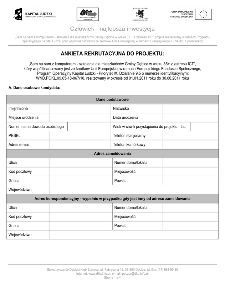 Człowiek - najlepsza inwestycja ANKIETA REKRUTACYJNA DO