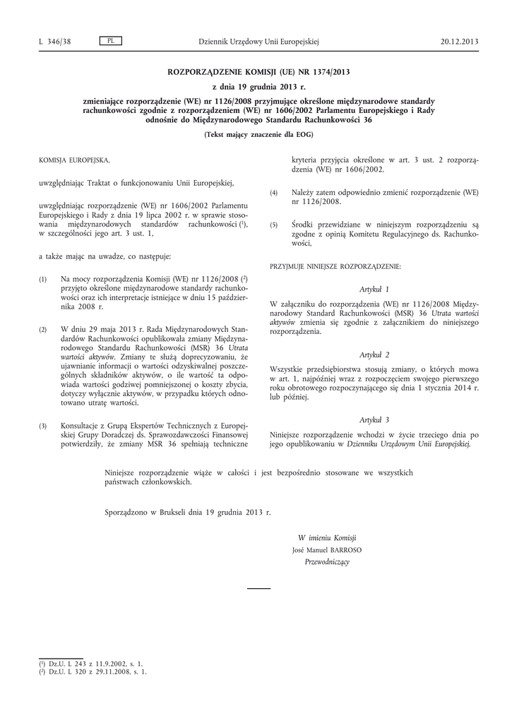 L 346/38 PL Dziennik Urzędowy Unii Europejskiej 20.12.2013 ROZPORZĄDZENIE KOMISJI (UE) NR 1374/2013 z dnia 19 grudnia 2013 r. zmieniające rozporządzenie (WE) nr 1126/2008 przyjmujące określone międzynarodowe standardy rachunkowości zgodnie z rozporządzeniem (WE) nr 1606/2002 Parlamentu Europejskiego i Rady odnośnie do Międzynarodowego Standardu Rachunkowości 36 (Tekst mający znaczenie dla EOG) kryteria przyjęcia określone w art. 3 ust. 2 rozporzą dzenia (WE) nr 1606/2002. KOMISJA EUROPEJSKA, uwzględniając Traktat o funkcjonowaniu Unii Europejskiej, uwzględniając rozporządzenie (WE) nr 1606/2002 Parlamentu Europejskiego i Rady z dnia 19 lipca 2002 r. w sprawie stoso wania międzynarodowych standardów rachunkowości (1), w szczególności jego art. 3 ust. 1, (4) Należy zatem odpowiednio zmienić rozporządzenie (WE) nr 1126/2008. (5) Środki przewidziane w niniejszym rozporządzeniu są zgodne z opinią Komitetu Regulacyjnego ds. Rachunko wości, a także mając na uwadze, co następuje: PRZYJMUJE NINIEJSZE ROZPORZĄDZENIE: (1) (2) (3) (2) Na mocy rozporządzenia Komisji (WE) nr 1126/2008 przyjęto określone międzynarodowe standardy rachunko wości oraz ich interpretacje istniejące w dniu 15 paździer nika 2008 r. W dniu 29 maja 2013 r. Rada Międzynarodowych Stan dardów Rachunkowości opublikowała zmiany Międzyna rodowego Standardu Rachunkowości (MSR) 36 Utrata wartości aktywów. Zmiany te służą doprecyzowaniu, że ujawnianie informacji o wartości odzyskiwalnej poszcze gólnych składników aktywów, o ile wartość ta odpo wiada wartości godziwej pomniejszonej o koszty zbycia, dotyczy wyłącznie aktywów, w przypadku których odno towano utratę wartości. Konsultacje z Grupą Ekspertów Technicznych z Europej skiej Grupy Doradczej ds. Sprawozdawczości Finansowej potwierdziły, że zmiany MSR 36 spełniają techniczne Artykuł 1 W załączniku do rozporządzenia (WE) nr 1126/2008 Między narodowy Standard Rachunkowości (MSR) 36 Utrata wartości aktywów zmienia się zgodnie z załącznikiem do niniejszego rozporządzenia. Artykuł 2 Wszystkie przedsiębiorstwa stosują zmiany, o których mowa w art. 1, najpóźniej wraz z rozpoczęciem swojego pierwszego roku obrotowego rozpoczynającego się dnia 1 stycznia 2014 r. lub później. Artykuł 3 Niniejsze rozporządzenie wchodzi w życie trzeciego dnia po jego opublikowaniu w Dzienniku Urzędowym Unii Europejskiej. Niniejsze rozporządzenie wiąże w całości i jest bezpośrednio stosowane we wszystkich państwach członkowskich. Sporządzono w Brukseli dnia 19 grudnia 2013 r. W imieniu Komisji José Manuel BARROSO Przewodniczący (1) Dz.U. L 243 z 11.9.2002, s. 1. (2) Dz.U. L 320 z 29.11.2008, s. 1. 20.12.2013 PL Dziennik Urzędowy Unii Europejskiej ZAŁĄCZNIK MIĘDZYNARODOWE STANDARDY RACHUNKOWOŚCI MSR 36 MSR 36 Utrata wartości aktywów „Powielanie dozwolone w obrębie Europejskiego Obszaru Gospodarczego. Wszystkie istniejące prawa są zastrzeżone poza EOG, z wyjątkiem prawa do powielania na użytek własny lub w innych uczciwych celach. Więcej informacji można uzyskać na stronie RMSR www.iasb.org”. L 346/39 PL L 346/40 Dziennik Urzędowy Unii Europejskiej Ujawnianie wartości odzyskiwalnej w odniesieniu do aktywów niefinansowych (Zmiany MSR 36 Utrata wartości aktywów) Paragrafy 130 i 134 oraz nagłówek nad paragrafem 138 zostały zmienione oraz dodano paragraf 140J. UJAWNIANIE INFORMACJI … 130 Jednostka ujawnia następujące informacje w odniesieniu do pojedynczego składnika aktywów (w tym wartości firmy) lub ośrodka wypracowującego środki pieniężne, w przypadku których w danym okresie nastąpiło ujęcie lub odwrócenie odpisu aktualizującego z tytułu utraty wartości: a) ... e) wartość odzyskiwalną danego składnika aktywów (ośrodka wypracowującego środki pieniężne) oraz informację, czy wartość odzyskiwalna składnika aktywów (ośrodka wypracowującego środki pieniężne) odpowiada jego wartości godziwej pomniejszonej o koszty zbycia lub jego wartości użyt kowej; f) jeśli wartość odzyskiwalna odpowiada wartości godziwej pomniejszonej o koszty zbycia, jednostka ujawnia następujące informacje: (i) poziom hierarchii wartości godziwej (zob. MSSF 13), w ramach której wycena wartości godziwej składnika aktywów (ośrodka wypracowującego środki pieniężne), bez uwzględnienia tego, czy „koszty zbycia” są obserwowalne; (ii) w odniesieniu do wycen wartości godziwej sklasyfikowanych na poziomie 2 i poziomie 3 hierar chii wartości godziwej – opis techniki(technik) wyceny wykorzystanej(wykorzystanych) do usta lenia wartości godziwej pomniejszonej o koszty zbycia. Jeżeli nastąpiła zmiana techniki wyceny, jednostka ujawnia tę zmianę i przyczynę(przyczyny) jej wprowadzenia; oraz (iii) w odniesieniu do wycen wartości godziwej sklasyfikowanych na poziomie 2 i poziomie 3 hierar chii wartości godziwej – opis każdego z kluczowych założeń, na których kierownictwo oparło ustalenie wartości godziwej pomniejszonej o koszty zbycia. Za kluczowe uznaje się te założenia, które wywierają największy wpływ na wartość odzyskiwalną danego składnika aktywów (ośrodka wypracowującego środki pieniężne). Jednostka ujawnia również stopę(stopy) dyskonto wą(dyskontowe) zastosowaną(zastosowane) do bieżącej i poprzedniej wyceny, jeżeli wartość godziwa pomniejszona o koszty zbycia jest ustalana z zastosowaniem techniki wartości bieżącej; g) … … Szacunkowe prognozy wykorzystywane do wyceny wartości odzyskiwalnych ośrodków wypracowują cych środki pieniężne obejmujących wartość firmy lub wartości niematerialne o nieokreślonym okresie użytkowania 134 Jednostka ujawnia informacje wymagane zgodnie z pkt a)–f) w odniesieniu do każdego ośrodka wypra cowującego środki pieniężne (zespołu ośrodków), jeśli wartość bilansowa przypisanej do danego ośrodka (zespołu ośrodków) wartości firmy lub składnikó