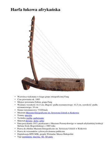 Harfa łukowa afrykańska • • • • • • • • • • • • • • Wytwórca wykonana w kręgu grupy etnograficznej Fang Czas powstania ok. 1885 Miejsce powstania Gabon, grupa Fang Wymiary wysokość: 61,5 cm, długość: pudła rezonansowego: 41,5 cm, szerokość: pudła rezonansowego: 10 cm Numer inwentarzowy 73105/mek Muzeum Muzeum Etnograficzne im. Seweryna Udzieli w Krakowie Tematy muzyka Technika rzeźba, garbowanie Materiał drewno, skóra, jelito Data pozyskania 1913, przekazano z Muzeum Przemysłowego w ramach afrykańskiej kolekcji Stefana SzolcRogozińskiego z 1885 roku Prawa do obiektu Muzeum Etnograficzne im. Seweryna Udzieli w Krakowie Prawa do wizerunków cyfrowych domena publiczna Digitalizacja RPD MIK, projekt Wirtualne Muzea Małopolski Tagi instrument, muzyka, 3D, 3D unity Rezonator z wyżłobionego kawałka drewna, obciągniętego skórą przymocowaną za pomocą rzemieni. Struny ze ścięgien lub jelit, małe drewniane kołki do strojenia. W latach 1882—1885 (choć Polska nie istniała wówczas na mapach świata) została zorganizowana Pierwsza Polska Wyprawa Naukowa do Afryki — pierwszy polski projekt naukowobadawczy realizowany w Afryce. Na czele ekspozycji stanął jej inicjator — Stefan SzolcRogoziński. Po zakończeniu wyprawy spędził on jeszcze kilka lat na wyspie Fernando Po (obecnie Bioko w Gwinei Równikowej), gdzie zarządzał plantacją, nie rezygnując z naukowych eksploracji. Zajmowały go studia nad kulturą ludu Bubi (Bubisów), rdzennej ludności wyspy. Przez wszystkie te lata Rogoziński rozbudowywał swoje zbiory. Trafiły one niemal w całości do Muzeum Etnograficznego w Krakowie (po reorganizacji krakowskiego Muzeum TechnicznoPrzemysłowego). Dziś to łącznie ponad 300 obiektów z Madery, Sierra Leone, terytorium obecnego Wybrzeża Kości Słoniowej i Ghany — Kraju Assini, Nigerii, Kamerunu, Gabonu, Kongo, Gwinei Równikowej; nieliczne przedmioty z Wysp Kanaryjskich i Maroko, wśród nich: wiosła, modele łodzi, narzędzia pracy, przedmioty codziennego użytku, ozdoby, symbole władzy i dostojeństwa, instrumenty muzyczne, broń i związane z nią akcesoria oraz elementy stroju — zwłaszcza kapelusze. Opracowanie: Muzeum Etnograficzne im. Seweryna Udzieli w Krakowie, © wszystkie prawa zastrzeżone