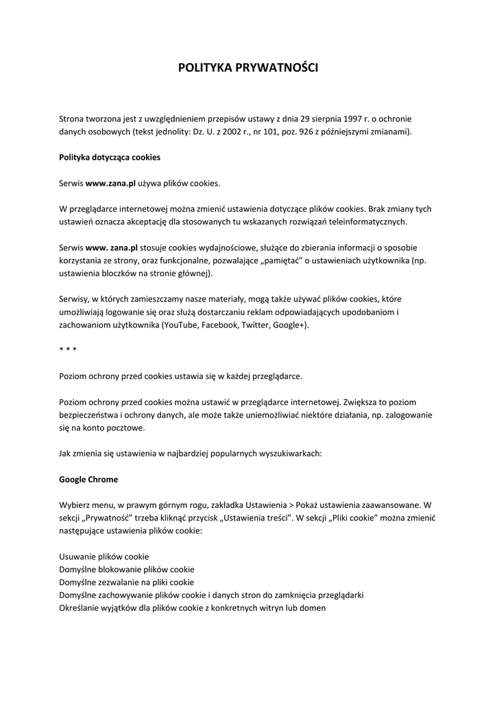 POLITYKA PRYWATNOŚCI Strona tworzona jest z uwzględnieniem przepisów ustawy z dnia 29 sierpnia 1997 r. o ochronie danych osobowych (tekst jednolity: Dz. U. z 2002 r., nr 101, poz. 926 z późniejszymi zmianami). Polityka dotycząca cookies Serwis www.zana.pl używa plików cookies. W przeglądarce internetowej można zmienić ustawienia dotyczące plików cookies. Brak zmiany tych ustawień oznacza akceptację dla stosowanych tu wskazanych rozwiązań teleinformatycznych. Serwis www. zana.pl stosuje cookies wydajnościowe, służące do zbierania informacji o sposobie korzystania ze strony, oraz funkcjonalne, pozwalające „pamiętać” o ustawieniach użytkownika (np. ustawienia bloczków na stronie głównej). Serwisy, w których zamieszczamy nasze materiały, mogą także używać plików cookies, które umożliwiają logowanie się oraz służą dostarczaniu reklam odpowiadających upodobaniom i zachowaniom użytkownika (YouTube, Facebook, Twitter, Google+). *** Poziom ochrony przed cookies ustawia się w każdej przeglądarce. Poziom ochrony przed cookies można ustawić w przeglądarce internetowej. Zwiększa to poziom bezpieczeństwa i ochrony danych, ale może także uniemożliwiać niektóre działania, np. zalogowanie się na konto pocztowe. Jak zmienia się ustawienia w najbardziej popularnych wyszukiwarkach: Google Chrome Wybierz menu, w prawym górnym rogu, zakładka Ustawienia > Pokaż ustawienia zaawansowane. W sekcji „Prywatność” trzeba kliknąć przycisk „Ustawienia treści”. W sekcji „Pliki cookie” można zmienić następujące ustawienia plików cookie: Usuwanie plików cookie Domyślne blokowanie plików cookie Domyślne zezwalanie na pliki cookie Domyślne zachowywanie plików cookie i danych stron do zamknięcia przeglądarki Określanie wyjątków dla plików cookie z konkretnych witryn lub domen Internet Explorer 6.0 i 7.0 Z menu przeglądarki, prawy górny róg: Narzędzia > Opcje Internetowe > Prywatność, przycisk Witryny. Suwakiem ustawiamy poziom, zmianę zatwierdzamy przyciskiem OK. Mozilla Firefox Z menu przeglądarki: Narzędzia > Opcje > Prywatność. Uaktywnić pole Program Firefox: „będzie używał ustawień użytkownika”. O ciasteczkach (cookies) decyduje zaklikanie – bądź nie – pozycji Akceptuj ciasteczka. Opera Z menu przeglądarki: Narzędzie > Preferencje > Zaawansowane. O ciasteczkach decyduje zaznaczenie – bądź nie – pozycji Ciasteczka. Safari W menu rozwijanym Safari trzeba wybrać Preferencje i kliknąć ikonę Bezpieczeństwo. Tu wybiera się poziom bezpieczeństwa w obszarze ,,Akceptuj pliki cookie”. Urządzenia mobilne Każdy model telefonu może tę funkcję obsługiwać w inny sposób. Dlatego zachęcamy do zapoznania się z opcjami prywatności w dokumentacji na stronie internetowej producenta Twojego urządzenia mobilnego.