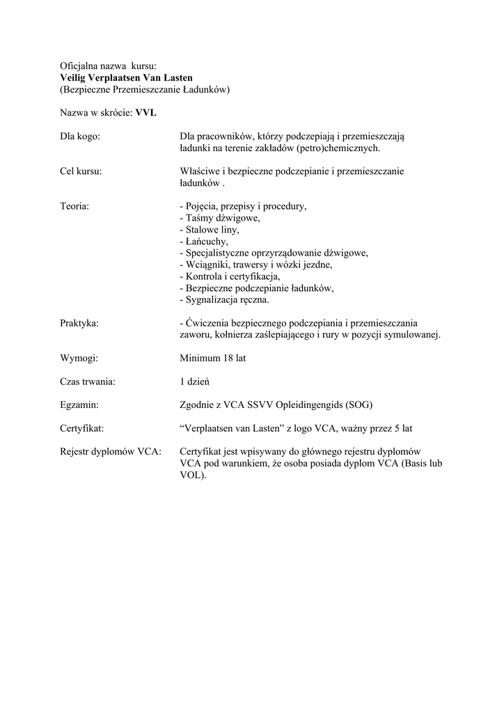 Oficjalna nazwa kursu: Veilig Verplaatsen Van Lasten (Bezpieczne Przemieszczanie Ładunków) Nazwa w skrócie: VVL Dla kogo: Dla pracowników, którzy podczepiają i przemieszczają ładunki na terenie zakładów (petro)chemicznych. Cel kursu: Właściwe i bezpieczne podczepianie i przemieszczanie ładunków . Teoria: - Pojęcia, przepisy i procedury, - Taśmy dźwigowe, - Stalowe liny, - Łańcuchy, - Specjalistyczne oprzyrządowanie dźwigowe, - Wciągniki, trawersy i wózki jezdne, - Kontrola i certyfikacja, - Bezpieczne podczepianie ładunków, - Sygnalizacja ręczna. Praktyka: - Ćwiczenia bezpiecznego podczepiania i przemieszczania zaworu, kołnierza zaślepiającego i rury w pozycji symulowanej. Wymogi: Minimum 18 lat Czas trwania: 1 dzień Egzamin: Zgodnie z VCA SSVV Opleidingengids (SOG) Certyfikat: “Verplaatsen van Lasten” z logo VCA, ważny przez 5 lat Rejestr dyplomów VCA: Certyfikat jest wpisywany do głównego rejestru dyplomów VCA pod warunkiem, że osoba posiada dyplom VCA (Basis lub VOL).