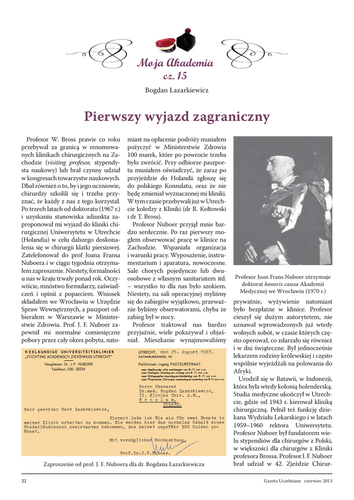 Moja Akademia cz. 15 Bogdan Łazarkiewicz Pierwszy wyjazd zagraniczny Profesor W. Bross prawie co roku przebywał za granicą w renomowanych klinikach chirurgicznych na Zachodzie (visiting profesor, stypendysta naukowy) lub brał czynny udział w kongresach towarzystw naukowych. Dbał również o to, by i jego uczniowie, chirurdzy szkolili się i trzeba przyznać, że każdy z nas z tego korzystał. Po trzech latach od doktoratu (1967 r.) i uzyskaniu stanowiska adiunkta zaproponował mi wyjazd do kliniki chirurgicznej Uniwersytetu w Utrechcie (Holandia) w celu dalszego doskonalenia się w chirurgii klatki piersiowej. Zatelefonował do prof Joana Fransa Nuboera i w ciągu tygodnia otrzymałem zaproszenie. Niestety, formalności u nas w kraju trwały ponad rok. Oczywiście, mnóstwo formularzy, zaświadczeń i opinii z poparciem. Wniosek składałem we Wrocławiu w Urzędzie Spraw Wewnętrznych, a paszport odbierałem w Warszawie w Ministerstwie Zdrowia. Prof. J. F. Nuboer zapewnił mi normalne comiesięczne pobory przez cały okres pobytu, nato- miast na opłacenie podróży musiałem pożyczyć w Ministerstwie Zdrowia 100 marek, które po powrocie trzeba było zwrócić. Przy odbiorze paszportu musiałem oświadczyć, że zaraz po przyjeździe do Holandii zgłoszę się do polskiego Konsulatu, oraz że nie będę zmieniał wyznaczonej mi kliniki. W tym czasie przebywali już w Utrechcie koledzy z Kliniki (dr R. Kołtowski i dr T. Bross). Profesor Nuboer przyjął mnie bardzo serdecznie. Po raz pierwszy mogłem obserwować pracę w klinice na Zachodzie. Wspaniała organizacja i warunki pracy. Wyposażenie, instrumentarium i aparatura, nowoczesne. Sale chorych pojedyncze lub dwuosobowe z własnym sanitariatem itd. – wszystko to dla nas było szokiem. Niestety, na sali operacyjnej myliśmy się do zabiegów wyjątkowo, przeważnie byliśmy obserwatorami, chyba że zabieg był w nocy. Profesor traktował nas bardzo przyjaźnie, wiele pokazywał i objaśniał. Mieszkanie wynajmowaliśmy Zaproszenie od prof. J. F. Nuboera dla dr. Bogdana Łazarkiewicza 22 Profesor Joan Frans Nuboer otrzymuje doktorat honoris causa Akademii Medycznej we Wrocławiu (1970 r.) prywatnie, wyżywienie natomiast było bezpłatne w klinice. Profesor cieszył się dużym autorytetem, nie uznawał wprowadzonych już wtedy wolnych sobót, w czasie których często operował, co zdarzało się również i w dni świąteczne. Był jednocześnie lekarzem rodziny królewskiej i często wspólnie wyjeżdżali na polowania do Afryki. Urodził się w Batawii, w Indonezji, która była wtedy kolonią holenderską. Studia medyczne ukończył w Utrechcie, gdzie od 1943 r. kierował kliniką chirurgiczną. Pełnił też funkcję dziekana Wydziału Lekarskiego i w latach 1959–1960 rektora Uniwersytetu. Profesor Nuboer był fundatorem wielu stypendiów dla chirurgów z Polski, w większości dla chirurgów z Kliniki profesora Brossa. Profesor J. F. Nuboer brał udział w 42. Zjeździe ChirurGazeta Uczelniana czerwiec 2013 gów Polskich we Wrocławiu, którego organizatorem był ówczesny prezes Zarządu Głównego TChP, profesor Wiktor Bross (23–25.09.1964) Uczelnia nasza nadała mu godność doktora honoris causa w 1970 r. Chirurgia jamy brzusznej i klatki piersiowej ze szczególnym uwzględnieniem operacji plastycznych wpustu były jego specjalnością. Szczególnie zainteresował mnie nowy sposób operacji przepukliny rozworu przełykowego przepony (hernia hiatus oesophagealis diaphragmae) drogą torakotomii. Sposób ten wprowadziłem po powrocie do naszej Kliniki. W czasie pobytu miały miejsce dwa wydarzenia niemające nic wspólnego z chirurgią. Pierwsze to poród księżniczki E. Beatrix, przyszłej królowej Holandii dynastii Oranje-Nassau w naszym budynku klinicznym (urodziła syna księcia Johana Frisko). Klinikę otoczyła policja konna oraz dziennikarze, wszyscy udekorowani pomarańczowymi kokardami (kolor dynastii Oranje). Nawet ciasteczka w klinice były pokryte lukrem pomarańczowym, podobnie jak kolor wszystkich wystaw sklepowych W kościołach biły dzwony i całe miasto wiwatowało… Drugie wydarzenie mniej wesołe – wkroczenie wojsk Układu Warszawskiego, w tym armii polskiej, do Czechosłowacji. Inaczej to było odbierane w naszym kraju, a zupełnie inaczej tu na Zachodzie. Powstała panika, zagrożenie wojną, docierały coraz to nowe nieciekawe doniesienia Profesor Werner Klinner kardiochirurg z Monachium podczas wizyty w II Klinice Chirurgicznej Akademii Medycznej we Wrocławiu (od lewej: autor, prof. W. Bross, prof W. Klinner) korespondentów z frontu. „Co będzie z nami?”, „Na pewno będziemy internowani”. Ponieważ zbliżała się jesień, na wszelki wypadek kupiliśmy sobie kurtki. W klinice przebywał na podobnych warunkach stypendialnych kolega z Pragi – Golec, który przeżywał to podwójnie, ponieważ był mocno zaangażowany politycznie i uznał, że jego kraj został zdradzony. Kolega ten nie wrócił do swojego kraju i poprosił o azyl. Nie przeszkadzało to, że nadal razem przy jednym stole spożywaliśmy posiłki, a profesor i koledzy Holendrzy dowcipkowali, że Golec siedzi razem z „agresorami”. Po dwóch dniach udało się nam telefonicznie połączyć z rodzinami w kraju i to częściowo nas uspokoiło. Policja konna otacza Klinikę (poród księżniczki Beatrix) Gazeta Uczelniana czerwiec 2013 Przed powrotem do kraju profesor W. Bross przysłał mi zaproszenie od prof. Derry, abym wracając do Wrocławia zatrzymał się tydzień w Republice Federalnej Niemiec i zapoznał z pracą Kliniki Kardiochirurgicznej w Diisseldorfie. Niestety, oświadczenie, że w czasie pobytu za granicą nie będę odwiedzać innych klinik i obawa, że mogę już więcej nie dostać paszportu, zmusiła mnie do rezygnacji z tej oferty. Profesor W. Bross długo mi wypominał, że nie skorzystałem z okazji. Poza wyjazdami zagranicznymi profesor W. Bross utrzymywał stałe kontakty, a nawet osobi