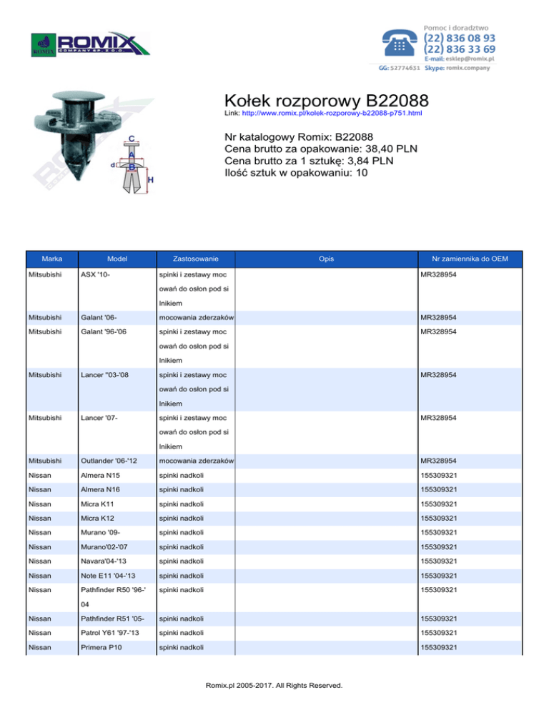 Kołek rozporowy B22088 Link: http://www.romix.pl/kolek-rozporowy-b22088-p751.html Nr katalogowy Romix: B22088 Cena brutto za opakowanie: 38,40 PLN Cena brutto za 1 sztukę: 3,84 PLN Ilość sztuk w opakowaniu: 10 Marka Mitsubishi Model ASX '10- Zastosowanie Opis spinki i zestawy moc Nr zamiennika do OEM MR328954 owań do osłon pod si lnikiem Mitsubishi Galant '06- mocowania zderzaków MR328954 Mitsubishi Galant '96-'06 spinki i zestawy moc MR328954 owań do osłon pod si lnikiem Mitsubishi Lancer ''03-'08 spinki i zestawy moc MR328954 owań do osłon pod si lnikiem Mitsubishi Lancer '07- spinki i zestawy moc MR328954 owań do osłon pod si lnikiem Mitsubishi Outlander '06-'12 mocowania zderzaków MR328954 Nissan Almera N15 spinki nadkoli 155309321 Nissan Almera N16 spinki nadkoli 155309321 Nissan Micra K11 spinki nadkoli 155309321 Nissan Micra K12 spinki nadkoli 155309321 Nissan Murano '09- spinki nadkoli 155309321 Nissan Murano'02-'07 spinki nadkoli 155309321 Nissan Navara'04-'13 spinki nadkoli 155309321 Nissan Note E11 '04-'13 spinki nadkoli 155309321 Nissan Pathfinder R50 '96-' spinki nadkoli 155309321 04 Nissan Pathfinder R51 '05- spinki nadkoli 155309321 Nissan Patrol Y61 '97-'13 spinki nadkoli 155309321 Nissan Primera P10 spinki nadkoli 155309321 Romix.pl 2005-2017. All Rights Reserved. Nissan Primera P11 spinki nadkoli 155309321 Nissan Primera P12 spinki nadkoli 155309321 Nissan Qashqai '07-'13 spinki nadkoli 155309321 Nissan Sunny'95-'98 spinki nadkoli 155309321 Nissan Terrano II'93-'03 spinki nadkoli 155309321 Nissan X-trail '01-'07 spinki nadkoli 155309321 Nissan X-trail '07- spinki nadkoli 155309321 Romix.pl 2005-2017. All Rights Reserved.