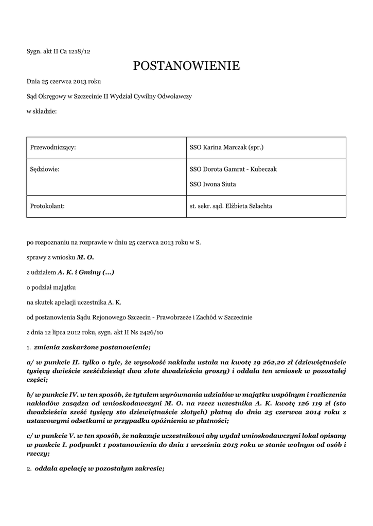 Sygn. akt II Ca 1218/12 POSTANOWIENIE Dnia 25 czerwca 2013 roku Sąd Okręgowy w Szczecinie II Wydział Cywilny Odwoławczy w składzie: Przewodniczący: SSO Karina Marczak (spr.) Sędziowie: SSO Dorota Gamrat - Kubeczak SSO Iwona Siuta Protokolant: st. sekr. sąd. Elżbieta Szlachta po rozpoznaniu na rozprawie w dniu 25 czerwca 2013 roku w S. sprawy z wniosku M. O. z udziałem A. K. i Gminy (...) o podział majątku na skutek apelacji uczestnika A. K. od postanowienia Sądu Rejonowego Szczecin - Prawobrzeże i Zachód w Szczecinie z dnia 12 lipca 2012 roku, sygn. akt II Ns 2426/10 1. zmienia zaskarżone postanowienie; a/ w punkcie II. tylko o tyle, że wysokość nakładu ustala na kwotę 19 262,20 zł (dziewiętnaście tysięcy dwieście sześćdziesiąt dwa złote dwadzieścia groszy) i oddala ten wniosek w pozostałej części; b/ w punkcie IV. w ten sposób, że tytułem wyrównania udziałów w majątku wspólnym i rozliczenia nakładów zasądza od wnioskodawczyni M. O. na rzecz uczestnika A. K. kwotę 126 119 zł (sto dwadzieścia sześć tysięcy sto dziewiętnaście złotych) płatną do dnia 25 czerwca 2014 roku z ustawowymi odsetkami w przypadku opóźnienia w płatności; c/ w punkcie V. w ten sposób, że nakazuje uczestnikowi aby wydał wnioskodawczyni lokal opisany w punkcie I. podpunkt 1 postanowienia do dnia 1 września 2013 roku w stanie wolnym od osób i rzeczy; 2. oddala apelację w pozostałym zakresie; 3. ustala, że każdy z uczestniów ponosi koszty postępowania przed Sądem drugiej instancji związane ze swym udziałem w sprawie. Sygn. akt II Ca 1218/12 UZASADNIENIE Postanowieniem z dnia 12 lipca 2012 r. Sąd Rejonowy Szczecin – Prawobrzeże i Zachód w Szczecinie: I ustalił, że w skład majątku wspólnego stron M. O. i A. K. wchodzą następujące składniki: 1. spółdzielcze własnościowe prawo do lokalu mieszkalnego położonego w S. przy ul. (...) znajdujące się w zasobach Spółdzielni Mieszkaniowej (...) w S. wraz z wkładem budowlanym o wartości 274 000 zł, 2. telewizor plazmowy P. model (...) o wartości 2 000 zł, 3. zestaw kina domowego N. o wartości 300 zł, 4. nagrywarka dvd (...) o wartości 100 zł, 5. receiver dvd (...) o wartości 100 zł (pkt I) II ustalił, że wnioskodawczyni M. O. poniosła z majątku osobistego na majątek wspólny nakłady w kwocie 246 000 zł; III podzielił majątek wspólny M. O. i A. K. w ten sposób, że składnik majątkowy opisany w punkcie 1 przyznał na wyłączną własność wnioskodawczyni M. O., zaś składniki majątkowe opisane w punktach 2-5 przyznał na wyłączną własność uczestnikowi A. K.; IV tytułem wyrównania udziałów w majątku wspólnym i rozliczenia nakładów zasądził od wnioskodawczyni M. O. na rzecz uczestnika A. K. kwotę 12 750 zł płatną w terminie 1 miesiąca od uprawdopodobnienia się niniejszego postanowienia z ustawowymi odsetkami w przypadku opóźnienia w płatności; V nakazał uczestnikowi wydać na rzecz wnioskodawczyni lokal opisany w punkcie 1 w terminie 6 miesięcy od uprawomocnienia się postanowienia w stanie wolnym od osób i rzeczy; VI ustalił, iż uczestnikowi A. K. nie przysługuje uprawnienia do otrzymania lokalu socjalnego; VII nakazał wnioskodawczyni wydać na rzecz uczestnika A. K. rzeczy ruchome opisane w punkcie 2-5 terminie 6 miesięcy od uprawomocnienia się postanowienia; VIII oddalił wniosek w pozostałym zakresie; IX przyznał biegłej z zakresu wyceny nieruchomości wynagrodzenie w kwocie 1724,26 zł, w tym należny podatek VAT; X nakazał pobrać na rzecz Skarbu Państwa Sadu Rejonowego Szczecin – Prawobrzeże i Zachód w Szczecinie od wnioskodawczyni M. O. i uczestnika A. K. kwoty po 872, 55 zł tytułem nieuiszczonych kosztów sądowych; XI postanowił, iż koszty postępowania każda ze stron ponowi we własnym zakresie. Powyższe rozstrzygnięcie Sąd Rejonowy oparł o następujący stan faktyczny: M. O. i A. K. zawarli związek małżeński w dniu 26 stycznia 1991r. Małżonkowie początkowo mieszkali w lokalu komunalnym zajmowanym wcześniej przez babcię A. k. przy ul. (...) w S.. Mieszkanie to było zawilgocone i niedogrzane, w związku z czym małoletnia córka stron często chorowała. W tym okresie między małżonkami dochodziło do częstych kłótni, raz zdarzyło się, że w trakcie awantury A. K. uderzył żonę, która wyprowadziła się po tym na krótko do swojej matki. A. K. zwrócił się do Gminy (...) o przydzielenie rodzinie jeszcze jednego pokoju celem poprawy warunków bytowych, jednakże ostatecznie do przyłączenia pomieszczenia nie doszło. Matka M. O. – A. Z. (1)chcąc poprawić warunki bytowe rodziny córki zaproponowała małżonkom, iż kupi bliźniaka, w którym wszyscy razem zamieszkają. A. K. nie zgodził się na to oświadczając, że ma własne mieszkanie, czym obraził teściową. W tej sytuacji A. Z. (1) postanowiła kupić mieszkanie wyłącznie dla córki i w tym celu, pod wpływem zachęty wspólnika K. K. (1), wpłaciła w trzech ratach wkład mieszkaniowy do Spółdzielni Mieszkaniowej w (...) na nazwisko M. K.. Sąd ustalił, iż część środków pochodziła także z likwidacji książeczki mieszkaniowej (...) na nazwisko M. K., na którą wszystkie wpłaty wnosiła A. Z. (1) przed zawarciem małżeństwa przez córkę i uczestnika. W dniu 19 lutego 1996 r. nastąpił przydział spółdzielczego własnościowego prawa do lokalu mieszkalnego położonego w S. przy ul. (...) na rzecz M. K.. W dniu 12 sierpnia 1997 r. Spółdzielnia Mieszkaniowa przeprowadziła ostateczne rozliczenie inwestycji, w wyniku której okazało się, że konieczna była dopłata do wkładu w kwocie 83,46 zł, którą uiściła M. K. z bieżących dochodów małżonków. Małżonkowie zamieszkaniu w lokalu przy ul. (...) w S. w maju 1996 r. Z uwagi na fakt, że mieszkanie zostało przydzielone w stanie surowym należało wykonać prace wykończeniowe. Prace te wykonał A. K. na przestrzeni lat 1996-2007, przy 