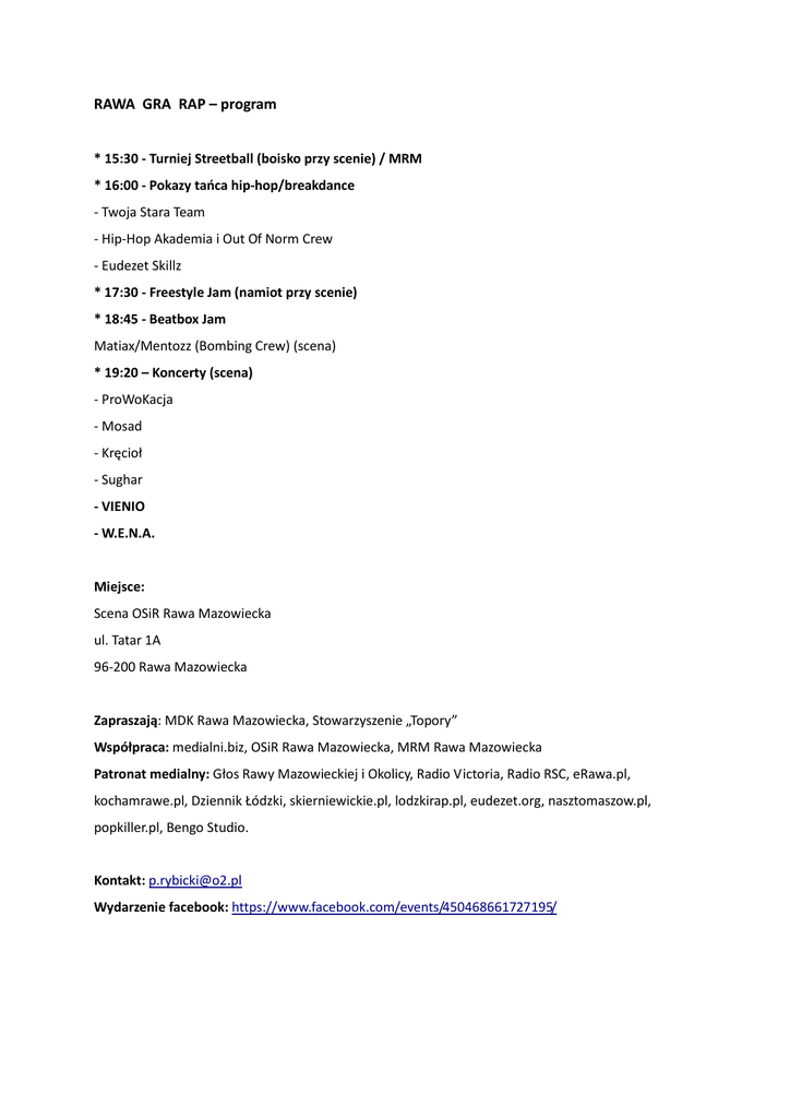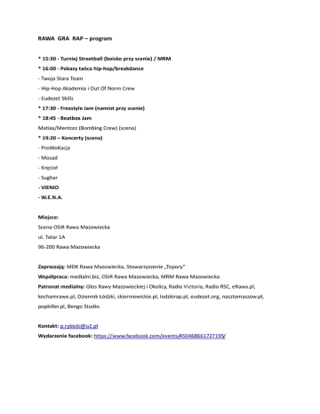 RAWA GRA RAP – program * 15:30 - Turniej Streetball (boisko przy scenie) / MRM * 16:00 - Pokazy tańca hip-hop/breakdance - Twoja Stara Team - Hip-Hop Akademia i Out Of Norm Crew - Eudezet Skillz * 17:30 - Freestyle Jam (namiot przy scenie) * 18:45 - Beatbox Jam Matiax/Mentozz (Bombing Crew) (scena) * 19:20 – Koncerty (scena) - ProWoKacja - Mosad - Kręcioł - Sughar - VIENIO - W.E.N.A. Miejsce: Scena OSiR Rawa Mazowiecka ul. Tatar 1A 96-200 Rawa Mazowiecka Zapraszają: MDK Rawa Mazowiecka, Stowarzyszenie „Topory” Współpraca: medialni.biz, OSiR Rawa Mazowiecka, MRM Rawa Mazowiecka Patronat medialny: Głos Rawy Mazowieckiej i Okolicy, Radio Victoria, Radio RSC, eRawa.pl, kochamrawe.pl, Dziennik Łódzki, skierniewickie.pl, lodzkirap.pl, eudezet.org, nasztomaszow.pl, popkiller.pl, Bengo Studio. Kontakt: [email protected] Wydarzenie facebook: https://www.facebook.com/events/450468661727195/