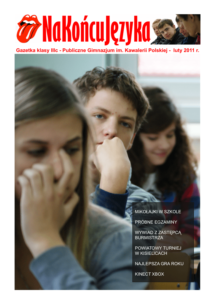 NaKońcuJęzyka Gazetka klasy IIIc Publiczne Gimnazjum im. Kawalerii Polskiej luty 2011 r. MIKOŁAJKI W SZKOLE PRÓBNE EGZAMINY WYWIAD Z ZASTĘPCĄ BURMISTRZA POWIATOWY TURNIEJ W KISIELICACH NAJLEPSZA GRA ROKU KINECT XBOX 2 NaKońcuJęzyka AKTUALNOŚCI luty 2011 r. Konkursy „13 grudzień – Pamiętamy” naszym gimnazjum odbyły się konkursy przedmiotowe organizowane przez Warmińsko - Mazurskiego Kuratora Oświaty, w których to sił spróbowali uczniowie szkoły najlepsi w danych dziedzinach. Wyniki są bardzo znaczące, ponieważ aż z 6 przedmiotów do etapu wojewódzkiego zakwalifikowało się 8 naszych koleżanek i kolegów. Paweł Filipowicz (III c) zakwalifikował się z 3 przedmiotów(!) (konkurs z fizyki i astronomii, matematyki i geografii), co jest bardzo wysokim osiągnięciem. Wszystkim uczestnikom serdecznie gratulujemy i życzymy powodzenia w dalszych etapach konkursów!■ dniu 1 3 grudnia 201 0 r. grupa ,,5 Brygada” w naszym gimnazjum przeprowadziła akcję ,,1 3 grudnia – Pamiętamy” ,z okazji 29. rocznicy wprowadzenia w Polsce stanu wojennego. Na korytarzu zaaranżowano charakterystyczne wnętrze mieszkania z mnóstwem „gadżetów” typowych dla tego okresu takich jak pralka frania czy telefon na korbkę. Niedaleko mieścił się sztab kryzysowy PZPR ze stanowiskiem przy którym po W W Turniej siatkarski w gimazjum W dniu 21 grudnia w naszej szkole odbył się świąteczny turniej siatkówki zorganizowany przez pana Zbigniewa Sarnowskiego . Udział w nim wzięły 3 drużyny dziewcząt i 5 drużyn chłopców z Susza i okolic. Mecze rozgrywane były w systemie ,,każdy z każdym”. Wszyscy zawzięcie walczyli o zwycięstwo,ale najważniejsze było to, żeby się świetnie bawić . Podczas meczów miłą niespodziankę uczestnikom turnieju zrobili Święci Mikołajowie, którzy częstowali wszystkich słodyczami. Na koniec turnieju p. poprawnej odpowiedzi na pytanie można było dostać kartkę na zupę i bułkę z usytuowanego obok baru szybkiej obsługi ze znikomym asortymentem – był to symboliczny odpowiednik reglamentacji żywności jaka obowiązywała w tamtym czasie. Tłem do tej niezwykłej ekspozycji była muzyka z lat 80., która oddawała atmosferę tamtych lat. Dzięki tej akcji uczniowie naszego gimnazjum mogli dotknąć historii.■ Janina Kaniecka - Dyrektor szkoły ,wręczyła statuetki i dyplomy dla najlepszych drużyn i zawodników .W klasyfikacji końcowej Dziewczęta naszego gimnazjum zajęły drugie miejsce,a chłopcy pierwsze miejsce! Gratulujemy i życzymy wytrwałości i sukcesów w dalszej karierze zawodniczej! ■ luty 2011 r. NaKońcuJęzyka AKTUALNOŚCI 3 Mikołajki 6 grudnia - ten dzień wszyscy kojarzą jednym wydarzeniem…Mikołajki! Tak, tak w naszej szkole także obchodziliśmy to ,,wielkie święto”. wszystkich, którzy rano lubią znajdować w butach różne różności. Po klasach chodził nie kto inny jak sam święty Mikołaj razem ze swoimi śnieżynkami w poszukiwaniu tych grzecznych i trochę mniej grzecznych uczniów, rozdawał cukierki i inne słodkości… wszystko byłoby pewnie pięknie gdyby nie pewien fakt. Żeby zasłużyć na łakocie trzeba było zaśpiewać jakąś kolędę (ewentualnie powiedzieć wierszyk)! Gdy uczniowie się o tym dowiedzieli objęła ich wszechstronna panika! No, bo co zrobić ze stresem i wsty- dem?! Na szczęście dla Mikołaja czasem znalazł się jakiś śmiałek, który schował wstyd do kieszeni i z purpurą na twarzy zasłużył na cukierka! Są to nasi szkolni bohaterowie, bo dzięki nim święty Mikołaj mógł ze spokojem wrócić do Laponii!■ Próbne egzaminy gimnazjalne W połowie grudnia ubiegłego roku odbyły się próbne egzaminy klas trzecich. 3 dni intensywnego myślenia i wysilania swej pamięci mogły poważnie rzutować na psychikę wrażliwych na stres uczniów. Do jednych dotarło, że muszą się w końcu wziąć za naukę, bo to już nie przelewki, inni z kolei nabrali pewności siebie i uwierzyli w swoje możliwości. Byli pewnie i tacy, którzy utwierdzili się w przekonaniu, że są absolutnie genialni! Ostatnia grupa z pewnością była najliczniejsza... W końcu nie na darmo siedzimy w szkole, prawda? Pomarzyć sobie można, a wyniki powoli do nas docierają i dla niektórych są jak zimny prysznic. Pierwszy semestr już za nami, to ostatni dzwonek, by nadrobić swoje ewentualne zaległości. Zatem - korzystajmy z relaksu w czasie ferii zimowych a potem bierzmy się porządnie za naukę... Pora obudzić się ze snu zimowego. Ku lepszej przyszłości. Piękna idea. I całkiem prawdopodobna.■ Oprac. działu: Sylwia Kowalska, Adriana Stawska 4 NaKońcuJęzyka KĄCIK KULTURALNY luty 2011 r. Wywiad z zastępcą burmistrza Zdzisławem Zdzichowskim Rozmowę przeprowadzili Paweł Filipowicz i Damian Ostrowski Od kiedy zajmuje się pan sprawowaniem urzędu? Jak pan zaczynał swoją przygodę z polityką? 6 grudnia powołano mnie na stanowisko asystenta z obowiązkami Zastępcy Burmistrza. Politykiem zgodnie z encyklopedyczną formułą nie jestem, gdyż nie należę do żadnej partii politycznej, ale politykiem lokalnym owszem. Sprawy gminy i procesów, jakie w niej zachodzą, zawsze mnie interesowały. I wtedy, kiedy przez 1 7 lat byłem kierownikiem Ośrodka Pomocy Społecznej i obecnie. W poprzednim roku, który był rokiem wyborczym do samorządów, zaangażowanie moje znacznie wzrosło, zostałem wybrany pełnomocnikiem Komitetu Wyborczego, którego kandydatem na burmistrza był Krzysztof Pietrzykowski, obecny burmistrz. Ten wybór burmistrza daje możliwości nowej realizacji zadań gminy, nowych zmian zachodzących w gminie i innego punktu widzenia i funkcjonowania. Co zamierza pan zrobić w obecnej kadencji dla naszego gimnazjum? Sprawy oświaty są głównym obowiązkiem mojego zakresu czynności oraz główną troską. Gimnazjum jest jedną z placówek gminy Susz, które oczekują na pozytywne zmiany. Taką zmianą będzie lokalizacja boiska spor