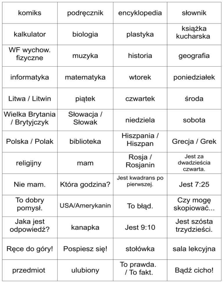 komiks podręcznik encyklopedia słownik kalkulator biologia plastyka książka kucharska WF wychow. fizyczne muzyka historia geografia informatyka matematyka wtorek poniedziałek Litwa / Litwin piątek czwartek środa Wielka Brytania / Brytyjczyk Słowacja / Słowak niedziela sobota biblioteka Hiszpania / Hiszpan Grecja / Grek mam Rosja / Rosjanin Jest za dwadzieścia czwarta. Która godzina? Jest kwadrans po pierwszej. Jest 7:25 To błąd. Czy mogę skopiować... Polska / Polak religijny Nie mam. To dobry pomysł. USA/Amerykanin Jaka jest odpowiedź? kanapka Jest 9:10 Jest szósta trzydzieści. Ręce do góry! Pospiesz się! stołówka sala lekcyjna ulubiony To prawda. / To fakt. Bądź cicho! przedmiot