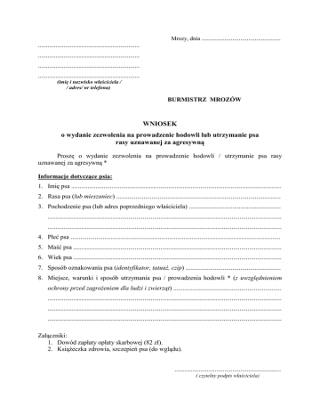 Mrozy, dnia ................................................. ............................................................... ............................................................... ............................................................... ............................................................... (imię i nazwisko właściciela / / adres/ nr telefonu) BURMISTRZ MROZÓW WNIOSEK o wydanie zezwolenia na prowadzenie hodowli lub utrzymanie psa rasy uznawanej za agresywną Proszę o wydanie zezwolenia na prowadzenie hodowli / utrzymanie psa rasy uznawanej za agresywną * Informacje dotyczące psia: 1. Imię psa .................................................................................................................................. 2. Rasa psa (lub mieszaniec) ...................................................................................................... 3. Pochodzenie psa (lub adres poprzedniego właściciela) ......................................................... ................................................................................................................................................. ................................................................................................................................................. 4. Płeć psa .................................................................................................................................. 5. Maść psa ................................................................................................................................. 6. Wiek psa ................................................................................................................................. 7. Sposób oznakowania psa (identyfikator, tatuaŜ, czip) ........................................................... 8. Miejsce, warunki i sposób utrzymania psa / prowadzenia hodowli * (z uwzględnieniem ochrony przed zagroŜeniem dla ludzi i zwierząt) ................................................................... ................................................................................................................................................. ................................................................................................................................................. ................................................................................................................................................. Załączniki: 1. Dowód zapłaty opłaty skarbowej (82 zł). 2. KsiąŜeczka zdrowia, szczepień psa (do wglądu). .................................................................. ( czytelny podpis właściciela) Pouczenie: 1. Utrzymywanie psa rasy uznanej za agresywną zgodnie z art. 10 ustawy z dnia 21 sierpnia 1997 roku o ochronie zwierząt (tj. Dz. U. 2013 r., poz. 856) wymaga zezwolenia wydanego przez Burmistrza właściwego ze względu na utrzymywanie psa, na wniosek osoby utrzymującej takiego zwierzaka. 2. Wydanie zezwolenia podlega opłacie skarbowej w wysokości 82,00 zł (część IV ust. 44, pkt. 2 załącznika do ustawy z dnia 16 listopada 2006 roku o opłacie skarbowej – Dz. U. 2012 r., poz. 1282 z późn. zm.). 3. Zgodnie z rozporządzeniem Ministra Spraw Wewnętrznych i Administracji z dnia 28 kwietnia 2003 roku w sprawie wykazu ras psów uznanych za agresywne (Dz. U. 2003r., Nr 77, poz. 687) za agresywne uznaje się psy rasy: a. amerykański pit bull terrier; b. pies z Majorki (Perro de Presa Mallorquin); c. buldog amerykański; d. dog argentyński; e. pies kanaryjski (Perro de Presa Canario); f. tosa inu; g. rottweiler; h. akbash dog; i. anatolian karabash; j. moskiewski stróŜujący; k. owczarek kaukaski.