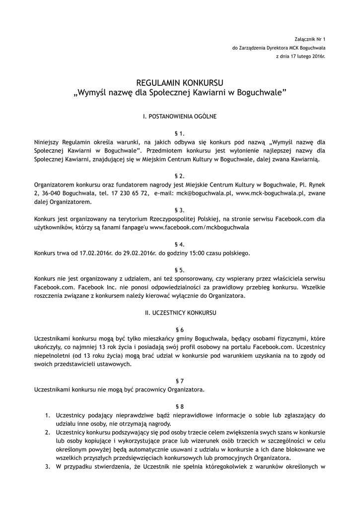 Załącznik Nr 1 do Zarządzenia Dyrektora MCK Boguchwała z dnia 17 lutego 2016r. REGULAMIN KONKURSU „Wymyśl nazwę dla Społecznej Kawiarni w Boguchwale” I. POSTANOWIENIA OGÓLNE § 1. Niniejszy Regulamin określa warunki, na jakich odbywa się konkurs pod nazwą „Wymyśl nazwę dla Społecznej Kawiarni w Boguchwale”. Przedmiotem konkursu jest wyłonienie najlepszej nazwy dla Społecznej Kawiarni, znajdującej się w Miejskim Centrum Kultury w Boguchwale, dalej zwana Kawiarnią. § 2. Organizatorem konkursu oraz fundatorem nagrody jest Miejskie Centrum Kultury w Boguchwale, Pl. Rynek 2, 36-040 Boguchwała, tel. 17 230 65 72, e-mail: [email protected], www.mck-boguchwala.pl, zwane dalej Organizatorem. § 3. Konkurs jest organizowany na terytorium Rzeczypospolitej Polskiej, na stronie serwisu Facebook.com dla użytkowników, którzy są fanami fanpage'u www.facebook.com/mckboguchwala § 4. Konkurs trwa od 17.02.2016r. do 29.02.2016r. do godziny 15:00 czasu polskiego. § 5. Konkurs nie jest organizowany z udziałem, ani też sponsorowany, czy wspierany przez właściciela serwisu Facebook.com. Facebook Inc. nie ponosi odpowiedzialności za prawidłowy przebieg konkursu. Wszelkie roszczenia związane z konkursem należy kierować wyłącznie do Organizatora. II. UCZESTNICY KONKURSU §6 Uczestnikami konkursu mogą być tylko mieszkańcy gminy Boguchwała, będący osobami fizycznymi, które ukończyły, co najmniej 13 rok życia i posiadają swój profil osobowy na portalu Facebook.com. Uczestnicy niepełnoletni (od 13 roku życia) mogą brać udział w konkursie pod warunkiem uzyskania na to zgody od swoich przedstawicieli ustawowych. §7 Uczestnikami konkursu nie mogą być pracownicy Organizatora. §8 1. Uczestnicy podający nieprawdziwe bądź nieprawidłowe informacje o sobie lub zgłaszający do udziału inne osoby, nie otrzymają nagrody. 2. Uczestnicy konkursu podszywający się pod osoby trzecie celem zwiększenia swych szans w konkursie lub osoby kopiujące i wykorzystujące prace lub wizerunek osób trzecich w szczególności w celu określonym powyżej będą automatycznie usuwani z udziału w konkursie a ich dane blokowane we wszelkich przyszłych przedsięwzięciach konkursowych lub promocyjnych Organizatora. 3. W przypadku stwierdzenia, że Uczestnik nie spełnia któregokolwiek z warunków określonych w niniejszym Regulaminie, zostanie wykluczony z konkursu i utraci ewentualne prawo do nagrody w konkursie. III. ZASADY I PRZEBIEG KONKURSU 1. 2. 3. 4. 5. 6. §9 Udział w konkursie jest bezpłatny i nieobowiązkowy. Szczegółowe informacje o zasadach udziału w konkursie i jego przebiegu, przekazuje się Uczestnikom w poście umieszczonym na fanpage’u www.facebook.com/mckboguchwala oraz w niniejszym Regulaminie. W celu wyłonienia Zwycięzcy konkursu oraz w celu zapewnienia prawidłowego przebiegu konkursu, Organizator powoła komisje konkursową (dalej „Komisja Konkursowa”) w 3 osobowym składzie. Komisja Konkursowa wyłoni Zwycięzcę konkursu spośród Uczestników konkursu, biorąc pod uwagę szereg kryteriów, m.in: popularność komentarza zgłoszeniowego, jego atrakcyjność i trafność propozycji nazwy Kawiarni wraz z uzasadnieniem, aktywność użytkownika na fanpage'u Organizatora, wiarygodność profilu, polecanie znajomym itd. Liczba polubień komentarza zgłoszeniowego nie zawsze decyduje o wygranej. Rozstrzygnięcie konkursu (opublikowanie wyników) nastąpi nie później niż 1.03.2016r. Wyniki konkursu oraz imię i nazwisko Zwycięzcy zostaną opublikowane w formie notatki na fanpage https://www.facebook.com/mckboguchwala i stronie www.mck-boguchwala.pl § 10 Aby przystąpić do konkursu należy: 1. mieć status fana na fanpage'u Miejskiego Centrum Kultury w Boguchwale (adres https://www.facebook.com/mckboguchwala); 2. zapoznać się z Regulaminem konkursu; 3. zamieścić komentarz pod postem konkursowym opublikowanym fanpage'u Miejskiego Centrum Kultury w Boguchwale z proponowaną nazwą Kawiarni, w terminie 17 – 29.02.2016r., do godz. 15:00. § 11 1. Każdy Uczestnik konkursu może zaproponować więcej niż jedną nazwę Kawiarni. Tylko jedna propozycja nazwy Kawiarni może się znajdować w jednym komentarzu zgłoszeniowym. Organizator nie bierze pod uwagę komentarza zgłoszeniowego zawierającego więcej niż jedną propozycję nazwy Kawiarni. 2. Propozycja nazwy Kawiarni: 1. powinna być wynikiem osobistej twórczości Uczestnika; 2. nie może zawierać wulgaryzmów, treści obraźliwych lub treści sprzecznych z prawem; 3. nie może zawierać treści reklamowych dotyczących jakichkolwiek podmiotów; 4. nie może naruszać praw osób trzecich, w tym w szczególności dóbr osobistych i praw autorskich. § 12 Wysyłając swoje zgłoszenie, Uczestnik oświadcza i potwierdza, że: 1. zgłoszona do konkursu propozycja nazwy Kawiarni jest jego pomysłem, i że przysługują mu autorskie prawa majątkowe i osobiste, w tym prawo do wysyłania jej na konkurs; 2. bierze na siebie pełną odpowiedzialność w przypadku, gdy osoba trzecia będzie sobie rościć prawa do propozycji nazwy. W przypadku skierowania przez osobę trzecią roszczeń związanych z przesłaną na konkurs propozycją nazwy, Uczestnik jest zobowiązany do naprawienia wynikłej z tego tytułu szkody. IV. NAGRODY § 13 1. W konkursie przewidziano 1 nagrodę: Dyplom oraz uroczystą kolację dla Zwycięzcy konkursu wraz z osobą towarzyszącą. 2. Organizator zastrzega sobie prawo do przyznania dodatkowych nagród lub wyróżnień. § 14 Organizator zastrzega, iż z chwilą wydania nagrody nabywa autorskie prawa majątkowe do zwycięskiej propozycji nazwy Kawiarni, na wszystkich znanych polach eksploatacji. § 15 1. Warunkiem otrzymania nagrody jest skontaktowanie się z Organizatorem poprzez wiadomość prywatną w serwisie Facebook i przesłanie danych osobowych z danymi potrzebnymi do odbioru nagrody (imię, nazwisko, adres korespondencyjny wraz z kodem pocztowym) w termini