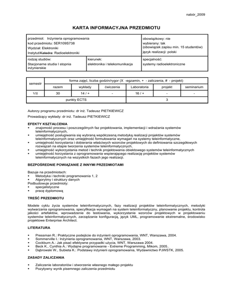 nabór_2009 KARTA INFORMACYJNA PRZEDMIOTU przedmiot: Inżynieria oprogramowania kod przedmiotu: 5ER109S738 Wydział: Elektroniki Instytut/Katedra: Radioelektroniki obowiązkowy: nie wybierany: tak (obowiązek zapisu min. 15 studentów) język realizacji: polski rodzaj studiów: Stacjonarne studia I stopnia inżynierskie specjalność: systemy radioelektroniczne semestr VII kierunek: elektronika i telekomunikacja forma zajęć, liczba godzin/rygor (X -egzamin, + - zaliczenia, # - projekt) razem wykłady ćwiczenia Laboratoria projekt seminarium 30 14 / + - 16 / + - - punkty ECTS 3 Autorzy programu przedmiotu: dr inż. Tadeusz PIETKIEWICZ Prowadzący wykłady: dr inż. Tadeusz PIETKIEWICZ EFEKTY KSZTAŁCENIA znajomość procesu i poszczególnych faz projektowania, implementacji i wdrażania systemów teleinformatycznych, umiejętność posługiwania się wybraną współczesną metodyką realizacji projektów systemów teleinformatycznych oraz umiejętność formułowania wymagań na systemy teleinformatyczne, umiejętność korzystania i dobierania właściwych wzorców projektowych do definiowania szczegółowych rozwiązań na etapie tworzenia systemów teleinformatycznych, umiejętność wykorzystania metod i technik projektowania obiektowego systemów teleinformatycznych umiejętność korzystania z oprogramowania wspierającego realizację projektów systemów teleinformatycznych na wszystkich fazach jego realizacji. BEZPOŚREDNIE POWIĄZANIE Z INNYMI PRZEDMIOTAMI Bazuje na przedmiotach: Metodyka i techniki programowania 1, 2 Algorytmy i struktury danych Podbudowuje przedmioty: specjalistyczne pracę dyplomową TREŚĆ PRZEDMIOTU Modele cyklu życia systemów teleinformatycznych, fazy realizacji projektów teleinformatycznych, metodyki wytwarzania oprogramowania, specyfikacja wymagań na system teleinformatyczny, planowanie projektu, kontrola jakości artefaktów, wprowadzenie do testowania, wykorzystanie wzorców projektowych w projektowaniu systemów teleinformatycznych, zarządzanie konfiguracją, język UML, programowanie ekstremalne, środowisko projektowe Enterprise Architect. LITERATURA Pressman R.: Praktyczne podejście do inżynierii oprogramowania, WNT, Warszawa, 2004. Sommerville I.: Inżynieria oprogramowania, WNT, Warszawa, 2003. Cockburn A.: Jak pisać efektywne przypadki użycia, WNT, Warszawa 2004. Beck K., Cynthia A.: Wydajne programowanie - Extreme Programming, Mikom, 2005.. Dąbrowski W., Subieta K.: Podstawy inżynierii oprogramowania, Wydawnictwo PJWSTK, 2005. ZASADY ZALICZANIA Zaliczenie laboratoriów i stworzenie własnego małego projektu Pozytywny wynik pisemnego zaliczenia przedmiotu