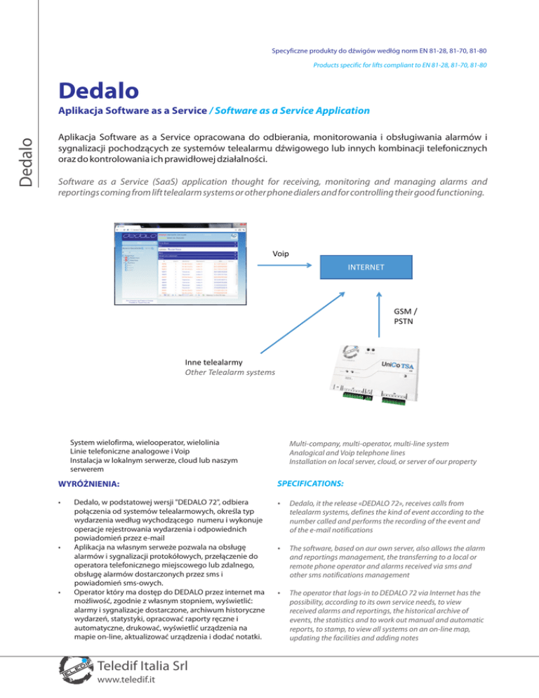 Specyficzne produkty do dŸwigów wed³óg norm EN 81-28, 81-70, 81-80 Products specific for lifts compliant to EN 81-28, 81-70, 81-80 Dedalo Dedalo Aplikacja Software as a Service / Software as a Service Application Aplikacja Software as a Service opracowana do odbierania, monitorowania i obs³ugiwania alarmów i sygnalizacji pochodz¹cych ze systemów telealarmu dŸwigowego lub innych kombinacji telefonicznych oraz do kontrolowania ich prawid³owej dzia³alnoœci. Software as a Service (SaaS) application thought for receiving, monitoring and managing alarms and reportings coming from lift telealarm systems or other phone dialers and for controlling their good functioning. Voip INTERNET GSM / PSTN Inne telealarmy Other Telealarm systems System wielofirma, wielooperator, wielolinia Linie telefoniczne analogowe i Voip Instalacja w lokalnym serwerze, cloud lub naszym serwerem Multi-company, multi-operator, multi-line system Analogical and Voip telephone lines Installation on local server, cloud, or server of our property WYRÓ¯NIENIA: SPECIFICATIONS: • ? Dedalo, it the release «DEDALO 72», receives calls from • • Dedalo, w podstatowej wersji "DEDALO 72", odbiera po³¹czenia od systemów telealarmowych, okreœla typ wydarzenia wed³ug wychodz¹cego numeru i wykonuje operacje rejestrowania wydarzenia i odpowiednich powiadomieñ przez e-mail Aplikacja na w³asnym serwe¿e pozwala na obs³ugê alarmów i sygnalizacji protokó³owych, prze³¹czenie do operatora telefonicznego miejscowego lub zdalnego, obs³ugê alarmów dostarczonych przez sms i powiadomieñ sms-owych. Operator który ma dostêp do DEDALO przez internet ma mo¿liwoœæ, zgodnie z w³asnym stopniem, wyœwietliæ: alarmy i sygnalizacje dostarczone, archiwum historyczne wydarzeñ, statystyki, opracowaæ raporty rêczne i automatyczne, drukowaæ, wyœwietliæ urz¹dzenia na mapie on-line, aktualizowaæ urz¹dzenia i dodaæ notatki. Teledif Italia Srl www.teledif.it telealarm systems, defines the kind of event according to the number called and performs the recording of the event and of the e-mail notifications ? The software, based on aur own server, also allows the alarm and reportings management, the transferring to a local or remote phone operator and alarms received via sms and other sms notifications management ? The operator that logs-in to DEDALO 72 via Internet has the possibility, according to its own service needs, to view received alarms and reportings, the historical archive of events, the statistics and to work out manual and automatic reports, to stamp, to view all systems on an on-line map, updating the facilities and adding notes