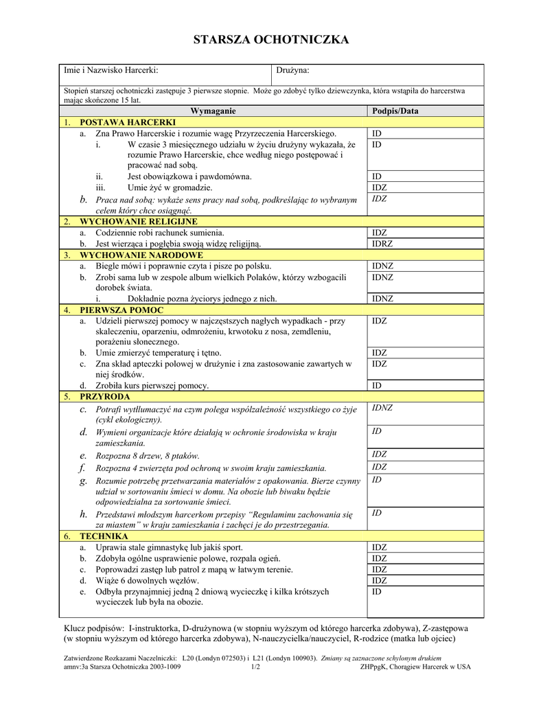 STARSZA OCHOTNICZKA Imie i Nazwisko Harcerki: Drużyna: Stopień starszej ochotniczki zastępuje 3 pierwsze stopnie. Może go zdobyć tylko dziewczynka, która wstąpiła do harcerstwa mając skończone 15 lat. 1. 2. 3. 4. 5. 6. Wymaganie POSTAWA HARCERKI a. Zna Prawo Harcerskie i rozumie wagę Przyrzeczenia Harcerskiego. i. W czasie 3 miesięcznego udziału w życiu drużyny wykazała, że rozumie Prawo Harcerskie, chce według niego postępować i pracować nad sobą. ii. Jest obowiązkowa i pawdomówna. iii. Umie żyć w gromadzie. b. Praca nad sobą: wykaże sens pracy nad sobą, podkreślając to wybranym celem który chce osiągnąć. WYCHOWANIE RELIGIJNE a. Codziennie robi rachunek sumienia. b. Jest wierząca i pogłębia swoją widzę religijną. WYCHOWANIE NARODOWE a. Biegle mówi i poprawnie czyta i pisze po polsku. b. Zrobi sama lub w zespole album wielkich Polaków, którzy wzbogacili dorobek świata. i. Dokładnie pozna życiorys jednego z nich. PIERWSZA POMOC a. Udzieli pierwszej pomocy w najczęstszych nagłych wypadkach - przy skaleczeniu, oparzeniu, odmrożeniu, krwotoku z nosa, zemdleniu, porażeniu słonecznego. b. Umie zmierzyć temperaturę i tętno. c. Zna skład apteczki polowej w drużynie i zna zastosowanie zawartych w niej środków. d. Zrobiła kurs pierwszej pomocy. PRZYRODA c. Potrafi wytłlumaczyć na czym polega wspólzależność wszystkiego co żyje (cykl ekologiczny). d. Wymieni organizacje które działają w ochronie środowiska w kraju zamieszkania. e. Rozpozna 8 drzew, 8 ptaków. f. Rozpozna 4 zwierzęta pod ochroną w swoim kraju zamieszkania. g. Rozumie potrzebę przetwarzania materiałów z opakowania. Bierze czynny udział w sortowaniu śmieci w domu. Na obozie lub biwaku będzie odpowiedzialna za sortowanie śmieci. h. Przedstawi młodszym harcerkom przepisy “Regulaminu zachowania się za miastem” w kraju zamieszkania i zachęci je do przestrzegania. TECHNIKA a. Uprawia stale gimnastykę lub jakiś sport. b. Zdobyła ogólne usprawienie polowe, rozpala ogień. c. Poprowadzi zastęp lub patrol z mapą w łatwym terenie. d. Wiąże 6 dowolnych węzłów. e. Odbyła przynajmniej jedną 2 dniową wycieczkę i kilka krótszych wycieczek lub była na obozie. Podpis/Data ID ID ID IDZ IDZ IDZ IDRZ IDNZ IDNZ IDNZ IDZ IDZ IDZ ID IDNZ ID IDZ IDZ ID ID IDZ IDZ IDZ IDZ ID Klucz podpisów: I-instruktorka, D-drużynowa (w stopniu wyższym od którego harcerka zdobywa), Z-zastępowa (w stopniu wyższym od którego harcerka zdobywa), N-nauczycielka/nauczyciel, R-rodzice (matka lub ojciec) Zatwierdzone Rozkazami Naczelniczki: L20 (Londyn 072503) i L21 (Londyn 100903). Zmiany są zaznaczone schylonym drukiem amnv:3a Starsza Ochotniczka 2003-1009 1/2 ZHPpgK, Chorągiew Harcerek w USA STARSZA OCHOTNICZKA Imie i Nazwisko Harcerki: Drużyna: Stopień starszej ochotniczki zastępuje 3 pierwsze stopnie. Może go zdobyć tylko dziewczynka, która wstąpiła do harcerstwa mając skończone 15 lat. Wymaganie GOSPODARCZO-DOMOWE a. Wykaże w domu swoim lub swojej rodziny, że umie utrzymać porządek; i. mieszkaniu nadać wygląd estetyczny, ii. naprawić lub uszyć ubranie, iii. przygotować posiłki codziennie ze świeżych produktów. 8. ZARADNOŚĆ a. Wie jak się zachować podczas wypadku domowego i wie gdzie w domu odłączyć gaz, wodę, elektryczność. i. Potrafi dać wskazówki, jak dojechać do danego miejsca. 9. UMIEJĘNOŚĆ WYSŁAWIANIA SIĘ a. Zabierze głos w dyskusji. i. Napisze artykuł do kroniki drużyny lub pisma harcerskiego. 10. WIADOMOŚCI HARCERSKIE a. Wykaże, że zdobyła samodzielnie podstawowe wiadomości z historii harcerstwa i skautingu. 11. SPRAWNOŚCI WYMAGANE DO STOPNIA i. „Miłośniczka Ziemi Ojczystej III” j. jedną polową (np. „Lekka Stopa”, „Piechur”) k. jedną gospodarczą (np. „Kucharka”, „Cukierniczka”) l. jedną sprawność do wyboru Uwagi/Notatki: Podpis/Data 7. Podpis harcerki IR IR IDRZ IDRZ IDRZ IDRZ IDNZ IDZ ID ID ID ID ID Podpis instruktorki przeprowadzającej próbę Data przyznania Klucz podpisów: I-instruktorka, D-drużynowa (w stopniu wyższym od którego harcerka zdobywa), Z-zastępowa (w stopniu wyższym od którego harcerka zdobywa), N-nauczycielka/nauczyciel, R-rodzice (matka lub ojciec) Zatwierdzone Rozkazami Naczelniczki: L20 (Londyn 072503) i L21 (Londyn 100903). Zmiany są zaznaczone schylonym drukiem amnv:3a Starsza Ochotniczka 2003-1009 2/2 ZHPpgK, Chorągiew Harcerek w USA