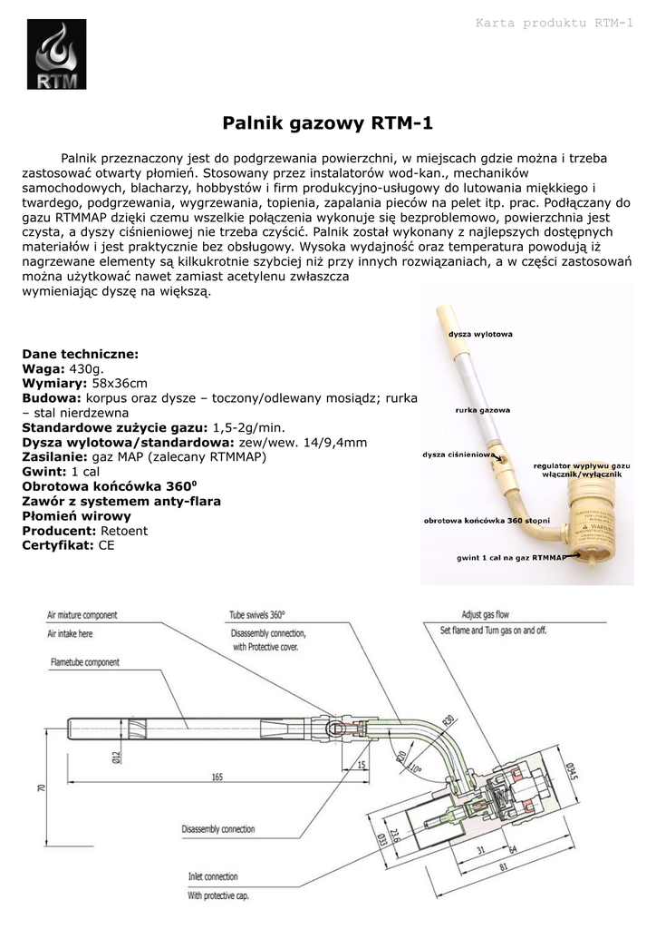 Karta produktu RTM-1 Palnik gazowy RTM-1 Palnik przeznaczony jest do podgrzewania powierzchni, w miejscach gdzie można i trzeba zastosować otwarty płomień. Stosowany przez instalatorów wod-kan., mechaników samochodowych, blacharzy, hobbystów i firm produkcyjno-usługowy do lutowania miękkiego i twardego, podgrzewania, wygrzewania, topienia, zapalania pieców na pelet itp. prac. Podłączany do gazu RTMMAP dzięki czemu wszelkie połączenia wykonuje się bezproblemowo, powierzchnia jest czysta, a dyszy ciśnieniowej nie trzeba czyścić. Palnik został wykonany z najlepszych dostępnych materiałów i jest praktycznie bez obsługowy. Wysoka wydajność oraz temperatura powodują iż nagrzewane elementy są kilkukrotnie szybciej niż przy innych rozwiązaniach, a w części zastosowań można użytkować nawet zamiast acetylenu zwłaszcza wymieniając dyszę na większą. Dane techniczne: Waga: 430g. Wymiary: 58x36cm Budowa: korpus oraz dysze – toczony/odlewany mosiądz; rurka – stal nierdzewna Standardowe zużycie gazu: 1,5-2g/min. Dysza wylotowa/standardowa: zew/wew. 14/9,4mm Zasilanie: gaz MAP (zalecany RTMMAP) Gwint: 1 cal Obrotowa końcówka 3600 Zawór z systemem anty-flara Płomień wirowy Producent: Retoent Certyfikat: CE