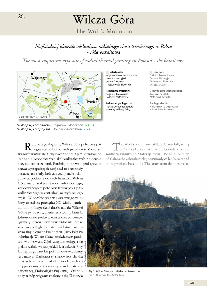 Wilcza Góra 26. The Wolf ’s Mountain Najbardziej okazałe odsłonięcie radialnego ciosu termicznego w Polsce – róża bazaltowa The most impressive exposure of radial thermal jointing in Poland – the basalt rose Wojcieszyn Złotoryja Prusice GPS: 51°06'18.83"N 15°54'52.69"E Wilków Lokalizacja: województwo dolnośląskie powiat złotoryjski gmina Złotoryja miejscowość Złotoryja Location: District: Lower Silesia County: Złotoryja Commune: Złotoryja Village: Złotoryja Region geograficzny: Pogórze Kaczawskie Pogórze Złotoryjskie Geographical regionalization: Kaczawa Foothills Złotoryja Foothills Jednostka geologiczna: niecka północnosudecka bazanity Wilczej Góry Geological unit: North-sudetic Depression Wilcza Góra Basanites 2km 1mile Waloryzacja poznawcza | Cognitive valorization: Waloryzacja turystyczna | Tourism valorization: R T photo Danuta Ilcewicz-Stefaniuk ezerwat geologiczny Wilcza Góra położony jest he Wolf's Mountain (Wilcza Góra) hill, rising 367 m a.s.l., is situated at the boundary of the na granicy południowych przedmieść Złotoryi. Wzgórze wznosi się na wysokość 367 m n.p.m. Zbudowane southern suburbs of Złotoryja town. The hill is built up jest ono z kenozoicznych skał wulkanicznych potocznie of Cainozoic volcanic rocks, commonly called basalts and nazywanych bazaltami. Bardziej poprawna geologicznie more precisely basaltoids. The latter term denotes rocks, nazwa występujących tutaj skał to bazaltoidy oznaczająca skały, których cechy makroskopowe są podobne do cech bazaltów. Wilcza Góra ma charakter stożka wulkanicznego, zbudowanego z potoków lawowych i pnia wulkanicznego w centralnej, najwyższej jego części. W obrębie pnia wulkanicznego założony został na początku XX wieku kamieniołom, którego działalność nadała Wilczej Górze jej obecny, charakterystyczny kształt. Jednostronnie podcięte wzniesienie porośnięte „grzywą” drzew i krzewów widoczne jest ze znacznej odległości i stanowi łatwo rozpoznawalny element krajobrazu. Jako lokalna kulminacja Wilcza Góra jest świetnym punktem widokowym. Z jej szczytu rozciągają się piękne widoki we wszystkich kierunkach. Przy ładnej pogodzie ku południowi widoczny jest masyw Karkonoszy stanowiący tło dla bliższych Gór Kaczawskich. Ozdobą zachodniej panoramy jest spiczasty stożek Ostrzycy nazywanej „Dolnośląską Fuji-jamą”. Od półFig. 1. Wilcza Góra - wyrobisko kamieniołomu Fig. 1. Quarry in the Wolfs’ Mtn. nocy, u stóp wzgórza rozłożyła się Złotoryja | 143 Fig. 2. Róża bazaltowa Fig. 2. The basalt rose formy skalnej w 1959 roku utworzono rezerwat przyrody „Wilcza Góra”. Powierzchnia rezerwatu wynosi 1,9 ha i obejmuje część szczytową wzgórza, łącznie ze ścianą kamieniołomu, na której odsłania się „róża bazaltowa”. Na terenie rezerwatu chroniona jest także unikalna roślinność naskalna i ciepłolubna. Bazaltoidy z Wilczej Góry charakteryzują się barwą czarną na świeżym przełamie i ciemno szarą na powierzchniach zwietrzałych. Na podstawie analizy mikroskopowej składu mineralnego skały te oznaczono jako bazanity, tj. skały makroskopowo podobne do bazaltów ale zawierające ubogie w krzemionkę (SiO2 ) minerały z grupy skaleniowców. Obecność skaleniowców kwalifikuje je jako skały zasadowe. Bazanity z Wilczej Góry charakteryzują się teksturą afanitową lub porfirową z drobnymi, trudno dostrzegalnymi gołym okiem, fenokryształami oliwinów i klinopiroksenów. W cieście skalnym mikroskopowo rozpoznane zostały: oliwiny, klinopirokseny, skalenie wapniowe (bytownit, labrador) i skaleniowce (nefelin). W skale macierzystej licznie występują porwaki (ksenolity), czyli fragmenty skał starszych porwane przez przemieszczającą 144 | photo Danuta Ilcewicz-Stefaniuk whose macroscopically identifiable properties resemble those of basalts. This hill represents a volcanic cone composed of lava flows and a volcanic neck placed in its central, uppermost part. At the beginning of the 20th century, within this neck, a quarry was established and its activity led to the present-day characteristic shape of Wilcza Góra. One-side undermined hill overgrown with trees and bushes is easily visible from a distance and marks an identifiable landscape element being, thereby, a perfect scenic point. One can admire a 360-degrees-wide panoramic view from the top of the hill. Looking south during good weather, the Karkonosze Mts. massif is visible providing a background for the more closely situated Kaczawa Mts. The western panoramic view, in turn, is dominated by the sharp cone of the Ostrzyca Mt., called „Lower Silesian Fuji-yama”. Placed to the north, at the foot of the hill, Złotoryja town with its charming old centre is located. A view to the east is photo Danuta Ilcewicz-Stefaniuk z urokliwym zabytkowym centrum. Widok od wschodu zamykają wyniosłe wzgórza ofiolitowego masywu Ślęży. Wyrobiska kamieniołomu odsłoniły inną, charakterystyczną dla wewnętrznej budowy kompleksów bazaltoidowych cechę, tj. znakomicie wykształcony system spękań, tzw. ciosu termicznego dzielących skałę na głównie sześciokątne słupy, układające się dłuższymi osiami prostopadle do powierzchni postępującego ochładzania. W zależności od lokalnych warunków i kształtu kompleksów lawowych, słupy bazaltoidowe układają się w pionowe lub prawie pionowe bariery (organy) lub przyjmują kształt wachlarzowy. W obrębie pni wulkanicznych słupy zbiegają się niekiedy radialnie do owalnej strefy centralnej tworząc tzw. „róże bazaltowe” zwane też „kamiennymi słońcami”. Jeden z najpiękniejszych przykładów takiej „róży bazaltowej” odsłonięty został w zachodniej ścianie kamieniołomu, w pobliżu szczytu wzgórza. Dla ochrony tej unikatowej Fig. 3. Słupy bazaltowe Fig. 3. Basalt columns closed by high-rising hills of the Ślęża Mt. ophiolitic massif. The quarry walls expose an