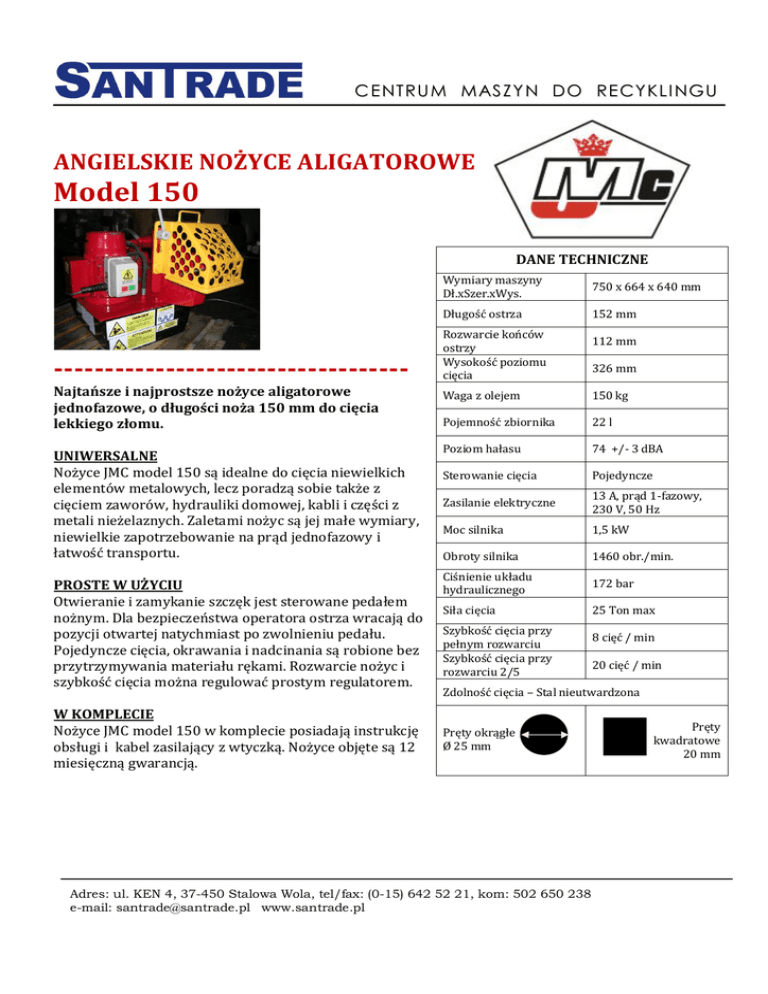 C E N T R U M M AS Z Y N D O R E CY K L I N G U ANGIELSKIE NOŻYCE ALIGATOROWE Model 150 DANE TECHNICZNE ----------------------------------Najtańsze i najprostsze nożyce aligatorowe jednofazowe, o długości noża 150 mm do cięcia lekkiego złomu. UNIWERSALNE Nożyce JMC model 150 są idealne do cięcia niewielkich elementów metalowych, lecz poradzą sobie także z cięciem zaworów, hydrauliki domowej, kabli i części z metali nieżelaznych. Zaletami nożyc są jej małe wymiary, niewielkie zapotrzebowanie na prąd jednofazowy i łatwość transportu. PROSTE W UŻYCIU Otwieranie i zamykanie szczęk jest sterowane pedałem nożnym. Dla bezpieczeństwa operatora ostrza wracają do pozycji otwartej natychmiast po zwolnieniu pedału. Pojedyncze cięcia, okrawania i nadcinania są robione bez przytrzymywania materiału rękami. Rozwarcie nożyc i szybkość cięcia można regulować prostym regulatorem. W KOMPLECIE Nożyce JMC model 150 w komplecie posiadają instrukcję obsługi i kabel zasilający z wtyczką. Nożyce objęte są 12 miesięczną gwarancją. Wymiary maszyny Dł.xSzer.xWys. 750 x 664 x 640 mm Długość ostrza 152 mm Rozwarcie końców ostrzy Wysokość poziomu cięcia 112 mm 326 mm Waga z olejem 150 kg Pojemność zbiornika 22 l Poziom hałasu 74 +/- 3 dBA Sterowanie cięcia Pojedyncze Zasilanie elektryczne 13 A, prąd 1-fazowy, 230 V, 50 Hz Moc silnika 1,5 kW Obroty silnika 1460 obr./min. Ciśnienie układu hydraulicznego 172 bar Siła cięcia 25 Ton max Szybkość cięcia przy pełnym rozwarciu Szybkość cięcia przy rozwarciu 2/5 8 cięć / min 20 cięć / min Zdolność cięcia – Stal nieutwardzona Pręty okrągłe Ø 25 mm Adres: ul. KEN 4, 37-450 Stalowa Wola, tel/fax: (0-15) 642 52 21, kom: 502 650 238 e-mail: [email protected] www.santrade.pl Pręty kwadratowe 20 mm