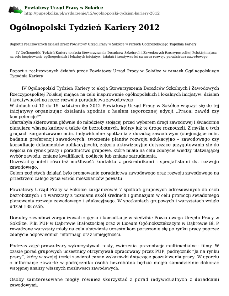 Powiatowy Urząd Pracy w Sokółce http://pupsokolka.pl/wydarzenie/12/ogolnopolski-tydzien-kariery-2012 Ogólnopolski Tydzień Kariery 2012 Raport z realizowanych działań przez Powiatowy Urząd Pracy w Sokółce w ramach Ogólnopolskiego Tygodnia Kariery IV Ogólnopolski Tydzień Kariery to akcja Stowarzyszenia Doradców Szkolnych i Zawodowych Rzeczypospolitej Polskiej mająca na celu inspirowanie ogólnopolskich i lokalnych inicjatyw, działań i kreatywności na rzecz rozwoju poradnictwa zawodowego. Raport z realizowanych działań przez Powiatowy Urząd Pracy w Sokółce w ramach Ogólnopolskiego Tygodnia Kariery IV Ogólnopolski Tydzień Kariery to akcja Stowarzyszenia Doradców Szkolnych i Zawodowych Rzeczypospolitej Polskiej mająca na celu inspirowanie ogólnopolskich i lokalnych inicjatyw, działań i kreatywności na rzecz rozwoju poradnictwa zawodowego. W dniach od 15 do 19 października 2012 Powiatowy Urząd Pracy w Sokółce włączył się do tej inicjatywy organizując działania zgodnie z hasłem tegorocznej edycji „Praca: zawód czy kompetencje?”. Ofertabyła skierowana głównie do młodzieży stojącej przed wyborem drogi zawodowej i świadomie planującą własną karierę a także do bezrobotnych, którzy już tę drogę rozpoczęli. Z myślą o tych grupach zorganizowano m.in. indywidualne spotkania z doradcą zawodowym (obejmujące m.in. badania preferencji zawodowych, tworzenie planów rozwoju edukacyjno – zawodowego czy konsultacje dokumentów aplikacyjnych), zajęcia aktywizacyjne dotyczące przygotowania się do wejścia na rynek pracy i poradnictwo grupowe, które miało na celu zdobycie wiedzy ułatwiającej wybór zawodu, zmianę kwalifikacji, podjęcie lub zmianę zatrudnienia. Uczestnicy mieli również możliwość kontaktu z pośrednikami i specjalistami ds. rozwoju zawodowego. Celem podjętych działań było promowanie poradnictwa zawodowego oraz rozwoju zawodowego na przestrzeni całego życia wśród mieszkańców powiatu. Powiatowy Urząd Pracy w Sokółce zorganizował 7 spotkań grupowych adresowanych do osób bezrobotnych i 4 warsztaty z uczniami szkół średnich i gimnazjum w celu promocji świadomego planowania rozwoju zawodowego i edukacyjnego. W spotkaniach grupowych i warsztatach wzięło udział 188 osób. Doradcy zawodowi zorganizowali zajęcia i konsultacje w siedzibie Powiatowego Urzędu Pracy w Sokółce, Filii PUP w Dąbrowie Białostockiej oraz w Liceum Ogólnokształcącym w Dąbrowie Bł. P rowadzone warsztaty miały na celu ułatwienie uczestnikom poruszanie się po rynku pracy poprzez zdobycie odpowiednich informacji oraz umiejętności. Podczas zajęć prowadzący wykorzystywali testy, ćwiczenia, prezentacje multimedialne i filmy. W czasie porad grupowych uczestnicy otrzymywali opracowany przez PUP, podręcznik ”Ja na rynku pracy”, który w swojej treści zawierał cenne wskazówki dotyczące poszukiwania pracy. W oparciu o informacje zawarte w podręczniku osoba bezrobotna będzie mogła samodzielnie dokonać wstępnej analizy własnych możliwości zawodowych. Osoby zainteresowane mogły również skorzystać z porad indywidualnych z doradcami zawodowymi. 48 osób skorzystało z konsultacji indywidualnych dokonując z pomocą doradcy zawodowego samooceny i planowania dalszej drogi zawodowej. 7 osobom opracowano indywidualny plan działania. Ponadto z informacji zawodowej skorzystały 22 osoby. Na Sali operacyjnej Centrum Aktywizacji Zawodowej wystawiono stoisko, gdzie w formie ulotek, opracowań, literatury, informatorów i teczek o zawodach zaprezentowano problematykę promującą usługi rynku pracy ze szczególnym uwzględnieniem poradnictwa zawodowego.Ponadto bezrobotni korzystali z usług specjalisty ds. rozwoju zawodowego gdzie uzyskiwali informacje nt. możliwości zdobywania i podnoszenia kwalifikacji zawodowych oraz z usług pośredników pracy celem uzyskiwania szczegółowych informacji nt. oczekiwań pracodawców na sokólskim rynku pracy. Powiatowy Urząd Pracy w siedzibie urzędu zorganizował również dzień otwarty skierowany do wszystkich zainteresowanych, gdzie można było zapoznać się z pracą Urzędu oraz formami pomocy oferowanymi przez Urząd. W ramach dni otwartych odbyły się spotkania z 37 uczniami w siedzibie Urzędu w Sokółce i z 44 uczniami w Liceum Ogólnokształcącym w Dąbrowie Białostockiej. Działania podjęte przez Urząd Pracy w ramachOgólnopolskiego Tygodnia Kariery cieszyły się dużym zainteresowaniem osób bezrobotnych jak i młodzieży. Ogółem ze wszystkich oferowanych form skorzystało 258 osób. Uczestnicy byli zgodni co do twierdzenia, że OTK to wydarzenie o bardzo dużym znaczeniu, zwłaszcza dla osób poszukujących zatrudnienia oraz tych, które stoją przed wyborem drogi zawodowej czy dalszej edukacji. Stanowi ono doskonałą okazję do zdobywania wiedzy na temat konsekwencji określonych wyborów, celów edukacyjno – zawodowych, potrzeby nieustannej nauki, niezależnie od wieku i kwalifikacji.