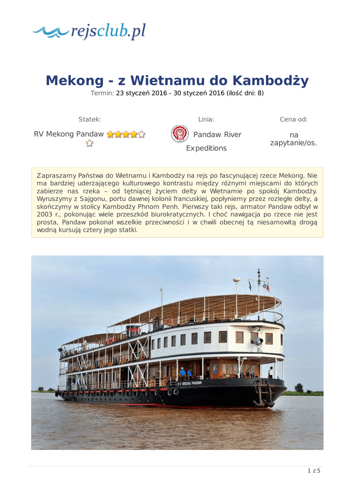 Mekong - z Wietnamu do Kambodży Termin: 23 styczeń 2016 - 30 styczeń 2016 (ilość dni: 8) Statek: RV Mekong Pandaw Linia: Pandaw River Expeditions Cena od: na zapytanie/os. Zapraszamy Państwa do Wietnamu i Kambodży na rejs po fascynującej rzece Mekong. Nie ma bardziej uderzającego kulturowego kontrastu między różnymi miejscami do których zabierze nas rzeka – od tętniącej życiem delty w Wietnamie po spokój Kambodży. Wyruszymy z Sajgonu, portu dawnej kolonii francuskiej, popłyniemy przez rozległe delty, a skończymy w stolicy Kambodży Phnom Penh. Pierwszy taki rejs, armator Pandaw odbył w 2003 r., pokonując wiele przeszkód biurokratycznych. I choć nawigacja po rzece nie jest prosta, Pandaw pokonał wszelkie przeciwności i w chwili obecnej tą niesamowitą drogą wodną kursują cztery jego statki. 1 z5 TRASA REJSU dzień 1 Data Port sobota 23.01.2016 Ho Chi Minh (daw. Sajgon) Wietnam Wpłynięcie Wypłynięcie Legenda --:-- --:-- Sajgon (obecna nazwa: Ho C hi Minh) jest stolicą południowego Wietnamu i drugim pod względem wielkości, po Hanoi, miastem w kraju. P omimo boomu ostatnich dziesięciu lat miasto to zachowało klimat dawnych Indochin. Łatwo można się o tym przekonać spacerując po szerokich bulwarach i zwiedzając wspaniałe zabytki kolonialnej francuskiej architektury. Szczególnie polecamy katedrę Notre Dame, pocztę oraz Operę, a także Ratusz. Sajgon jest też doskonałym miejscem, gdzie można spróbować francuskiej i wietnamskiej kuchni. Zapraszamy także na wycieczkę, trwającą pół dnia, do kompleksu tuneli C hu C hi. To swoiste podziemne miasto, zbudowane przez Wietkong, które pozwalało chronić się przed nalotami dywanowymi. dzień 2 niedziela 24.01.2016 Cai Be Wietnam --:-- --:-- Dziś udamy się do małej, ale bardzo charakterystycznej dla tego regionu miejscowości o nazwie C ai Be. P opłyniemy tam małymi, tradycyjnymi łodziami, zwanymi sampang odwiedzając po drodze Vinh Long, swoistą bramę do odkrywania atrakcji delty Mekongu. P łynąc wzdłuż kanałów i rozlewisk dotrzemy do C ai Be. Stoi tam wspaniały kościół zbudowany stylu gotyku francuskiego, ale nie to jest największą atrakcją miejscowości. Stanowi ją „pływający rynek”, gdzie sprzedawcy sprzedają towary prosto z łodzi. Samo C ai Be, podobnie jak większość wietnamskich miast, jest czyste i dobrze zorganizowane, po którym spacer nie stanowi problemu. dzień 3 poniedziałek 25.01.2016 Chau Doc Wietnam --:-- --:-- To jedno z najciekawszych miejsc w delcie Mekongu, graniczące z Kambodżą. Główny pomost łączący oba kraje znajduje się w centrum miasta, tuż obok hotelu Victoria, który jest bardzo przyjemnym miejscem. Można tam wypić drinka w barze, pograć w bilarda, można też skorzystać z Internetu, gdyż jest tam dostępne WIFI. Samo miasto zachowuje "francuski" styl i kusi urokiem wielu starych kolonialnych budynków (obecnie użytkowanych przez Komunistyczną P artię Wietnamu). C hau Doc jest bardzo zróżnicowane etnicznie. Obok siebie mieszkają C hamowie, Khmerowie oraz C hińczycy. Każda z tych nacji ma swoją kulturę, religię, a nawet architekturę. W okolicach miasta znajduje się wiele farm rybnych, gdzie ryby hoduje się w „zagrodach”, wielkich kadziach z bambusa, zawieszonych pod górnymi piętrami mieszkań, bezpośrednio w rzece. dzień 4 wtorek 26.01.2016 Phnom Penh Kambodża --:-- --:-- W dniu dzisiejszym odwiedzimy P hnom P enh, miasto słynące z francuskiej kolonialnej architektury, wielu kawiarni i klubów. Na wycieczkę wyruszymy rikszami (każdy swoją), skorzystamy bowiem z usług C yclo C entrum P hnom P enh, organizacji, którą właściwie można nazwać charytatywną. Dba się tam o kierujących rikszami jak nigdzie indziej, zapewniając im podstawowe potrzeby, dostęp do sanitariatów, opiekę medyczną, a nawet daje możliwości kształcenia w różnych zawodach. Na taką wycieczkę każdy z P aństwa wyruszy indywidualnie (zaopatrzywszy się uprzednio w nr kontaktowy na statek). Zwiedzanie w ten sposób nie będzie zbyt męczące, a jest co oglądać na dość rozległym terenie. P olecamy P omnik Niepodległości, Srebrną P agodę (P ałac Królewski), Muzeum Narodowe, gdzie znajdą P aństwo wyjątkową kolekcję rzemiosła Khmerów, czy ciekawe świątynie. P o południu udamy się (autokarem) do Toul Sleng, muzeum ludobójstwa, ponurego Więzienia Bezpieczeństwa (S-21) urządzonego przez reżim C zerwonych Khmerów w dawnej 2 z5 szkole (w języku khmerskim: „Wzgórze Zatrutych Drzew”). dzień 5 środa 27.01.2016 Kampong Chhnang Kambodża --:-- --:-- Dziś wyruszymy na wycieczkę w stronę prowincji Kampong C hhnang płynąc rzeką Tonle lub jadąc autokarem, ponieważ nie zawsze poziom wody pozwala na rejs. Kampong C hhnang to region położony na żyznej, niemal stale mokrej ziemi w sercu Kambodży. Rzeka Tonle wypływa z jeziora o tej samej nazwie płynąc w stronę Mekongu, przepływając między innymi przez P hnom P enh czy Siem Reap (w pobliżu którego znajdują się słynne ruiny Angkor). Najbardziej malowniczy odcinek rzeki to zwężenie między P hnom P enh i Kampong C hannang, gdzie rzeka wije się między lasami i wzgórzami zahaczając o wsie. Tonle jest nietypowa, ponieważ dwa razy w roku zmienia kierunek. Wraz z nadejściem monsunu, w lipcu, rzeka cofa się i zalewa centralną równinę Kambodży. Kiedy ta pora mija, poziom wody spada, a rzeka ponownie zmienia kierunek. dzień 6 czwartek 28.01.2016 Kampong Cham Kambodża --:-- --:-- Dziś zatrzymamy się w małej wiosce C hong Ko znanej z tkalni jedwabiu, na krótki poranny spacer. W godzinach popołudniowych przybędziemy do kolejnej wioski P eam C hi Kang, aby odwiedzić lokalną świątynię (wat) lub klasztor i szkołę. W świątyni przechowywane są wspaniałe lokalne łodzie wyścigowe. Kampong C ham jest ważną stolicą prowincji z zachowanymi francuskimi budynkami z czasów kolonialnych, wieloma targami i atr