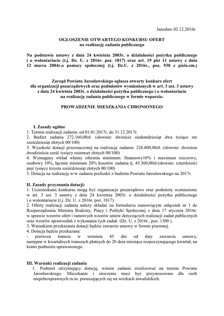 Jarosław 02.12.2016r. OGŁOSZENIE OTWARTEGO KONKURSU OFERT na realizację zadania publicznego Na podstawie ustawy z dnia 24 kwietnia 2003r. o działalności pożytku publicznego i o wolontariacie (t.j. Dz. U. z 2016r. poz. 1817) oraz art. 19 pkt 11 ustawy z dnia 12 marca 2004r.o pomocy społecznej (t.j. Dz.U. z 2016r., poz. 930 z późn.zm.) Zarząd Powiatu Jarosławskiego ogłasza otwarty konkurs ofert dla organizacji pozarządowych oraz podmiotów wymienionych w art. 3 ust. 3 ustawy z dnia 24 kwietnia 2003r. o działalności pożytku publicznego i o wolontariacie na realizację zadania publicznego w formie wsparcia: PROWADZENIE MIESZKANIA CHRONIONEGO I. Zasady ogólne 1. Termin realizacji zadania: od 01.01.2017r. do 31.12.2017r. 2. Budżet zadania 272.160,00zł. (słownie: dwieście siedemdziesiąt dwa tysiące sto sześćdziesiąt złotych 00/100) 3. Wysokość dotacji przeznaczonej na realizację zadania: 226.800,00zł. (słownie: dwieście dwadzieścia sześć tysięcy osiemset złotych 00/100) 4. Wymagany wkład własny oferenta minimum: finansowy10% i maximum rzeczowy, osobowy 10%, łącznie minimum 20% kosztów zadania tj. 45.360,00zł.(słownie: czterdzieści pięć tysięcy trzysta sześćdziesiąt złotych 00/100) 5. Dotacja na realizację w/w zadania pochodzi z budżetu Powiatu Jarosławskiego na 2017r. II. Zasady przyznania dotacji: 1. Uczestnikami konkursu mogą być organizacje pozarządowe oraz podmioty wymienione w art. 3 ust. 3 ustawy z dnia 24 kwietnia 2003r. o działalności pożytku publicznego i o wolontariacie (t.j. Dz. U. z 2016r. poz. 1817). 2. Oferty realizacji zadania należy składać na formularzu stanowiącym załącznik nr 1 do Rozporządzenia Ministra Rodziny, Pracy i Polityki Społecznej z dnia 17 stycznia 2016r. w sprawie wzorów ofert i ramowych wzorów umów dotyczących realizacji zadań publicznych oraz wzorów sprawozdań z wykonania tych zadań (Dz. U. z 2016r., poz. 1300 ). 3. Warunkiem przekazania dotacji będzie zawarcie umowy w formie pisemnej. 4. Dotacja będzie przekazana: pierwsza transza w terminie 45 dni od daty zawarcia umowy, następne w kwartalnych transzach płatnych do 20 dnia miesiąca rozpoczynającego kwartał, na konto podmiotu uprawnionego. III. Warunki realizacji zadania 1. Podmiot otrzymujący dotację, winien zadanie zrealizować na terenie Powiatu Jarosławskiego. Mieszkanie i otoczenie musi być przystosowane dla osób niepełnosprawnych m.in. poruszających się na wózkach inwalidzkich. 2. Mieszkanie chronione musi posiadać co najmniej 9 miejsc ze stałym dostępem do łazienki, kuchni, wyposażonych w niezbędne meble i sprzęty gospodarstwa domowego i osobne pomieszczenia gospodarcze. 3. Mieszkanie musi podlegać stałej – 24 h/dobę kontroli i świadczeniu usług asystenckich przez osoby posiadające kwalifikacje opiekunów/asystentów osób niepełnosprawnych. 4. Dotacja nie może być przeznaczona na: - inwestycje i środki trwałe, - spłatę zaległych zobowiązań, wynikających z bieżącej statutowej działalności podmiotu składającego ofertę konkursową, - zakup nieruchomości oraz realizacji robót budowlano - montażowych innych niż wskazane w umowie, - inne wydatki nie związane pośrednio i bezpośrednio z realizacją umowy, - koszty leczenia i rehabilitacji osób uprawnionych do świadczeń opieki zdrowotnej finansowanych ze środków publicznych oraz innych zinstytucjonalizowanych form w tym zakresie. 5. Koszty kwalifikowalne - bieżące działanie mieszkania chronionego, m.in.: - opłata czynszu, mediów; - wynagrodzenia osób świadczących usługi asystenckie; - żywność dla mieszkańców, środki higieniczne dla mieszkańców, środki czystości. 6.Wydatki w ramach konkursu są kwalifikowane, jeżeli są: a) niezbędne dla realizacji zadania, b) racjonalne i efektywne, c) zostały faktycznie poniesione w okresie realizacji zadania, d) udokumentowane, e) zostały przewidziane w budżecie zadania, f) zawierają się w kategorii kosztów obsługi zadania publicznego, g) zgodne z odrębnymi przepisami prawa powszechnie obowiązującego. 7. Organizacje pozarządowe lub podmioty wymienione w art. 3 ust. 3 w/w ustawy działające wspólnie mogą złożyć ofertę wspólną. 8. Osoby którym może być przyznany pobyt w mieszkaniu chronionym zostały określone w art. 53 ustawy z dnia 12 marca 2004r. o pomocy społecznej (t.j. Dz. U. z 2016r. poz. 930 z późn. zm.) w szczególności osoby z niepełnosprawnością intelektualną. 9. Prawo do pobytu w mieszkaniu chronionym ustalane jest w drodze decyzji administracyjnej na podstawie wywiadu środowiskowego. Za pobyt, mieszkańcy ponoszą odpłatność zgodnie z Uchwałą Nr IV/36/2011 Rady Powiatu Jarosławskiego z dnia 18 lutego 2011r. w sprawie ustalenia organizacji i szczegółowych zasad ponoszenia odpłatności w mieszkaniach chronionych z późn.zm. 10. Mieszkanie chronione oraz świadczone w nim usługi muszą spełniać standardy określone w Rozporządzeniu Ministra Pracy i Polityki Społecznej z dnia 14 marca 2012r. w sprawie mieszkań chronionych (Dz. U. z 2012r. poz. 305). IV. Termin składania ofert Oferty można składać/przesyłać (obowiązuje data stempla pocztowego) w terminie 21 dni od ukazania się niniejszego ogłoszenia, w zamkniętej kopercie z dopiskiem „Oferta na konkurs – prowadzenie mieszkania chronionego w 2017r.” w Powiatowym Centrum Pomocy Rodzinie w Jarosławiu, ul. Jana Pawła II 17, 37-500 Jarosław. V. Tryb i kryteria stosowane przy wyborze ofert: 1. Komisja konkursowa powołana przez Zarząd Powiatu dokona wyboru spośród złożonych w terminie ofert, biorąc pod uwagę: - poprawność wypełnienia oferty - oferta powinna być złożona na druku stanowiącym załącznik nr 1 do Rozporządzenia Ministra Rodziny, Pracy i Polityki Społecznej z dnia 17 stycznia 2016r. w sprawie wzorów ofert i ramowych wzorów umów dotyczących realizacji zadań publicznych oraz wzorów sprawozdań z wykonania tych zadań (Dz.