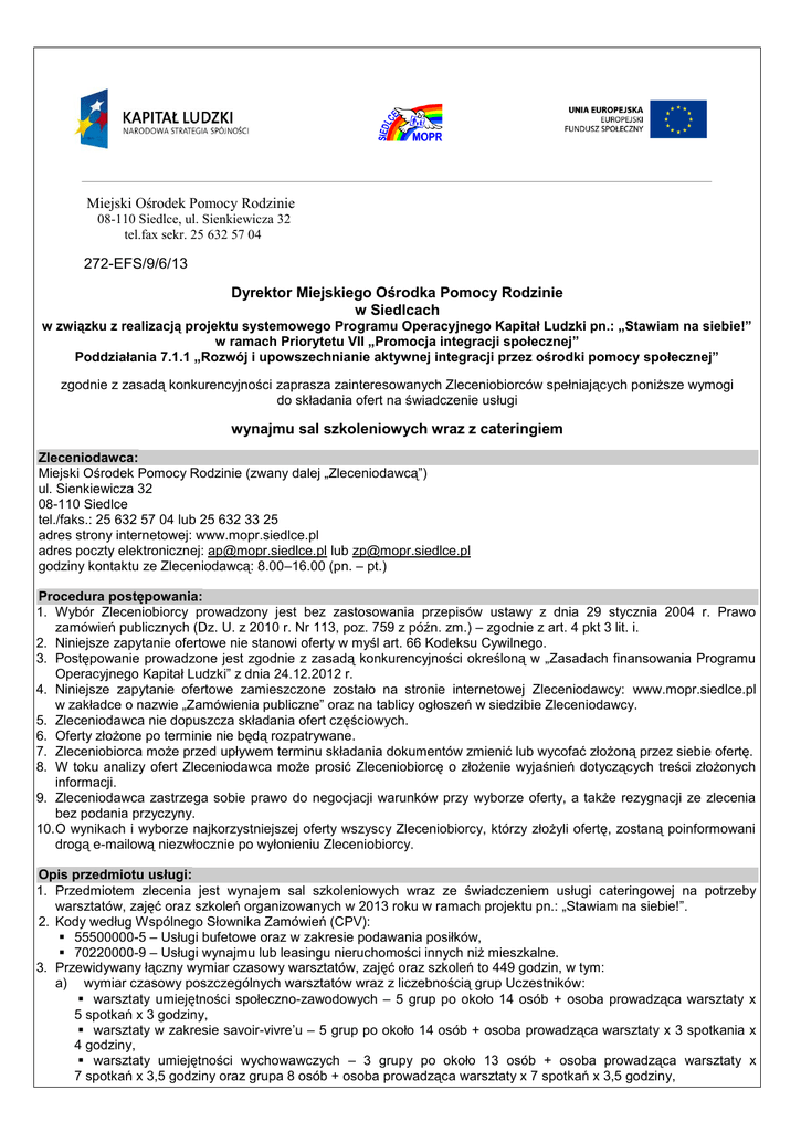 Miejski Ośrodek Pomocy Rodzinie 08-110 Siedlce, ul. Sienkiewicza 32 tel.fax sekr. 25 632 57 04 272-EFS/9/6/13 Dyrektor Miejskiego Ośrodka Pomocy Rodzinie w Siedlcach w związku z realizacją projektu systemowego Programu Operacyjnego Kapitał Ludzki pn.: „Stawiam na siebie!” w ramach Priorytetu VII „Promocja integracji społecznej” Poddziałania 7.1.1 „Rozwój i upowszechnianie aktywnej integracji przez ośrodki pomocy społecznej” zgodnie z zasadą konkurencyjności zaprasza zainteresowanych Zleceniobiorców spełniających poniższe wymogi do składania ofert na świadczenie usługi wynajmu sal szkoleniowych wraz z cateringiem Zleceniodawca: Miejski Ośrodek Pomocy Rodzinie (zwany dalej „Zleceniodawcą”) ul. Sienkiewicza 32 08-110 Siedlce tel./faks.: 25 632 57 04 lub 25 632 33 25 adres strony internetowej: www.mopr.siedlce.pl adres poczty elektronicznej: [email protected] lub [email protected] godziny kontaktu ze Zleceniodawcą: 8.00–16.00 (pn. – pt.) Procedura postępowania: 1. Wybór Zleceniobiorcy prowadzony jest bez zastosowania przepisów ustawy z dnia 29 stycznia 2004 r. Prawo zamówień publicznych (Dz. U. z 2010 r. Nr 113, poz. 759 z późn. zm.) – zgodnie z art. 4 pkt 3 lit. i. 2. Niniejsze zapytanie ofertowe nie stanowi oferty w myśl art. 66 Kodeksu Cywilnego. 3. Postępowanie prowadzone jest zgodnie z zasadą konkurencyjności określoną w „Zasadach finansowania Programu Operacyjnego Kapitał Ludzki” z dnia 24.12.2012 r. 4. Niniejsze zapytanie ofertowe zamieszczone zostało na stronie internetowej Zleceniodawcy: www.mopr.siedlce.pl w zakładce o nazwie „Zamówienia publiczne” oraz na tablicy ogłoszeń w siedzibie Zleceniodawcy. 5. Zleceniodawca nie dopuszcza składania ofert częściowych. 6. Oferty złożone po terminie nie będą rozpatrywane. 7. Zleceniobiorca może przed upływem terminu składania dokumentów zmienić lub wycofać złożoną przez siebie ofertę. 8. W toku analizy ofert Zleceniodawca może prosić Zleceniobiorcę o złożenie wyjaśnień dotyczących treści złożonych informacji. 9. Zleceniodawca zastrzega sobie prawo do negocjacji warunków przy wyborze oferty, a także rezygnacji ze zlecenia bez podania przyczyny. 10. O wynikach i wyborze najkorzystniejszej oferty wszyscy Zleceniobiorcy, którzy złożyli ofertę, zostaną poinformowani drogą e-mailową niezwłocznie po wyłonieniu Zleceniobiorcy. Opis przedmiotu usługi: 1. Przedmiotem zlecenia jest wynajem sal szkoleniowych wraz ze świadczeniem usługi cateringowej na potrzeby warsztatów, zajęć oraz szkoleń organizowanych w 2013 roku w ramach projektu pn.: „Stawiam na siebie!”. 2. Kody według Wspólnego Słownika Zamówień (CPV): 55500000-5 – Usługi bufetowe oraz w zakresie podawania posiłków, 70220000-9 – Usługi wynajmu lub leasingu nieruchomości innych niż mieszkalne. 3. Przewidywany łączny wymiar czasowy warsztatów, zajęć oraz szkoleń to 449 godzin, w tym: a) wymiar czasowy poszczególnych warsztatów wraz z liczebnością grup Uczestników: warsztaty umiejętności społeczno-zawodowych – 5 grup po około 14 osób + osoba prowadząca warsztaty x 5 spotkań x 3 godziny, warsztaty w zakresie savoir-vivre’u – 5 grup po około 14 osób + osoba prowadząca warsztaty x 3 spotkania x 4 godziny, warsztaty umiejętności wychowawczych – 3 grupy po około 13 osób + osoba prowadząca warsztaty x 7 spotkań x 3,5 godziny oraz grupa 8 osób + osoba prowadząca warsztaty x 7 spotkań x 3,5 godziny, warsztaty rodzinne – grupa 10 osób + osoba prowadząca warsztaty x 10 spotkań x 3 godziny; wymiar czasowy zajęć z doradcą zawodowym – 5 grup po około 16 osób + doradca zawodowy x 2 godziny oraz 8 grup po około 10 osób + doradca zawodowy x 1 godzina oraz 80 indywidualnych spotkań Uczestników z doradcą zawodowym x 1,5 godziny; c) wymiar czasowy szkolenia wraz z liczebnością grup Uczestników: szkolenie z zakresu pierwszej pomocy przedmedycznej – 7 grup po około 10 osób + osoba prowadząca szkolenie x 6 godzin oraz grupa 8 osób + osoba prowadząca szkolenie x 6 godzin). Zlecenie obejmować będzie okres od maja do maksymalnie połowy grudnia 2013 roku. Harmonogramy poszczególnych zajęć zostaną określone przez Zleceniodawcę w porozumieniu ze Zleceniobiorcą niezwłocznie po ustaleniu terminów zajęć z osobami odpowiedzialnymi za ich prowadzenie (po wyłonieniu Wykonawców). Usługa cateringowa obejmuje przygotowanie i obsługę serwisu kawowego podczas wszystkich spotkań każdej z grup w ramach warsztatów i szkoleń – łącznie przewidujemy maksymalnie 1074 jednostki cateringowe podczas przerw kawowych. Usługa cateringowa w niniejszym zleceniu nie obejmuje zajęć z doradcą zawodowym, podczas których Zleceniodawca nie przewiduje przerw kawowych. Liczba godzin najmu sali oraz liczba jednostek cateringowych może ulec zmianie. b) 4. 5. 6. 7. 8. Warunki zlecenia usługi: 1. Budynek, w którym będą odbywać się warsztaty, zajęcia oraz szkolenie powinien być dostosowany do potrzeb osób niepełnosprawnych ruchowo i powinien być usytuowany w centrum Siedlec lub w innym miejscu o dogodnym dojeździe komunikacją miejską. 2. Zleceniodawca zastrzega sobie prawo przeprowadzenia wizytacji lokalu przed udzieleniem zlecenia. 3. Zleceniobiorca powinien posiadać ubezpieczenie od odpowiedzialności cywilnej za szkody powstałe na terenie obiektu, w którym będą odbywać się warsztaty, zajęcia oraz szkolenie. 4. Zleceniobiorca musi dysponować jednocześnie minimum dwoma odrębnymi salami szkoleniowymi do zajęć grupowych, salą do zajęć indywidualnych oraz osobnym pomieszczeniem na serwis kawowy. 5. Sale szkoleniowe do zajęć grupowych powinny spełniać następujące wymagania: sale powinny gwarantować optymalne warunki prowadzenia zajęć w grupach do 20 Uczestników, zgodnie z wymaganiami polskiego prawa, tj. spełniać odpowiednie warunki sanitarne, bezpieczeństwa i techniczne, powinny być też utrzyma