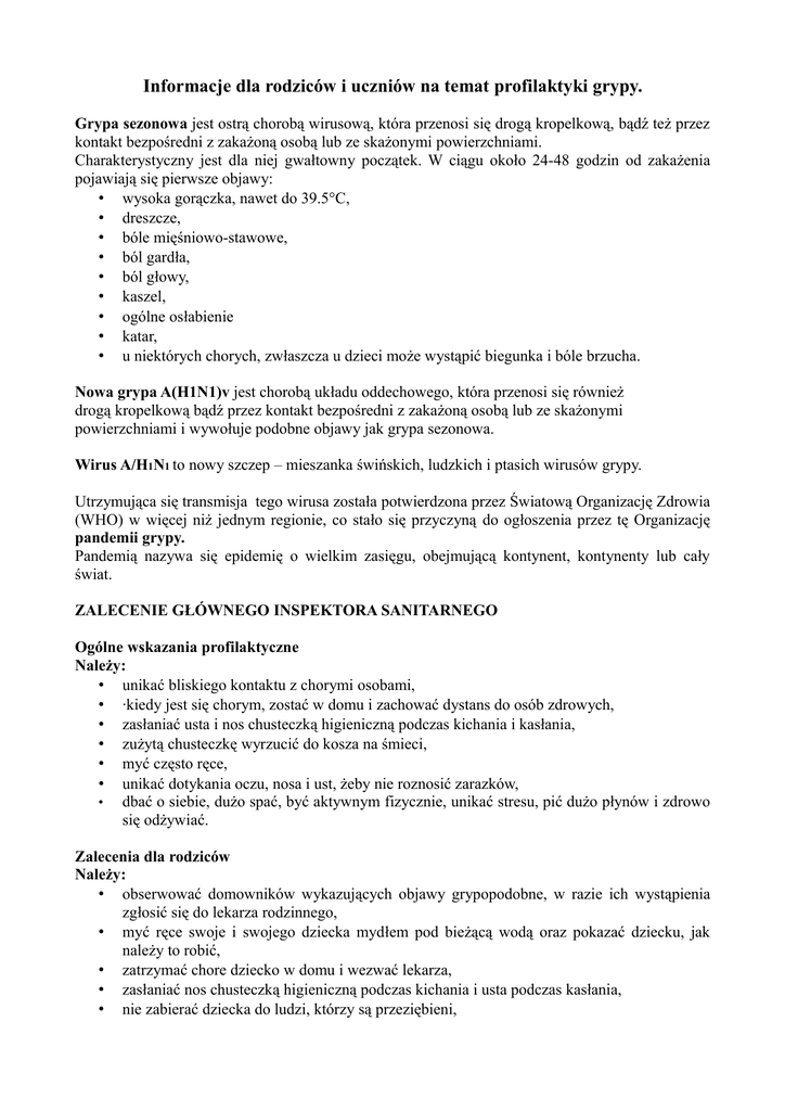 Informacje dla rodziców i uczniów na temat profilaktyki grypy.