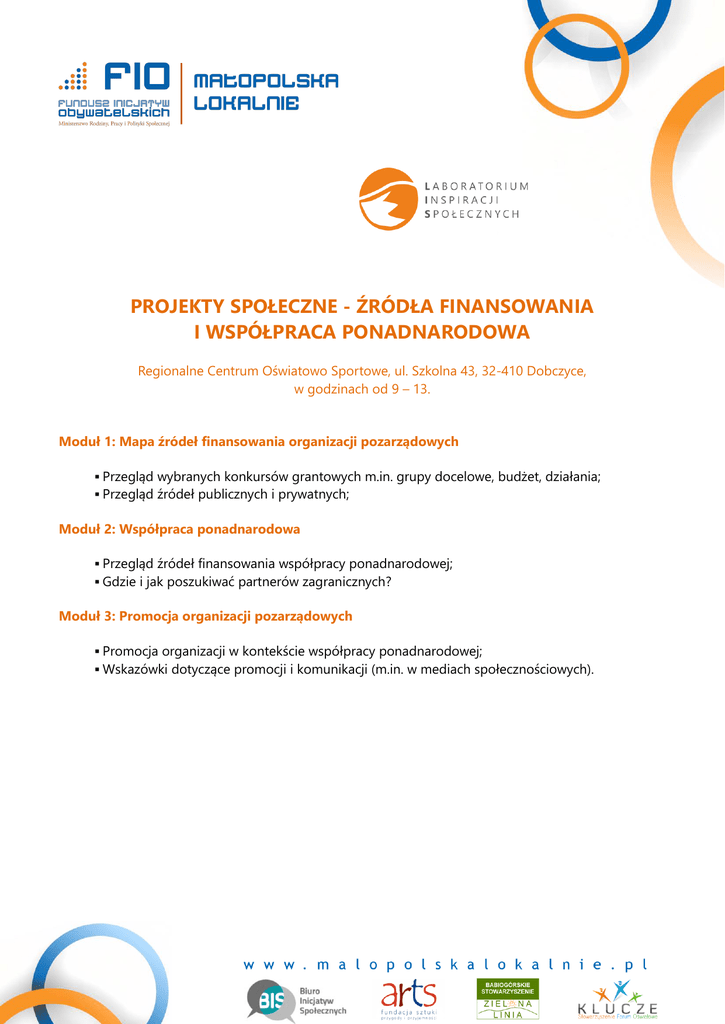 PROJEKTY SPOŁECZNE - ŹRÓDŁA FINANSOWANIA I WSPÓŁPRACA PONADNARODOWA Regionalne Centrum Oświatowo Sportowe, ul. Szkolna 43, 32-410 Dobczyce, w godzinach od 9 – 13. Moduł 1: Mapa źródeł finansowania organizacji pozarządowych Przegląd wybranych konkursów grantowych m.in. grupy docelowe, budżet, działania; Przegląd źródeł publicznych i prywatnych; Moduł 2: Współpraca ponadnarodowa Przegląd źródeł finansowania współpracy ponadnarodowej; Gdzie i jak poszukiwać partnerów zagranicznych? Moduł 3: Promocja organizacji pozarządowych Promocja organizacji w kontekście współpracy ponadnarodowej; Wskazówki dotyczące promocji i komunikacji (m.in. w mediach społecznościowych). PROWADZĄCE: Anna Styszko - Trenerka i doradczyni. Współzałożycielka Laboratorium Inspiracji Społecznych, obecnie Prezeska Zarządu Fundacji. Angażuje się w proces wzmacniania środowiska pozarządowego działając w zarządzie Federacji Małopolska Pozarządowa oraz będąc członkinią Małopolskiej Rady Działalności Pożytku Publicznego. Wspiera instytucje społeczne i samorządowe w zakresie zarządzania strategicznego i operacyjnego, wdrażania projektów oraz animacji lokalnej społeczności. Ekspertka w zakresie konsultacji społecznych oraz współpracy sektora publicznego i społecznego, m.in. wspierała proces wdrażania Budżetu Obywatelskiego w UMiG Olkusz. Od 2009 r. lat jako ekspertka oceny merytorycznej wniosków o dofinansowanie współpracuje z Ministerstwem Rodziny, Pracy i Polityki Społecznej. Absolwentka politologii, posiada dyplom Europeistyki Uniwersytetu Provence Aix-Marseille. Ukończyła Szkołę Trenerów Zarządzania oraz liczne kursy trenerskie w Polsce i zagranicą. Stypendystka programu „Liderzy w społeczeństwie obywatelskim” Instytutu Roberta Schumana. dr Ewa Krupnik – Współzałożycielka i Viceprezes Fundacji Laboratorium Inspiracji Społecznych. Specjalistka ds. public relations, dr nauk humanistycznych, trenerka Wszechnicy Uniwersytetu Jagiellońskiego. Od ponad 8 lat związana z pracą w sektorze społecznym. Ekspertka i wykładowca PR w NGO na Uniwersytecie Jagiellońskim. Pomysłodawczyni i inicjatorka strony poświęconej promocji organizacji pozarządowych - Promuj NGO! Prowadzi szkolenia z zakresu public relations w organizacjach pozarządowych jak i instytucjach publicznych. Przygotowuje analizy i kompleksowe strategie PR dla organizacji pozarządowych a także innych podmiotów. Na co dzień współpracuje z organizacjami pozarządowymi przy promocji ogólnopolskich wydarzeń, kampaniach społecznych oraz akcjach crowdfundingowych.