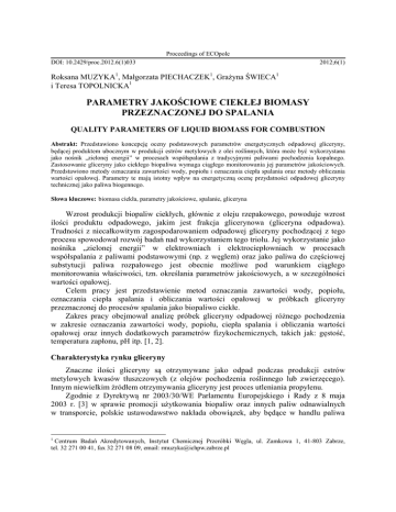 Proceedings of ECOpole DOI: 10.2429/proc.2012.6(1)033 2012;6(1) Roksana MUZYKA1, Małgorzata PIECHACZEK1, Grażyna ŚWIECA1 i Teresa TOPOLNICKA1 PARAMETRY JAKOŚCIOWE CIEKŁEJ BIOMASY PRZEZNACZONEJ DO SPALANIA QUALITY PARAMETERS OF LIQUID BIOMASS FOR COMBUSTION Abstrakt: Przedstawiono koncepcję oceny podstawowych parametrów energetycznych odpadowej gliceryny, będącej produktem ubocznym w produkcji estrów metylowych z olei roślinnych, która może być wykorzystana jako nośnik „zielonej energii” w procesach współspalania z tradycyjnymi paliwami pochodzenia kopalnego. Zastosowanie gliceryny jako ciekłego biopaliwa wymaga ciągłego monitorowania jej parametrów jakościowych. Przedstawiono metody oznaczania zawartości wody, popiołu i oznaczania ciepła spalania oraz metody obliczania wartości opałowej. Parametry te mają istotny wpływ na energetyczną ocenę przydatności odpadowej gliceryny technicznej jako paliwa biogennego. Słowa kluczowe: biomasa ciekła, parametry jakościowe, spalanie, gliceryna Wzrost produkcji biopaliw ciekłych, głównie z oleju rzepakowego, powoduje wzrost ilości produktu odpadowego, jakim jest frakcja glicerynowa (gliceryna odpadowa). Trudności z niecałkowitym zagospodarowaniem odpadowej gliceryny pochodzącej z tego procesu spowodował rozwój badań nad wykorzystaniem tego triolu. Jej wykorzystanie jako nośnika „zielonej energii” w elektrowniach i elektrociepłowniach w procesach współspalania z paliwami podstawowymi (np. z węglem) oraz jako paliwa do częściowej substytucji paliwa rozpałowego jest obecnie możliwe pod warunkiem ciągłego monitorowania właściwości, tzn. określania parametrów jakościowych, a w szczególności wartości opałowej. Celem pracy jest przedstawienie metod oznaczania zawartości wody, popiołu, oznaczania ciepła spalania i obliczania wartości opałowej w próbkach gliceryny przeznaczonej do procesów spalania jako biopaliwo ciekłe. Zakres pracy obejmował analizę próbek gliceryny odpadowej różnego pochodzenia w zakresie oznaczania zawartości wody, popiołu, ciepła spalania i obliczania wartości opałowej oraz innych dodatkowych parametrów fizykochemicznych, takich jak: gęstość, temperatura zapłonu, pH itp. [1, 2]. Charakterystyka rynku gliceryny Znaczne ilości gliceryny są otrzymywane jako odpad podczas produkcji estrów metylowych kwasów tłuszczowych (z olejów pochodzenia roślinnego lub zwierzęcego). Innym niewielkim źródłem otrzymywania gliceryny jest proces utleniania propylenu. Zgodnie z Dyrektywą nr 2003/30/WE Parlamentu Europejskiego i Rady z 8 maja 2003 r. [3] w sprawie promocji użytkowania biopaliw oraz innych paliw odnawialnych w transporcie, polskie ustawodawstwo nakłada obowiązek, aby będące w handlu paliwa 1 Centrum Badań Akredytowanych, Instytut Chemicznej Przeróbki Węgla, ul. Zamkowa 1, 41-803 Zabrze, tel. 32 271 00 41, fax 32 271 08 09, email: [email protected] 246 Roksana Muzyka, Małgorzata Piechaczek, Grażyna Świeca i Teresa Topolnicka silnikowe zawierały określone stężenia biokomponentów. W tabeli 1 przedstawiono wymaganą ilość bioskładników w paliwach silnikowych w poszczególnych latach. Tabela 1 Rozporządzenie Rady Ministrów z dnia 15 czerwca 2007 roku w sprawie Narodowych Celów Wskaźnikowych w latach 2008-2013 [4] Table 1 Regulation of the Council of Ministers of 15 June 2007 on the National indicative targets for the period 2008-2013 [4] Rok 2008 2009 2010 2011 2012 2013 Udział biokomponentów w paliwach ciekłych [%] 3,45 4,60 5,75 6,20 6,65 7,10 Wymagany udział biokomponentów w paliwach ciekłych sprawia, że od podstaw powstaje w Polsce rynek producentów estrów kwasów tłuszczowych, a co za tym idzie, zwiększa się produkcja gliceryny odpadowej. W Polsce kilkanaście firm prowadzi działalność w sektorze producentów biopaliw, z których należy wymienić największe: • Rafineria Trzebinia • Lotos Biopaliwa (Czechowice-Dziedzice) • Wratislavia-Bio Sp. z o.o. • ADM Malbork S.A. Pierwsza instalacja produkcji FAME (Fatty Acid Methyl Esters - estry metylowe kwasów tłuszczowych) - w Polsce powstała pod koniec 2004 roku w Rafinerii Trzebinia. Przez 5 lat polski rynek producentów biopaliw wykazywał znaczący wzrost nieznacznie zahamowany kryzysem gospodarczym w ostatnich latach. Przyjmuje się, że na 1 Mg (tonę) wyprodukowanych estrów metylowych kwasów tłuszczowych otrzymuje się około 200 kg tzw. frakcji glicerynowej, w której 80÷110 kg stanowi gliceryna surowa [3, 5-9]. Czysta gliceryna to ważny surowiec w przemyśle: spożywczym, farmaceutycznym, kosmetycznym, tytoniowym, skórzanym, do produkcji materiałów wybuchowych, barwników i płynów chłodniczych. Jednakże wymienione sektory gospodarki stawiają bardzo wysokie wymagania jakości glicerynie, w wyniku czego należy stosować bardzo rozbudowany, a co za tym idzie, kosztowny proces oczyszczania frakcji glicerynowej. Właśnie z powodu ograniczonego zapotrzebowania na glicerynę przez dotychczasowych odbiorców oraz niewielkiej rentowności w sprzedaży gliceryny czystej prowadzone są badania nad wykorzystaniem frakcji glicerynowej jako surowca. Przedstawiane są oryginalne koncepcje zagospodarowania frakcji glicerynowej poprzez jej skojarzoną chemiczną obróbkę: na drodze zmydlania, transestryfikacji, oksyetylacji, amonolizy i transacetalizacji. Produkty przerobu mogą znaleźć zastosowanie w wielu nowych gałęziach gospodarki, m.in. jako emulgatory, inhibitory korozji, detergenty, dodatki funkcyjne do cieczy obróbkowych. Możliwość współspalania gliceryny poprawi stan środowiska naturalnego, zmniejszając emisję ditlenku węgla i węglowodorów aromatycznych. Próby wykorzystania Parametry jakościowe ciekłej biomasy przeznaczonej do spalania 247 gliceryny dla celów ciepłownictwa miały miejsce m.in. w USA oraz w Polsce, gdzie tematyka ta była omawiana w licznych publikacjach [10]. Zgodnie z definicją zawartą w §