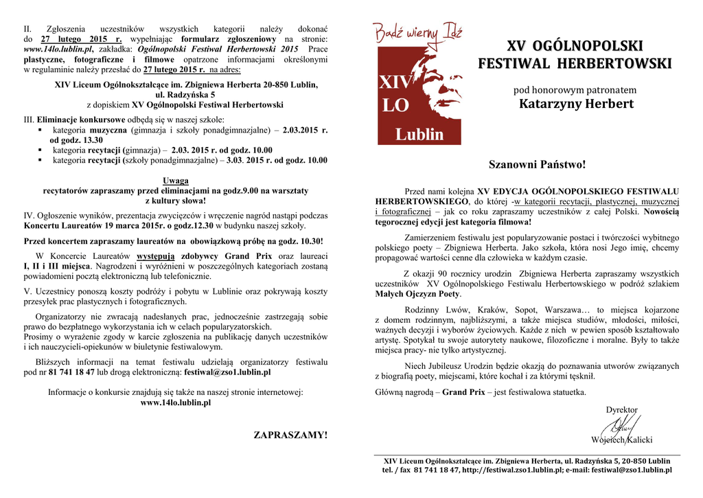 II. Zgłoszenia uczestników wszystkich kategorii należy dokonać do 27 lutego 2015 r. wypełniając formularz zgłoszeniowy na stronie: www.14lo.lublin.pl, zakładka: Ogólnopolski Festiwal Herbertowski 2015 Prace plastyczne, fotograficzne i filmowe opatrzone informacjami określonymi w regulaminie należy przesłać do 27 lutego 2015 r. na adres: XIV Liceum Ogólnokształcące im. Zbigniewa Herberta 20-850 Lublin, ul. Radzyńska 5 z dopiskiem XV Ogólnopolski Festiwal Herbertowski III. Eliminacje konkursowe odbędą się w naszej szkole: kategoria muzyczna (gimnazja i szkoły ponadgimnazjalne) – 2.03.2015 r. od godz. 13.30 kategoria recytacji (gimnazja) – 2.03. 2015 r. od godz. 10.00 kategoria recytacji (szkoły ponadgimnazjalne) – 3.03. 2015 r. od godz. 10.00 Uwaga recytatorów zapraszamy przed eliminacjami na godz.9.00 na warsztaty z kultury słowa! IV. Ogłoszenie wyników, prezentacja zwycięzców i wręczenie nagród nastąpi podczas Koncertu Laureatów 19 marca 2015r. o godz.12.30 w budynku naszej szkoły. Przed koncertem zapraszamy laureatów na obowiązkową próbę na godz. 10.30! W Koncercie Laureatów występują zdobywcy Grand Prix oraz laureaci I, II i III miejsca. Nagrodzeni i wyróżnieni w poszczególnych kategoriach zostaną powiadomieni pocztą elektroniczną lub telefonicznie. V. Uczestnicy ponoszą koszty podróży i pobytu w Lublinie oraz pokrywają koszty przesyłek prac plastycznych i fotograficznych. XV OGÓLNOPOLSKI FESTIWAL HERBERTOWSKI pod honorowym patronatem Katarzyny Herbert Szanowni Państwo! Przed nami kolejna XV EDYCJA OGÓLNOPOLSKIEGO FESTIWALU HERBERTOWSKIEGO, do której -w kategorii recytacji, plastycznej, muzycznej i fotograficznej – jak co roku zapraszamy uczestników z całej Polski. Nowością tegorocznej edycji jest kategoria filmowa! Zamierzeniem festiwalu jest popularyzowanie postaci i twórczości wybitnego polskiego poety – Zbigniewa Herberta. Jako szkoła, która nosi Jego imię, chcemy propagować wartości cenne dla człowieka w każdym czasie. Z okazji 90 rocznicy urodzin Zbigniewa Herberta zapraszamy wszystkich uczestników XV Ogólnopolskiego Festiwalu Herbertowskiego w podróż szlakiem Małych Ojczyzn Poety. Organizatorzy nie zwracają nadesłanych prac, jednocześnie zastrzegają sobie prawo do bezpłatnego wykorzystania ich w celach popularyzatorskich. Prosimy o wyrażenie zgody w karcie zgłoszenia na publikację danych uczestników i ich nauczycieli-opiekunów w biuletynie festiwalowym. Rodzinny Lwów, Kraków, Sopot, Warszawa… to miejsca kojarzone z domem rodzinnym, najbliższymi, a także miejsca studiów, młodości, miłości, ważnych decyzji i wyborów życiowych. Każde z nich w pewien sposób kształtowało artystę. Spotykał tu swoje autorytety naukowe, filozoficzne i moralne. Były to także miejsca pracy- nie tylko artystycznej. Bliższych informacji na temat festiwalu udzielają organizatorzy festiwalu pod nr 81 741 18 47 lub drogą elektroniczną: [email protected] Niech Jubileusz Urodzin będzie okazją do poznawania utworów związanych z biografią poety, miejscami, które kochał i za którymi tęsknił. Informacje o konkursie znajdują się także na naszej stronie internetowej: www.14lo.lublin.pl ZAPRASZAMY! Główną nagrodą – Grand Prix – jest festiwalowa statuetka. Dyrektor Wojciech Kalicki XIV Liceum Ogólnokształcące im. Zbigniewa Herberta, ul. Radzyńska 5, 20-850 Lublin tel. / fax 81 741 18 47, http://festiwal.zso1.lublin.pl; e-mail: [email protected] Regulamin XV OGÓLNOPOLSKIEGO FESTIWALU HERBERTOWSKIEGO I. Konkurs odbywa się w pięciu kategoriach: recytacji, plastycznej, fotograficznej, muzycznej oraz filmowej i skierowany jest do uczniów gimnazjów oraz szkół ponadgimnazjalnych całej Polski. KATEGORIA RECYTACJI Uczestnicy w obu poziomach (gimnazja i ponadgimnazjalne) recytują dwa wybrane przez siebie utwory. Czas prezentacji ok. 8 minut, Maksymalna liczba zgłoszeń z jednej szkoły – 2 uczestników. Jury oceniać będzie: dobór tekstów i dostosowanie ich do możliwości wykonawczych oraz interpretacyjnych recytatora, prawidłową i wyrazistą interpretację, poprawność dykcji, ogólny wyraz artystyczny. KATEGORIA PLASTYCZNA Praca plastyczna inspirowana twórczością Zbigniewa Herberta wykonana w dowolnym formacie i wybranej technice (rysunek, grafika, malarstwo, collage ). Na odwrocie należy (wyraźnie i drukowanymi literami) podać dane o autorze pracy: imię i nazwisko ucznia, szkoła, miejscowość, imię i nazwisko nauczyciela-opiekuna Prosimy o dołączenie wydrukowanego tekstu utworu, który stał się inspiracją pracy. Maksymalna ilość zgłoszeń ze szkoły – 3 prace. Jury oceniać będzie: plastyczną interpretację wiersza, dobór odpowiednich środków artystycznego wyrazu, estetykę wykonania. KATEGORIA FOTOGRAFICZNA Praca inspirowana twórczością Zbigniewa Herberta Należy dołączyć czytelne dane o autorze pracy: imię i nazwisko ucznia, szkoła, miejscowość, imię i nazwisko nauczyciela- opiekuna, Format pracy : w wersji elektronicznej rozmiar 3200pix.po dłuższym boku. plik JPG , lub w wersji wydrukowanej/ wywołanej/ w rozmiarze 20x30 cm oraz plik JPG przesłany drogą mailową na adres : [email protected]. dopuszczalne są minimalne korekty graficzne, Prosimy o dołączenie wydrukowanego tekstu utworu, który stał się inspiracją pracy. Dodatkowo, autorzy zdjęć zobligowani są do dołączenia Oświadczenia o autorstwie pracy, które znajduje się na stronie internetowej szkoły. Maksymalna liczba zgłoszeń z jednej szkoły – 5 prac. Jury oceniać będzie fotograficzną interpretację wiersza, dobór odpowiednich środków artystycznego wyrazu, kompozycję oraz technikę wykonania zdjęcia. KATEGORIA MUZYCZNA Prezentacja – indywidualna lub zespołowa – muzycznej interpretacji wybranego utworu Zbigniewa Herberta. Mile widziana własna kompozycja instrumentalnowokalna. / Prosimy o zaznaczenie tej informacji na karcie zgłoszeniow