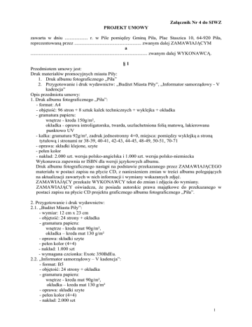 Załącznik Nr 4 do SIWZ PROJEKT UMOWY zawarta w dniu ................... r. w Pile pomiędzy Gminą Piła, Plac Staszica 10, 64-920 Piła, reprezentowaną przez ....................................................... zwanym dalej ZAMAWIAJĄCYM a ................................................................................................ zwanym dalej WYKONAWCĄ. §1 Przedmiotem umowy jest: Druk materiałów promocyjnych miasta Piły: 1. Druk albumu fotograficznego „Piła” 2. Przygotowanie i druk wydawnictw: „BudŜet Miasta Piły”, „Informator samorządowy - V kadencja” Opis przedmiotu umowy: 1. Druk albumu fotograficznego „Piła”: - format: A4 - objętość: 96 stron + 8 sztuk kalek technicznych + wyklejka + okładka - gramatura papieru: wnętrze - kreda 150g/m², okładka - oprawa introligatorska, twarda, uszlachetniona folią matową, lakierowana punktowo UV - kalka: gramatura 92g/m², zadruk jednostronny 4+0, miejsca: pomiędzy wyklejką a stroną tytułową i stronami nr 38-39, 40-41, 42-43, 44-45, 48-49, 50-51, 70-71 - oprawa: składki klejone, szyte - pełen kolor - nakład: 2.000 szt. wersja polsko-angielska i 1.000 szt. wersja polsko-niemiecka Wykonawca zapewnia nr ISBN dla wersji językowych albumu. Druk albumu fotograficznego nastąpi na podstawie przekazanego przez ZAMAWIAJĄCEGO materiału w postaci zapisu na płycie CD, z naniesieniem zmian w treści albumu polegających na aktualizacji zawartych w nich informacji i wymiany wskazanych zdjęć. ZAMAWIAJĄCY przekaŜe WYKONAWCY tekst do zmian i zdjęcia do wymiany. ZAMAWIAJĄCY oświadcza, Ŝe posiada autorskie prawa majątkowe do przekazanego w postaci zapisu na płycie CD projektu graficznego albumu fotograficznego „Piła”. 2. Przygotowanie i druk wydawnictw: 2.1. „BudŜet Miasta Piły”: - wymiar: 12 cm x 23 cm - objętość: 24 strony + okładka - gramatura papieru: wnętrze - kreda mat 90g/m², okładka – kreda mat 130 g/m² - oprawa: składki szyte - pełen kolor (4+4) - nakład: 1.000 szt - wymagana czcionka: Exotc 350BdEu. 2.2. „Informator samorządowy – V kadencja”: - format: B5 - objętość: 24 strony + okładka - gramatura papieru: wnętrze - kreda mat 90g/m², okładka – kreda mat 130 g/m² - oprawa: składki szyte - pełen kolor (4+4) - nakład: 2.000 szt 1 - wymagana czcionka: Exotc 350BdEu. Wykonawca zapewnia nr ISBN dla wydawnictw. Przygotowanie projektów wydawnictw na podstawie przekazanych przez ZAMAWIAJĄCEGO materiałów w postaci tekstu, danych, zdjęć. Specyfikacja Istotnych Warunków Zamówienia oraz oferta WYKONAWCY stanowią załączniki do niniejszej umowy. §2 WYKONAWCA ponosi koszty: - dokonania korekty tekstu i opracowania tłumaczeń korekty wersji językowych albumu fotograficznego „Piła” - wymiany 6 zdjęć w albumie fotograficznym - opracowania projektu graficznego wydawnictwa „BudŜet Miasta Piły”, „Informator samorządowy - V kadencja” - wydruków próbnych, barwnych albumu fotograficznego i wydawnictw - pozyskania czcionki wymaganej przez ZAMAWIAJĄCEGO. §3 ZAMAWIAJĄCY przed oddaniem albumu fotograficznego i wydawnictw do druku zatwierdzi ostateczną wersję, dobór zdjęć, elementów graficznych i projekty graficzne. Zatwierdzenie wymaga formy pisemnej Naczelnika Wydziału Promocji i Rozwoju Urzędu Miasta Piły. §4 1. WYKONAWCA nie ma prawa powierzenia wykonania przedmiotu umowy osobom trzecim bez pisemnej zgody ZAMAWIAJĄCEGO. 2. ZAMAWIAJĄCY przekaŜe WYKONAWCY materiały niezbędne do wykonania przedmiotu zamówienia: 2.1. płyta CD z projektem albumu fotograficznego „Piła”, tekst i zdjęcia do przygotowania druku albumu fotograficznego „Piła” do dnia ............ 2010 r. 2.2. tekst, dane i zdjęcia do przygotowania wydawnictwa „BudŜet Miasta Piły” do dnia .............. 2010 r. 2.3. tekst, dane i zdjęcia do przygotowania wydawnictwa „Informator samorządowy – V kadencja” do dnia …................ 2010 r. §5 1. WYKONAWCA po wykonaniu przedmiotu umowy zobowiązany jest rozliczyć się z materiałów udostępnionych przez ZAMAWIAJĄCEGO. 2. WYKONAWCA po wykonaniu przedmiotu umowy przekaŜe ZAMAWIAJĄCEMU pełne materiały w postaci zapisu na płycie CD/DVD, w formie umoŜliwiającej dokonywanie dalszych zmian i dodruków. 3. WYKONAWCA oświadcza, Ŝe nie wykorzysta powierzonych materiałów do innych celów. §6 1. W momencie odbioru wydawnictw „BudŜet Miasta Piły”, „Informator samorządowy - V kadencja” przez ZAMAWIAJĄCEGO WYKONAWCA przenosi nieodpłatnie na ZAMAWIAJĄCEGO autorskie prawa majątkowe do wydawnictw w zakresie następujących pól eksploatacji: - utrwalanie i zwielokrotnianie – wytwarzanie określoną techniką, w tym techniką drukarską, reprograficzną, fotograficzną, zapis magnetyczny, cyfrowy; - wprowadzenie do obrotu; - rozpowszechnianie poprzez publiczne wystawienie, wyświetlenie, odtworzenie oraz nadawanie i reemitowanie - dokonywanie zmian polegających na aktualizacji zawartych w nich informacji, wymianie zdjęć, elementów graficznych, zmianie kompozycji. 2. Wykonawca przenosi autorskie prawa majątkowe do wydawnictw bez ograniczeń czasowych. 2 3. Przeniesienie autorskich praw majątkowych upowaŜnia Zamawiającego do korzystania z wydawnictw w całości jak i z poszczególnych ich fragmentów w zakresie ww. pól eksploatacji. 4. Wraz z przeniesieniem nieodpłatnie autorskich praw majątkowych Wykonawca przenosi na Zamawiającego nieodpłatnie oryginał wydawnictw. §7 WYKONAWCA oświadcza, Ŝe dzieło nie jest obciąŜone prawami osób WYKONAWCA oświadcza jednocześnie, Ŝe absolutnie praw takich nie narusza. trzecich. §8 Termin wykonania przedmiotu umowy określonego w § 1 strony ustalają następująco: 1. Druk albumu fotograficznego „Piła” na dzień 30 kwietnia 2010 r. 2. Przygotowanie i druk wydawnictw: „BudŜet Miasta Piły, „Informator samorządowy – V kadencja” na dzień 17 maja 2010 r. §9 1. ZAMAWIAJĄCY otrzyma przedmiot umowy w zakresie