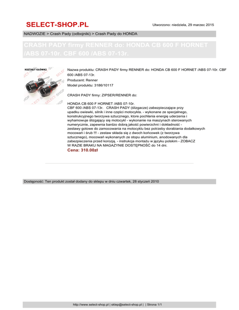 SELECT-SHOP.PL Utworzono: niedziela, 29 marzec 2015 NADWOZIE > Crash Pady (odbojniki) > Crash Pady do HONDA CRASH PADY firmy RENNER do: HONDA CB 600 F HORNET /ABS 07-10r. CBF 600 /ABS 07-13r. Nazwa produktu: CRASH PADY firmy RENNER do: HONDA CB 600 F HORNET /ABS 07-10r. CBF 600 /ABS 07-13r. Producent: Renner Model produktu: 3186/10117 CRASH PADY firmy: ZIPSER/RENNER do: HONDA CB 600 F HORNET /ABS 07-10r. CBF 600 /ABS 07-13r. CRASH PADY (ślizgacze) zabezpieczające przy upadku owiewki, silnik i inne części motocykla. - wykonane ze specjalnego, konstrukcyjnego tworzywa sztucznego, ktore pochłania energię uderzenia i wyhamowuje ślizgający się motocykl - wykonanie na maszynach sterowanych numerycznie, zapewnia bardzo dobrą jakość powierzchni i dokładność zestawy gotowe do zamocowania na motocyklu bez potrzeby dorabiania dodatkowych mocowań i śrub !!! - zestaw składa się z dwoch końcowek (z tworzywa sztucznego), mocowań wykonanych ze stopu aluminium, anodowanych dla zabezpieczenia przed korozją. - instrukcja montażu w języku polskim - ZOBACZ W RAZIE BRAKU NA MAGAZYNIE DOSTĘPNOŚĆ do 14 dni. Cena: 310.00zł Dostępność: Ten produkt został dodany do sklepu w dniu czwartek, 28 styczeń 2010 http://www.select-shop.pl | [email protected] | | Strona 1/1
