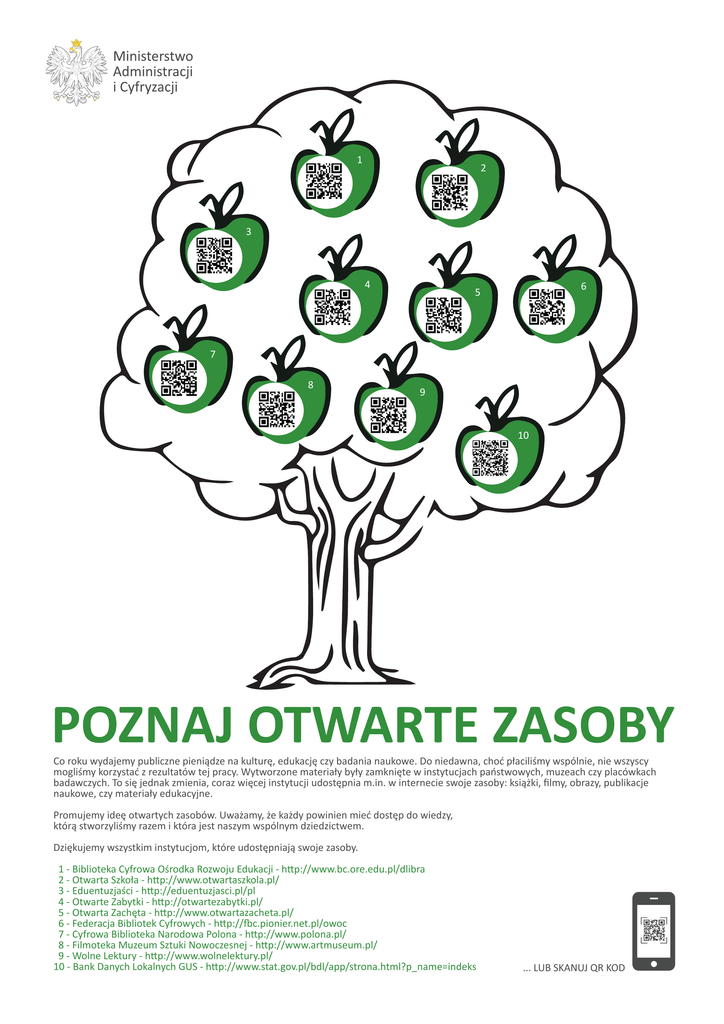 1 2 3 4 6 5 7 8 9 10 POZNAJ OTWARTE ZASOBY Co roku wydajemy publiczne pieniądze na kulturę, edukację czy badania naukowe. Do niedawna, choć płaciliśmy wspólnie, nie wszyscy mogliśmy korzystać z rezultatów tej pracy. Wytworzone materiały były zamknięte w instytucjach państwowych, muzeach czy placówkach badawczych. To się jednak zmienia, coraz więcej instytucji udostępnia m.in. w internecie swoje zasoby: książki, filmy, obrazy, publikacje naukowe, czy materiały edukacyjne. Promujemy ideę otwartych zasobów. Uważamy, że każdy powinien mieć dostęp do wiedzy, którą stworzyliśmy razem i która jest naszym wspólnym dziedzictwem. Dziękujemy wszystkim instytucjom, które udostępniają swoje zasoby. 1 - Biblioteka Cyfrowa Ośrodka Rozwoju Edukacji - http://www.bc.ore.edu.pl/dlibra 2 - Otwarta Szkoła - http://www.otwartaszkola.pl/ 3 - Eduentuzjaści - http://eduentuzjasci.pl/pl 4 - Otwarte Zabytki - http://otwartezabytki.pl/ 5 - Otwarta Zachęta - http://www.otwartazacheta.pl/ 6 - Federacja Bibliotek Cyfrowych - http://fbc.pionier.net.pl/owoc 7 - Cyfrowa Biblioteka Narodowa Polona - http://www.polona.pl/ 8 - Filmoteka Muzeum Sztuki Nowoczesnej - http://www.artmuseum.pl/ 9 - Wolne Lektury - http://www.wolnelektury.pl/ 10 - Bank Danych Lokalnych GUS - http://www.stat.gov.pl/bdl/app/strona.html?p_name=indeks ... LUB SKANUJ QR KOD