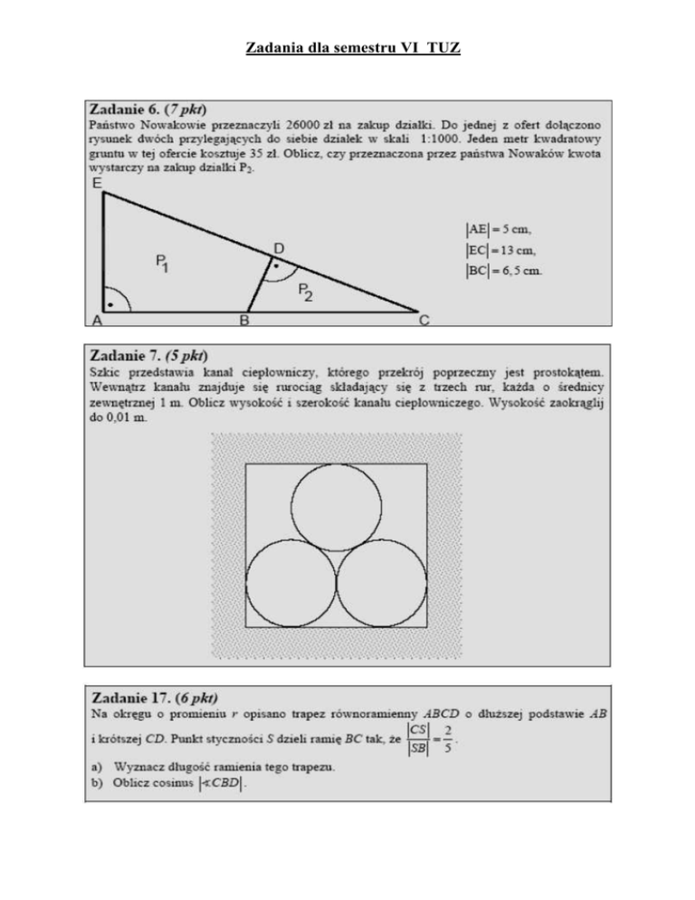 Zadania dla semestru VI TUZ 5. W graniastosłupie prawidłowym trójkątnym poprowadzono płaszczyznę pi, wyznaczoną przez krawędź dolnej podstawy i przeciwległy wierzchołek górnej podstawy. Płaszczyzna ta z płaszczyzną podstawy graniastosłupa tworzy kąt o mierze równej [alfa]. Pole przekroju graniastosłupa wyznaczonego przez płaszczyznę pi jest równe S. Oblicz objętość graniastosłupa. 6. Przekrój stoŜka wyznaczony przez wierzchołek i cięciwę podstawy jest trójkątem równobocznym, o polu równym 9 3 . Płaszczyzna pi, do której naleŜy ten przekrój, tworzy z płaszczyzną podstawy stoŜka kąt , którego sinus jest równy 2/3. Oblicz objętość stoŜka. 7. Stosunek pola powierzchni bocznej stoŜka do pola jego powierzchni całkowitej jest równy s. Oblicz sinus miary kąta pomiędzy tworzącą i średnicą podstawy tego stoŜka. 8. Dany jest ostrosłup prawidłowy czworokątny, w którym długość krawędzi podstawy jest równa długości krawędzi ściany bocznej. Oblicz sinus kąta nachylenia ściany bocznej 6 Odp : sin α = do podstawy. 3 9. Objętość kuli i stoŜka wynosi 6. Promień podstawy stoŜka jest równy promieniowi kuli i jest 3 razy mniejszy od wysokości stoŜka. Oblicz pole powierzchni całkowitej stoŜka i kuli. 10. Podstawą graniastosłupa czworokątnego prostego jest romb o kącie ostrym równym 45 stopni. DłuŜsza przekątna graniastosłupa jest nachylona do przekątnej podstawy pod kątem 30% i ma miarę m. Oblicz pole powierzchni i objętość graniastosłupa. 11. Czworościan foremny przecięto płaszczyzną przechodzącą przez krawędź boczną i wysokość podstawy. Jako przekrój otrzymano trójkąt o polu równym . Oblicz objętość tego czworościanu. Odpowiedź: 12. W stoŜku tworząca o długości 16 jest nachylona do powierzchni podstawy pod katem, 4 którego tangens jest równy . Oblicz stosunek pola powierzchni bocznej do pola 3 podstawy tego stoŜka. 13. Prostokątny arkusz blachy o wymiarach 40 cm na 60 cm jest rozwinięciem powierzchni bocznej walca. Oblicz objętość walca, którego wysokość jest równa krótszemu bokowi prostokąta. 14. Objętość prostopadłościanu, którego wysokość ma długość 10 cm, równa się 480 cm3. Stosunek długości krawędzi podstawy wynosi 3 : 4. Wyznacz miarę kata nachylenia przekątnej prostopadłościanu do płaszczyzny podstawy. Sporządź rysunek prostopadłościanu i zaznacz szukany kat. 15. Krawędź podstawy ostrosłupa prawidłowego czworokątnego ma długość 6 cm. Pole powierzchni całkowitej tego ostrosłupa jest równe 108 cm2. Wyznacz miarę kata nachylenia ściany bocznej do płaszczyzny podstawy. Sporządź rysunek ostrosłupa i zaznacz szukany kat. 16. Agnieszka, planując wycieczkę za miasto, postanowiła kupić termos. W sklepie były dwa rodzaje termosów: białe i czerwone. Biały termos miał średnice dwa razy większą niŜ czerwony, ale za to był dwa razy niŜszy. a) Który z termosów ma większą pojemność? Odpowiedz uzasadnij. b) Pojemność czerwonego termosu jest równa 0,75 litra. Jaka jest pojemność białego termosu? 17. Podstawa prostopadłościennego klocka ma wymiary 4 i 6cm. Jego pole powierzchni ma 108 cm2. Ile wynosi długość jego przekątnej? Jaki kąt ona tworzy z przekątną podstawy? 18. Podstawą prostopadłościanu jest kwadrat o boku 3cm. Przekątna prostopadłościanu tworzy z płaszczyzną podstawy kąt o mierze 60°. Oblicz objętość tego prostopadłościanu. 19. Przekrój osiowy stoŜka jest trójkątem prostokątnym o przeciwprostokątnej równej 16. Oblicz pole powierzchni bocznej tego stoŜka? 20. Dany jest ostrosłup prawidłowy czworokątny o wszystkich krawędziach równych 8. Oblicz pole powierzchni bocznej tego ostrosłupa. 21. Przekątna przekroju osiowego walca jest nachylona do podstawy walca pod kątem alfa, takim Ŝe tg alfa =2/3. Promień podstawy walca ma długość 24. Wyznacz pole powierzchni bocznej tego walca. 22. W kulę o promieniu długości R=6,5 wpisano walec o promieniu podstawy r=6.Oblicz wymiary przekroju osiowego tego walca.