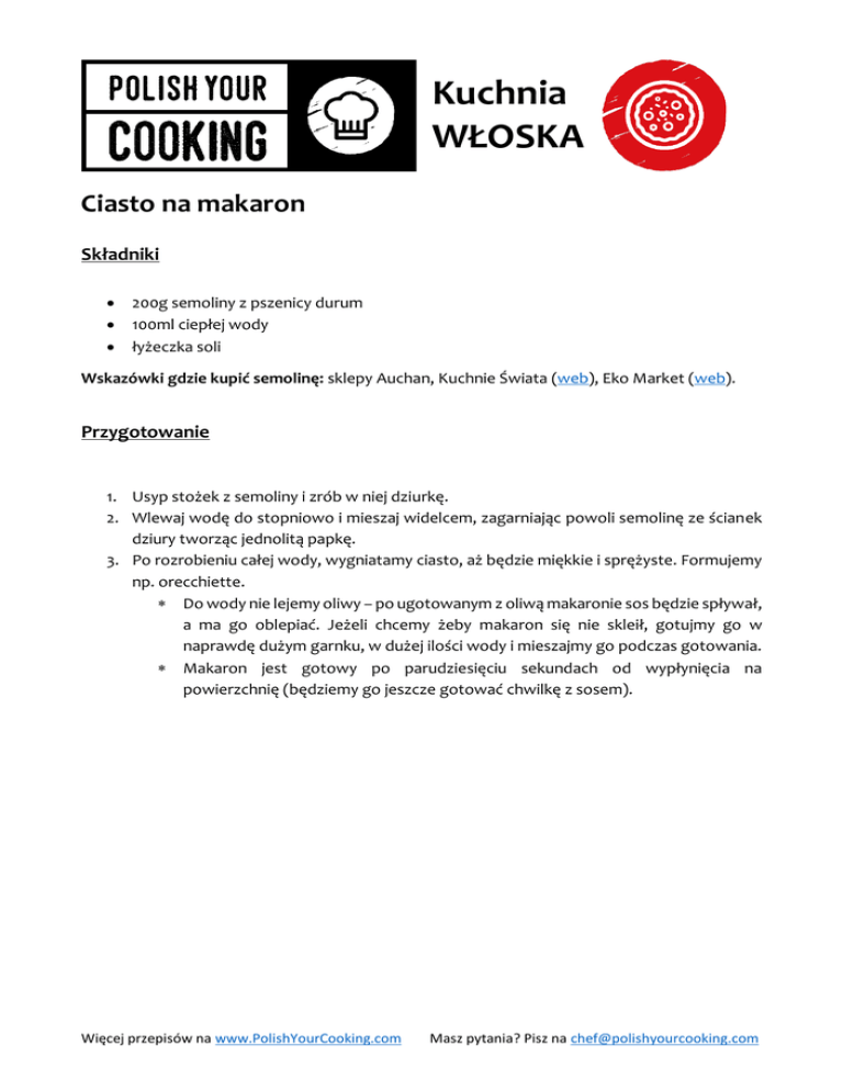 Kuchnia WŁOSKA Ciasto na makaron Składniki 200g semoliny z pszenicy durum 100ml ciepłej wody łyżeczka soli Wskazówki gdzie kupić semolinę: sklepy Auchan, Kuchnie Świata (web), Eko Market (web). Przygotowanie 1. Usyp stożek z semoliny i zrób w niej dziurkę. 2. Wlewaj wodę do stopniowo i mieszaj widelcem, zagarniając powoli semolinę ze ścianek dziury tworząc jednolitą papkę. 3. Po rozrobieniu całej wody, wygniatamy ciasto, aż będzie miękkie i sprężyste. Formujemy np. orecchiette. Do wody nie lejemy oliwy – po ugotowanym z oliwą makaronie sos będzie spływał, a ma go oblepiać. Jeżeli chcemy żeby makaron się nie skleił, gotujmy go w naprawdę dużym garnku, w dużej ilości wody i mieszajmy go podczas gotowania. Makaron jest gotowy po parudziesięciu sekundach od wypłynięcia na powierzchnię (będziemy go jeszcze gotować chwilkę z sosem). Więcej przepisów na www.PolishYourCooking.com Masz pytania? Pisz na [email protected] Pasta Puttanesca Składniki 400g całych, obranych pomidorów lub krojone pomidory w puszcze 100ml wody 2 ząbki czosnku 1 papryczka peperoncino 1 łyżeczka sushonego oregano 4-5 filetów z sardeli (anchois) 2 łyżki czarnych oliwek 1 łyżeczka kaparów 20g tartego sera pecorino 4 łyżki oliwy z oliwek sól, pieprz łyżka natki pietruszki Przygotowanie 1. 2. 3. 4. 5. 6. 7. 8. 9. Rozgniatamy czosnek i w łupinie smażymy go na oliwie, aż zmięknie. Rozkrawamy papryczkę i pozwalamy jej również oddać swój aromat oliwie, przez 2-3 minuty. Zdejmujemy papryczkę i czosnek z ognia. Wrzucamy sardele, które rozcieramy możliwie najdrobniej łyżką na patelni. Kiedy już sardele rozpadną się na atomy. Dorzucamy pomidory, oregano i wodę. Rozgniatamy pomidory i gotujemy 10 minut. Wrzucamy pokrojone kapary i oliwki i gotujemy aż pomidory się rozpadną i sos zgęstnieje. Doprawiamy solą i pieprzem. Wrzucamy makaron na patelnię, dodajemy trochę wody z makaronu i gotujemy 2-3 minuty. Podajemy posypując pietruszką, tartym parmezanem. Jeżeli mamy pod ręką ryby lub owoce morza, przesmażamy je na mocnym ogniu na oliwie i kładziemy na górze gotowej pasty. Aby całość poszła gładko, popijamy wytrawnym czerwonym winem. Buon appetito! Więcej przepisów na www.PolishYourCooking.com Masz pytania? Pisz na [email protected]