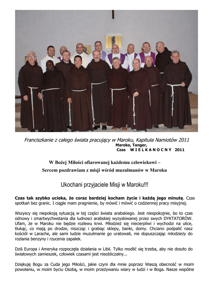 Franciszkanie z całego świata pracujący w Maroku, Kapituła Namiotów 2011 Maroko, Tanger, Czas W I E L K A N O C N Y 2011 W Bożej Miłości ofiarowanej każdemu człowiekowi – Sercem pozdrawiam z misji wśród muzułmanów w Maroku Ukochani przyjaciele Misji w Maroku!!! Czas tak szybko ucieka, że coraz bardziej kocham życie i każdą jego minutę. Czas spotkań bez granic. I ciągle mam pragnienie, by mówić i mówić o codziennej pracy misyjnej. Wszyscy się niepokoją sytuacją w tej części świata arabskiego. Jest niespokojnie, bo to czas odnowy i zmartwychwstania dla ludnosci arabskiej wyzyskiwanej przez swych DYKTATORÓW. Ufam, że w Maroku nie będzie rozlewu krwi. Młodzież się niecierpliwi i wychodzi na ulice, tłukąc, co mają po drodze, niszcząc i grabiąc sklepy, banki, domy. Chciano podpalić nasz kościół w Larache, ale sami ludzie muzułmanie go uratowali, nie dopuszczając młodzieży do rozlania benzyny i rzucenia zapałek. Dziś Europa i Ameryka rozpoczęła działania w Libii. Tylko modlić się trzeba, aby nie doszło do światowych zamieszek, człowiek czasami jest nieobliczalny... WIADOMOŒCI paŸdziernik/20 Dziękuję Bogu za Cuda jego Miłości, jakie czyni dla mnie poprzez Waszą obecność w moim powołaniu, w moim byciu Osobą, w moim przeżywaniu wiary w ludzi i w Boga. Nasze wspólne drogi, którymi nieustannie ON nas prowadzi, to niesamowite szukanie oddania i KOCHANIA, pragnienie serca i miłości. Jestem na PUSTYNI mego serca, opuściłem na kilka dni Tanger, aby zobaczyć siebie lepiej i bliżej... Wiem, że jestem ten sam, ale w intymności potrzebne są chwile, aby ZOBACZYĊ LEPIEJ, POWIEDZIECĊ SOBIE DOGŁĘBNIEJ, ZROZUMIEĆ SIEBIE I DRUGIEGO W PEŁNI PRAWDY. Jestem w Karmelu, w Zakonie kontemplacyjnym Sióstr Karmelitanek. jest ich tylko 4: 2 Hiszpanki, Afrykanka z Liberii i Portugalka. W miejscu modlitwy, tak bardzo proszę za Wami i naszym światem. Przygotowuje serce do ZMARTWYCHWSTANIA, ZAORANIA GLEBY SERCA, aby wydala dobre plony na to lato i ten rok Boży... Jestem z sobą i z tym, co tworzy moje życie. Wasze życie rzeźbiło i rzeźbi moją duszę... Wasza obecność uczyniła i czyni ŻYCIE WARTYM ŻYCIA, i UPIĘKSZA je tak bardzo, że powtarzam bez końca: ŻYCIE JEST PIĘKNE. Jestem w Maroku, pośród moich braci muzułmanów. Pragnę BYĊ I ŻYĊ w PEŁNI, odkrywać Boże myśli, co do mnie i co do innych. Dziękuję Bogu za powołanie bycia i miłowania muzułmanów. Jestem, to najwazniejsze. Jestem, aby KOCHAĆ. Cały dzień, to moja największa praca, służba, modlitwa. Dziękuję za wspólne pielgrzymowanie, za modlitwę, za bycie razem. Każdy czas jest MIŁOWANIEM OSÓB, które nas otaczają, które szukają u nas dobrego słowa, pomocy, wsparcia. Zawsze, kiedy innym przybliżymy niebo to jest MIŁOŚĆ. Symeon Stachera ofm 55 Rue Sidi Bouabid 90000 Tanger Maroko - Maroc [email protected] Niech RADOŚĆ ZMARTWYCHWSTAŁEGO NAPEŁNIA NAS ufnością, że nasze życie jest DROGĄ, po której inni dochodzą do Nieba, że nasz uśmiech jest PROMIENIEM BOŻEGO MIŁOSIERDZIA, że nasza modlitwa jest siłą DUCHA dla innych. W Maryi – Matce Pięknej Miłości: symeon