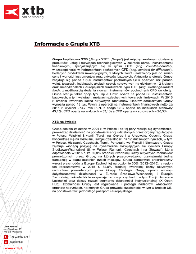 Informacje o Grupie XTB Grupa kapitałowa XTB („Grupa XTB”, „Grupa”) jest międzynarodowym dostawcą produktów, usług i rozwiązań technologicznych w zakresie obrotu instrumentami finansowymi, specjalizującym się w rynku OTC (ang. over-the-counter), w szczególności w instrumentach pochodnych CFD (ang. contract for difference), będących produktami inwestycyjnymi, z których zwrot uzależniony jest od zmian ceny i wartości instrumentów oraz aktywów bazowych. Aktualnie w ofercie Grupy znajduje się ponad 1.500 instrumentów pochodnych CFD opartych na: parach walut, towarach, indeksach, akcjach spółek notowanych na giełdach w 12 krajach oraz amerykańskich i europejskich funduszach typu ETF (ang. exchange-traded fund), z możliwością dodania nowych instrumentów pochodnych CFD do oferty. Grupa oferuje także opcje typu Up & Down oparte na ponad 30 instrumentach bazowych, w tym walutach, metalach szlachetnych, towarach i indeksach. W 2015 r. średnia kwartalna liczba aktywnych rachunków klientów detalicznych Grupy wynosiła ponad 15 tys. Wynik z operacji na instrumentach finansowych netto za 2015 r. wyniósł 274,7 mln PLN, z czego CFD oparte na indeksach stanowiły 43,1%, CFD oparte na walutach – 33,1% a CFD oparte na surowcach – 26,5%. XTB na świecie Grupa została założona w 2004 r. w Polsce i od tej pory rozwija się dynamicznie, prowadząc działalność na podstawie licencji udzielonych przez organy regulacyjne w Polsce, Wielkiej Brytanii, Turcji, na Cyprze i w Urugwaju. Obecnie Grupa koncentruje się na rozwijaniu swojej działalności na 12 kluczowych rynkach, w tym w Polsce, Hiszpanii, Czechach, Turcji, Portugalii, we Francji i Niemczech. Grupa zajmuje wiodącą pozycję na dynamicznie rozwijających się rynkach Europy Środkowo-Wschodniej (tj. w Polsce, Rumunii, Czechach i na Słowacji), która odpowiadała w 2015 r. za 60,8% średniej kwartalnej liczby aktywnych rachunków prowadzonych przez Grupę, na których przeprowadzono przynajmniej jedną transakcję w ciągu ostatnich trzech miesięcy. Grupa zanotowała średnioroczny wzrost przychodów z Europy Zachodniej na poziomie 30% (2012–2015), a region ten reprezentował w 2015 r. 32,8% średniej kwartalnej liczby aktywnych rachunków prowadzonych przez Grupę. Strategia Grupy, oprócz rozwoju dotychczasowej działalności w Europie Środkowo-Wschodniej i Europie Zachodniej, zakłada także ekspansję na nowych rynkach, w tym Turcji i Ameryce Łacińskiej oraz dalszy rozwój segmentu działalności instytucjonalnej (X Open Hub). Działalność Grupy jest regulowana i podlega nadzorowi właściwych organów na rynkach, na których Grupa prowadzi działalność, w tym w krajach UE, na podstawie tzw. jednolitego paszportu europejskiego. XTB Polska ul. Ogrodowa 58 00-876 Warszawa +48 222 019 570 [email protected] www.xtb.pl Obecność Grupy XTB w Europie i strategia rozwoju na rynku Ameryki Łacińskiej Uruguay Grupa cieszy się uznaniem za innowacyjność oraz jakość oferowanych produktów, usług i technologii, zdobywając różne nagrody w Polsce i UE, w tym nagrodę „Gazety Giełdy Parkiet” za najlepszą platformę FX. Na dzień 31 grudnia 2015 r. Grupa zatrudniała 392 osoby. W Polsce ulokowano kluczowy zespół programistów skupiony na wzmacnianiu przewag konkurencyjnych rozwiązań technologicznych oferowanych przez Grupę. Grupa ma duże doświadczenie w rozwijaniu i wprowadzaniu innowacyjnych produktów. W 2009 r. Grupa wprowadziła instrumenty pochodne typu Equity CFD DMA na akcje spółek giełdowych. W 2013 r. Grupa była jednym z pierwszych podmiotów na rynkach europejskich, które wprowadziły opracowany przez siebie system inwestowania społecznościowego (ang. social trading) jako regulowaną usługę zarządzania aktywami, która pozwala klientom na naśladowanie transakcji realizowanych przez innych klientów. W 2014 r. wprowadzony został xRisk – autorskie rozwiązanie do zarządzania ryzykiem rynkowym. Grupa jest także dostawcą technologii transakcyjnych oraz płynności dla klientów instytucjonalnych, brokerów i start-upów, stanowiących część jej segmentu działalności instytucjonalnej. Zdaniem Zarządu Spółki, internetowe platformy transakcyjne XTB zapewniają rzetelną, szybką i efektywną realizację transakcji. Wyjątkowe cechy funkcjonalne platformy transakcyjnej xStation pozwalają uniknąć konieczności konkurowania jedynie poziomem oferowanej ceny produktów i usług. Obecnie Grupa jest w stanie przetwarzać ponad 30.000 zleceń na minutę. Przeciętny czas realizacji transakcji od momentu złożenia zlecenia do otrzymania potwierdzenia jego realizacji wynosi mniej niż 60 milisekund. Grupa oferuje swoim klientom różne możliwości zawierania transakcji, w zależności od poziomu zaawansowania klienta (od początkującego do eksperta) i metody dostępu (od smartfonów poprzez interfejsy sieciowe do aplikacji ściąganych na komputer stacjonarny). Ponadto, aplikacje oferowane przez Grupę dostarczają klientom detalicznym i instytucjonalnym użytecznych i zróżnicowanych narzędzi, obejmujących wykresy, analizy, badania i szkolenia online. XTB Polska ul. Ogrodowa 58 00-876 Warszawa +48 222 019 570 [email protected] www.xtb.pl Do reklamowania swojej działalności i zwiększania bazy klientów Grupa wykorzystuje kanały marketingowe zarówno online, jak i offline. Czynnikiem wyróżniającym Grupę i umożliwiającym jej dalsze zwiększanie swojego udziału rynkowego jest zespół ponad 110 specjalistów zajmujących się sprzedażą bezpośrednią i marketingiem we wszystkich krajach, w których Grupa działa. Działalność marketingową Grupy wspierają wysoka jakość obsługi oraz inicjatywy na rzecz klientów detalicznych, takie jak handel społecznościowy (za pośrednictwem xSocial) i portal edukacyjny Trading Academy, które przyczyniają się do stałego wzrostu wolumenu obrotów, utrzymania istniejących klientów i stabilnego napływu