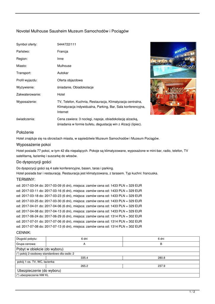Novotel Mulhouse Sausheim Muzeum Samochodów i Pociągów Symbol oferty: 5444722/111 Państwo: Francja Region: Inne Miasto: Mulhouse Transport: Autokar Profil wyjazdu: Oferta objazdowa Wyżywienie: śniadanie, Obiadokolacje Zakwaterowanie: Hotel Wyposażenie: TV, Telefon, Kuchnia, Restauracja, Klimatyzacja centralna, Klimatyzacja indywidualna, Parking, Bar, Sala konferencyjna, Internet świadczenia: Cena zawiera: 3 noclegi, napoje, obiadokolację alzacką, śniadania w formie bufetu, degustację win z Alzacji (lipiec). Położenie Hotel znajduje się na obrzeżach miasta, w sąsiedztwie Muzeum Samochodów i Muzeum Pociągów. Wyposażenie pokoi Hotel posiada 77 pokoi, w tym 42 dla niepalących. Pokoje są klimatyzowane, wyposażone w mini-bar, radio, telefon, TV satelitarną, łazienkę i suszarkę do włosów. Do dyspozycji gości Do dyspozycji gości są 4 sale konferencyjne, basen, taras i parking. Hotel posiada bar i restaurację. Restauracja jest klimatyzowana, z tarasem. Typ kuchni: francuska. TERMINY: od: 2017-03-04 do: 2017-03-09 (6 dni), miejsca: zamów cena od: 1433 PLN = 329 EUR od: 2017-03-11 do: 2017-03-16 (6 dni), miejsca: zamów cena od: 1433 PLN = 329 EUR od: 2017-03-18 do: 2017-03-23 (6 dni), miejsca: zamów cena od: 1433 PLN = 329 EUR od: 2017-03-25 do: 2017-03-30 (6 dni), miejsca: zamów cena od: 1433 PLN = 329 EUR od: 2017-04-01 do: 2017-04-06 (6 dni), miejsca: zamów cena od: 1433 PLN = 329 EUR od: 2017-04-08 do: 2017-04-13 (6 dni), miejsca: zamów cena od: 1433 PLN = 329 EUR od: 2017-06-24 do: 2017-06-29 (6 dni), miejsca: zamów cena od: 1314 PLN = 302 EUR od: 2017-07-01 do: 2017-07-06 (6 dni), miejsca: zamów cena od: 1314 PLN = 302 EUR od: 2017-07-08 do: 2017-07-13 (6 dni), miejsca: zamów cena od: 1314 PLN = 302 EUR CENNIK: Długość pobytu: 6 dni 6 dni Grupa cenowa: A B 335.4 280.8 265.2 237.9 Pobyt w obiekcie (do wyboru) (*) pokój 2-osobowy standardowo dla osób: 2 pokój 1-os. TV, WC, łazienka Ubezpieczenie (do wyboru) (*) ubezpieczenie NW KL 1/2 Transport - wyjazd (do wyboru) (*) autokar Alzacja 6 6 155 155 Waluta: EUR Aktualne ceny z systemu S.A.R.T. (-) - cena usługi, podatku kalkulowana przy osobie lub gratis (*) - kwota wliczona w cenę standardową 2/2