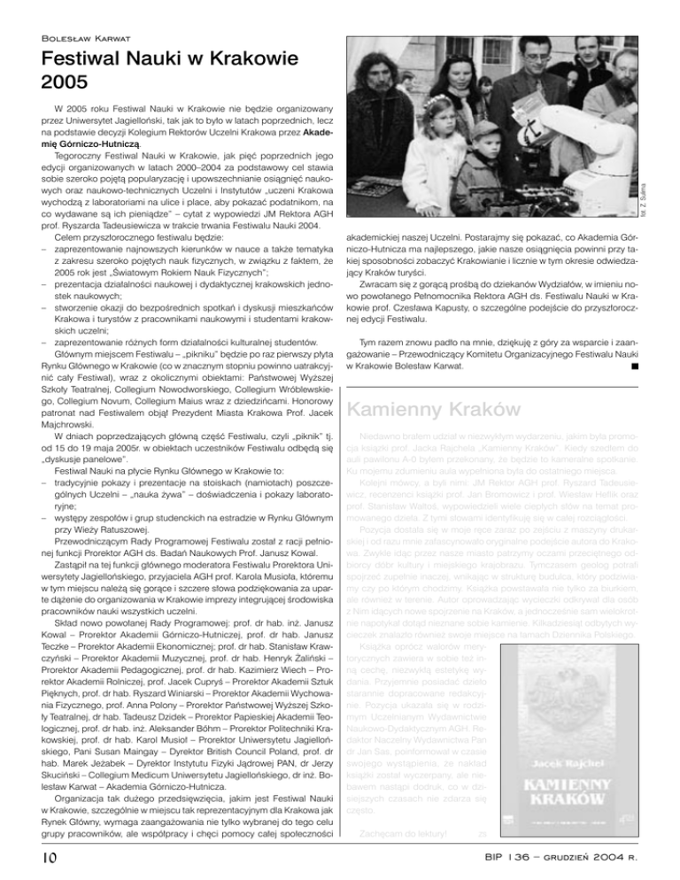 Bolesław Karwat W 2005 roku Festiwal Nauki w Krakowie nie będzie organizowany przez Uniwersytet Jagielloński, tak jak to było w latach poprzednich, lecz na podstawie decyzji Kolegium Rektorów Uczelni Krakowa przez Akademię Górniczo-Hutniczą. Tegoroczny Festiwal Nauki w Krakowie, jak pięć poprzednich jego edycji organizowanych w latach 2000–2004 za podstawowy cel stawia sobie szeroko pojętą popularyzację i upowszechnianie osiągnięć naukowych oraz naukowo-technicznych Uczelni i Instytutów „uczeni Krakowa wychodzą z laboratoriami na ulice i place, aby pokazać podatnikom, na co wydawane są ich pieniądze” – cytat z wypowiedzi JM Rektora AGH prof. Ryszarda Tadeusiewicza w trakcie trwania Festiwalu Nauki 2004. Celem przyszłorocznego festiwalu będzie: – zaprezentowanie najnowszych kierunków w nauce a także tematyka z zakresu szeroko pojętych nauk fizycznych, w związku z faktem, że 2005 rok jest „Światowym Rokiem Nauk Fizycznych”; – prezentacja działalności naukowej i dydaktycznej krakowskich jednostek naukowych; – stworzenie okazji do bezpośrednich spotkań i dyskusji mieszkańców Krakowa i turystów z pracownikami naukowymi i studentami krakowskich uczelni; – zaprezentowanie różnych form działalności kulturalnej studentów. Głównym miejscem Festiwalu – „pikniku” będzie po raz pierwszy płyta Rynku Głównego w Krakowie (co w znacznym stopniu powinno uatrakcyjnić cały Festiwal), wraz z okolicznymi obiektami: Państwowej Wyższej Szkoły Teatralnej, Collegium Nowodworskiego, Collegium Wróblewskiego, Collegium Novum, Collegium Maius wraz z dziedzińcami. Honorowy patronat nad Festiwalem objął Prezydent Miasta Krakowa Prof. Jacek Majchrowski. W dniach poprzedzających główną część Festiwalu, czyli „piknik” tj. od 15 do 19 maja 2005r. w obiektach uczestników Festiwalu odbędą się „dyskusje panelowe”. Festiwal Nauki na płycie Rynku Głównego w Krakowie to: – tradycyjnie pokazy i prezentacje na stoiskach (namiotach) poszczególnych Uczelni – „nauka żywa” – doświadczenia i pokazy laboratoryjne; – występy zespołów i grup studenckich na estradzie w Rynku Głównym przy Wieży Ratuszowej. Przewodniczącym Rady Programowej Festiwalu został z racji pełnionej funkcji Prorektor AGH ds. Badań Naukowych Prof. Janusz Kowal. Zastąpił na tej funkcji głównego moderatora Festiwalu Prorektora Uniwersytety Jagiellońskiego, przyjaciela AGH prof. Karola Musioła, któremu w tym miejscu należą się gorące i szczere słowa podziękowania za uparte dążenie do organizowania w Krakowie imprezy integrującej środowiska pracowników nauki wszystkich uczelni. Skład nowo powołanej Rady Programowej: prof. dr hab. inż. Janusz Kowal – Prorektor Akademii Górniczo-Hutniczej, prof. dr hab. Janusz Teczke – Prorektor Akademii Ekonomicznej; prof. dr hab. Stanisław Krawczyński – Prorektor Akademii Muzycznej, prof. dr hab. Henryk Żaliński – Prorektor Akademii Pedagogicznej, prof. dr hab. Kazimierz Wiech – Prorektor Akademii Rolniczej, prof. Jacek Cupryś – Prorektor Akademii Sztuk Pięknych, prof. dr hab. Ryszard Winiarski – Prorektor Akademii Wychowania Fizycznego, prof. Anna Polony – Prorektor Państwowej Wyższej Szkoły Teatralnej, dr hab. Tadeusz Dzidek – Prorektor Papieskiej Akademii Teologicznej, prof. dr hab. inż. Aleksander Bőhm – Prorektor Politechniki Krakowskiej, prof. dr hab. Karol Musioł – Prorektor Uniwersytetu Jagiellońskiego, Pani Susan Maingay – Dyrektor British Council Poland, prof. dr hab. Marek Jeżabek – Dyrektor Instytutu Fizyki Jądrowej PAN, dr Jerzy Skuciński – Collegium Medicum Uniwersytetu Jagiellońskiego, dr inż. Bolesław Karwat – Akademia Górniczo-Hutnicza. Organizacja tak dużego przedsięwzięcia, jakim jest Festiwal Nauki w Krakowie, szczególnie w miejscu tak reprezentacyjnym dla Krakowa jak Rynek Główny, wymaga zaangażowania nie tylko wybranej do tego celu grupy pracowników, ale współpracy i chęci pomocy całej społeczności 10 fot. Z. Sulima Festiwal Nauki w Krakowie 2005 akademickiej naszej Uczelni. Postarajmy się pokazać, co Akademia Górniczo-Hutnicza ma najlepszego, jakie nasze osiągnięcia powinni przy takiej sposobności zobaczyć Krakowianie i licznie w tym okresie odwiedzający Kraków turyści. Zwracam się z gorącą prośbą do dziekanów Wydziałów, w imieniu nowo powołanego Pełnomocnika Rektora AGH ds. Festiwalu Nauki w Krakowie prof. Czesława Kapusty, o szczególne podejście do przyszłorocznej edycji Festiwalu. Tym razem znowu padło na mnie, dziękuję z góry za wsparcie i zaangażowanie – Przewodniczący Komitetu Organizacyjnego Festiwalu Nauki w Krakowie Bolesław Karwat. Kamienny Kraków Niedawno brałem udział w niezwykłym wydarzeniu, jakim była promocja ksiązki prof. Jacka Rajchela „Kamienny Kraków”. Kiedy szedłem do auli pawilonu A-0 byłem przekonany, że będzie to kameralne spotkanie. Ku mojemu zdumieniu aula wypełniona była do ostatniego miejsca. Kolejni mówcy, a byli nimi: JM Rektor AGH prof. Ryszard Tadeusiewicz, recenzenci książki prof. Jan Bromowicz i prof. Wiesław Heflik oraz prof. Stanisław Waltoś, wypowiedzieli wiele ciepłych słów na temat promowanego dzieła. Z tymi słowami identyfikuję się w całej rozciągłości. Pozycja dostała się w moje ręce zaraz po zejściu z maszyny drukarskiej i od razu mnie zafascynowało oryginalne podejście autora do Krakowa. Zwykle idąc przez nasze miasto patrzymy oczami przeciętnego odbiorcy dóbr kultury i miejskiego krajobrazu. Tymczasem geolog potrafi spojrzeć zupełnie inaczej, wnikając w strukturę budulca, który podziwiamy czy po którym chodzimy. Książka powstawała nie tylko za biurkiem, ale również w terenie. Autor oprowadzając wycieczki odkrywał dla osób z Nim idących nowe spojrzenie na Kraków, a jednocześnie sam wielokrotnie napotykał dotąd nieznane sobie kamienie. Kilkadziesiąt odbytych wycieczek zn
