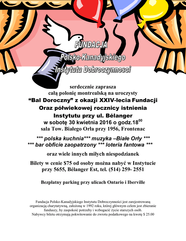 serdecznie zaprasza całą polonię montrealską na uroczysty “Bal Doroczny” z okazji XXIV-lecia Fundacji Oraz półwiekowej rocznicy istnienia Instytutu przy ul. Bélanger w sobotę 30 kwietnia 2016 o godz.1800 sala Tow. Białego Orła przy 1956, Frontenac *** polska kuchnia*** muzyka –Białe Orły *** *** bar obficie zaopatrzony *** loteria fantowa *** oraz wiele innych miłych niespodzianek Bilety w cenie $75 od osoby można nabyć w Instytucie przy 5655, Bélanger Est, tel. (514) 259- 2551 Bezpłatny parking przy ulicach Ontario i Iberville Fundacja Polsko-Kanadyjskiego Instytutu Dobroczynności jest zarejestrowaną organizacją charytatywną, założoną w 1992 roku, której głównym celem jest zbieranie funduszy, by zaspokoić potrzeby i wzbogacić życie starszych osób. Nabywcy biletu otrzymają pokwitowanie do zwrotu podatkowego na kwotę $ 25.00 vous invite cordialement au BAL ANNUEL DE LEVÉE DE FONDS Samedi, le 05 février 2011 Cocktail : 18h Souper: 19h Lieu : Société de l’Aigle Blanc Adresse : 1956, rue Frontenac, Montréal BILLETS : $60 / pers. DISPONIBLES À L’INSTITUT CANADIEN-POLONAIS 5655 Est, rue Bélanger, Montréal Tél.: 514-259-2551 (poste: 59 ou 21) Stationnement gratuit sur Iberville près de la rue Ontario / Métro : Frontenac La Fondation, créée en 1992, est un organisme enregistré à but non lucratif dont l’objectif principal est de ramasser des fonds afin d’enrichir la vie des résidants âgés de l’Institut. Un reçu de $25 pour fins d’impôts sera émis pour chaque billet acheté à $60. ******************************************************************** Cordially invites YOU to its “ANNUAL DINNER DANCE FUNDRAISER” Saturday, February 5, 2011 6 P.M.- Cocktails – 7 P.M.- Dinner WHITE EAGLE SOCIETY “DOM POLSKI” HALL 1956 Frontenac Str., Montreal TICKETS $60 per person AVAILABLE AT THE INSTITUTE 5655 Belanger East, tel. 514-259-2551 (Ext. 59 or 21) Free parking – Iberville near Ontario Street / Metro Frontenac The Foundation of the Canadian-Polish Welfare Institute is a registered charitable organization, established in 1992, whose main goal is to raise funds to meet the needs and enrich the lives of its elderly residents. An Income Tax receipt for $25 will be issued for each $60 ticket purchased. serdecznie zaprasza całą polonię montrealską na uroczysty “Bal Doroczny” w rocznicę XIX-lecia w sobotę 05 lutego 2011 o godz.18:00 sala Tow. Białego Orła przy 1956, Frontenac *** polska kuchnia*** muzyka –Retro-Styl *** *** bar obficie zaopatrzony *** loteria fantowa *** oraz wiele innych miłych niespodzianek Bilety w cenie $60 od osoby można nabyć w Instytucie przy 5655, Bélanger Est, tel. (514) 259- 2551 Bezpłatny parking przy ulicach Ontario i Iberville Fundacja Polsko-Kanadyjskiego Instytutu Dobroczynności jest zarejestrowaną organizacją charytatywną, założoną w 1992 roku, której głównym celem jest zbieranie funduszy, by zaspokoić potrzeby i wzbogacić życie starszych osób. Nabywcy biletu otrzymają pokwitowanie do zwrotu podatkowego na kwotę $ 25.00 vous invite cordialement au BAL ANNUEL DE LEVÉE DE FONDS Samedi, le 05 février 2011 Cocktail : 18h Souper: 19h Lieu : Société de l’Aigle Blanc Adresse : 1956, rue Frontenac, Montréal BILLETS : $60 / pers. DISPONIBLES À L’INSTITUT CANADIEN-POLONAIS 5655 Est, rue Bélanger, Montréal Tél.: 514-259-2551 (poste: 59 ou 21) Stationnement gratuit sur Iberville près de la rue Ontario / Métro : Frontenac La Fondation, créée en 1992, est un organisme enregistré à but non lucratif dont l’objectif principal est de ramasser des fonds afin d’enrichir la vie des résidants âgés de l’Institut. Un reçu de $25 pour fins d’impôts sera émis pour chaque billet acheté à $60. ******************************************************************** Cordially invites YOU to its “ANNUAL DINNER DANCE FUNDRAISER” Saturday, February 5, 2011 6 P.M.- Cocktails – 7 P.M.- Dinner WHITE EAGLE SOCIETY “DOM POLSKI” HALL 1956 Frontenac Str., Montreal TICKETS $60 per person AVAILABLE AT THE INSTITUTE 5655 Belanger East, tel. 514-259-2551 (Ext. 59 or 21) Free parking – Iberville near Ontario Street / Metro Frontenac The Foundation of the Canadian-Polish Welfare Institute is a registered charitable organization, established in 1992, whose main goal is to raise funds to meet the needs and enrich the lives of its elderly residents. An Income Tax receipt for $25 will be issued for each $60 ticket purchased.