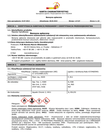 KARTA CHARAKTERYSTYKI Sporządzona zgodnie z Rozporządzeniem UE nr 453/2010 Benzyna apteczna Data sporządzenia: 23.07.2013 Aktualizacja: 28.04.2015 Wersja: 1.0 CLP Strona 1 z 10 SEKCJA 1. IDENTYFIKACJA SUBSTANCJI/MIESZANINY I IDENTYFIKACJA PRZEDSIĘBIORSTWA 1.1. Identyfikator produktu Nazwa handlowa: Benzyna apteczna 1.2. Istotne zidentyfikowane zastosowania substancji lub mieszaniny oraz zastosowania odradzane Benzyna apteczna stosowana jest głównie jako rozpuszczalnik w przemyśle chemicznym, farmaceutycznym, przetwórstwie tworzyw sztucznych, elektronice i innych 1.3.Dane dotyczące dostawcy karty charakterystyki Producent: P.W Marwis Marcin Wiśniewski Adres: 66-015 Zielona Góra, ul. Przylep – Zakładowa 17 Telefon/Faks: +68 47 88 280 / +68 41 35 106 E-Mail: [email protected] 1.4. Numer telefonu alarmowego: +68 47 88 280 (czynny od poniedziałku do piątku w godzinach pracy od 8.00 do 16.00) W nagłych przypadkach: 112 - ogólny telefon alarmowy, 998 - straż pożarna, 999 - pogotowie medyczne SEKCJA 2. IDENTYFIKACJA ZAGROŻEŃ 2.1. Klasyfikacja substancji lub mieszaniny Klasyfikacja zgodna z rozporządzeniem (WE) nr 1272/2008 (CLP): zgodna z dyrektywą Rady 67/548/EWG: wynikające z właściwości fizykochemicznych: Flam. Liq., H225 F, R11 dla człowieka: Asp. Tox. 1, H304 Xi, R38 Skin Irrit. 2, H315 Xn, R65 STOT SE3, H336 R67 Aquatic Chronic 2, H411 N, R51/53 Zagrożenia dla środowiska: 2.2. Elementy oznakowania Piktogram: Hasło ostrzegawcze: Niebezpieczeństwo Zwroty wskazujące rodzaj zagrożenia: H225 - Wysoce łatwopalna ciecz i pary. H304 - Połknięcie i dostanie się przez drogi oddechowe może grozić śmiercią. H315 - Działa drażniąco na skórę. H336 - Może wywoływać uczucie senności lub zawroty głowy. H411 - Działa toksycznie na organizmy wodne, powodując długotrwałe skutki. Zwroty wskazujące środki ostrożności: P210 - Przechowywać z dala od źródeł ciepła/iskrzenia/otwartego ognia/gorących powierzchni. Palenie wzbronione. P280 - Stosować rękawice ochronne/odzież ochronną/ochronę oczu/ochronę twarzy. P301 + P310 - W PRZYPADKU POŁKNIĘCIA: Natychmiast skontaktować się z OŚRODKIEM ZATRUĆ lub z lekarzem. P331 - NIE wywoływać wymiotów. P405 - Przechowywać pod zamknięciem. P501 Zawartość/pojemnik usuwać do upoważnionego odbiorcy odpadów. Produkt zawiera: Węglowodory, C6-C7, n-alkany, izoalkany, cykloalkany, <5% n-heksan; węglowodory, C6, izoalkany, <5% n-heksan KARTA CHARAKTERYSTYKI Sporządzona zgodnie z Rozporządzeniem UE nr 453/2010 Benzyna apteczna Data sporządzenia: 23.07.2013 Aktualizacja: 28.04.2015 Wersja: 1.0 CLP Strona 2 z 10 2.3. Inne zagrożenia Produkt nie spełnia kryteriów PBT lub vPvB zgodnie z załącznikiem XIII Rozporządzenia (WE) nr 1907/2006. SEKCJA 3. SKŁAD/INFORMACJA O SKŁADNIKACH 3.2. Mieszaniny Nazwa substancji /nr rejestracji Nr CAS / Nr WE % wag. Węglowodory, C6-C7, nalkany, izoalkany, cykloalkany, <5% nheksan - ≤75 ≤25 Nr indeksowy Klasyfikacja wg 67/548/EWG Klasyfikacja wg 1272/2008 (CLP) - F; R11 Xi; R38 Xn; R65 R67 N; R51/53 Flam. Liq. 2, H225 Asp. Tox. 1, H304 Skin Irrit. 2, H315 STOT SE 3, H336 Aquatic Chronic 2, H411 - F; R11 Xi; R38 Xn; R65 R67 N; R51/53 Flam. Liq. 2, H225 Asp. Tox. 1, H304 Skin Irrit. 2, H315 STOT SE 3, H336 Aquatic Chronic 2, H411 Carc.1B, H350 921-024-6 01-2119475514-35-XXXX Węglowodory, C6, izoalkany, <5% nheksan 931-254-9 01-2119484651-34-XXXX Opis zwrotów R i H podano w Sekcji 16. SEKCJA 4. ŚRODKI PIERWSZEJ POMOCY 4.1. Opis środków pierwszej pomocy Wdychanie: Poszkodowanego usunąć (wyprowadzić/wynieść) z miejsca narażenia na świeże powietrze; zapewnić spokój i ciepło. W przypadku utraty przytomności, zaburzeń oddychania lub utrzymującego się złego samopoczucia natychmiast zapewnić pomoc lekarską. Kontakt ze skórą: Natychmiast zdjąć zanieczyszczoną/nasiąkniętą odzież i buty. Zanieczyszczoną skórę umyć dokładnie wodą z mydłem lub łagodnym detergentem, a następnie spłukać wodą. W przypadku wystąpienia i utrzymywania się objawów podrażnienia skonsultować się z lekarzem. UWAGA: Zanieczyszczoną odzież usunąć w bezpieczne miejsce z dala od źródeł ciepła i źródeł zapłonu. Kontakt z oczami: Zanieczyszczone oczy natychmiast płukać ciągłym strumieniem wody, usunąć szkła kontaktowe (jeśli są) i kontynuować płukanie przez ok. 15 minut. Podczas płukania trzymać powieki szeroko rozwarte. Nie stosować zbyt silnego strumienia wody, aby nie uszkodzić rogówki. W przypadku wystąpienia i utrzymywania się dolegliwości natychmiast skonsultować się z lekarzem okulistą. Połknięcie: Nie prowokować wymiotów. W przypadku wystąpienia samoistnych wymiotów trzymać poszkodowanego w pozycji nachylonej do przodu z twarzą skierowaną do ziemi, aby zminimalizować ryzyko zachłyśnięcia. Natychmiast wezwać lekarza. 4.2. Najważniejsze ostre i opóźnione objawy oraz skutki narażenia Przypadkowe połknięcie może spowodować aspirację do płuc, zaburzenia żołądkowe (nudności, wymioty, bóle brzucha). Wysokie stężenia produktu mogą wywoływać depresję centralnego układu nerwowego, powodującą bóle głowy, zawroty głowy i nudności. Powtarzające się lub długotrwałe narażenie może powodować wysuszenie, pękanie i przewlekłe stany zapalne skóry. 4.3. Wskazania dotyczące wszelkiej natychmiastowej pomocy lekarskiej i szczególnego postępowania z poszkodowanym Nie prowokować wymiotów i nie podawać niczego doustnie osobie nieprzytomnej. Pokazać kartę charakterystyki KARTA CHARAKTERYSTYKI Sporządzona zgodnie z Rozporządzeniem UE nr 453/2010 Benzyna apteczna Data sporządzenia: 23.07.2013 Aktualizacja: 28.04.2015 Wersja: 1.0 CLP Strona 3 z 10 lub etykietę/opakowanie personelowi medycznemu udzielającemu pomocy. Osoby udzielające pomocy w obszarze o nieznanym stężeniu par/mgły powinny być wyposażone w odpowiednie ochrony dróg oddechowych. Wskazówki dla lekarza: leczen