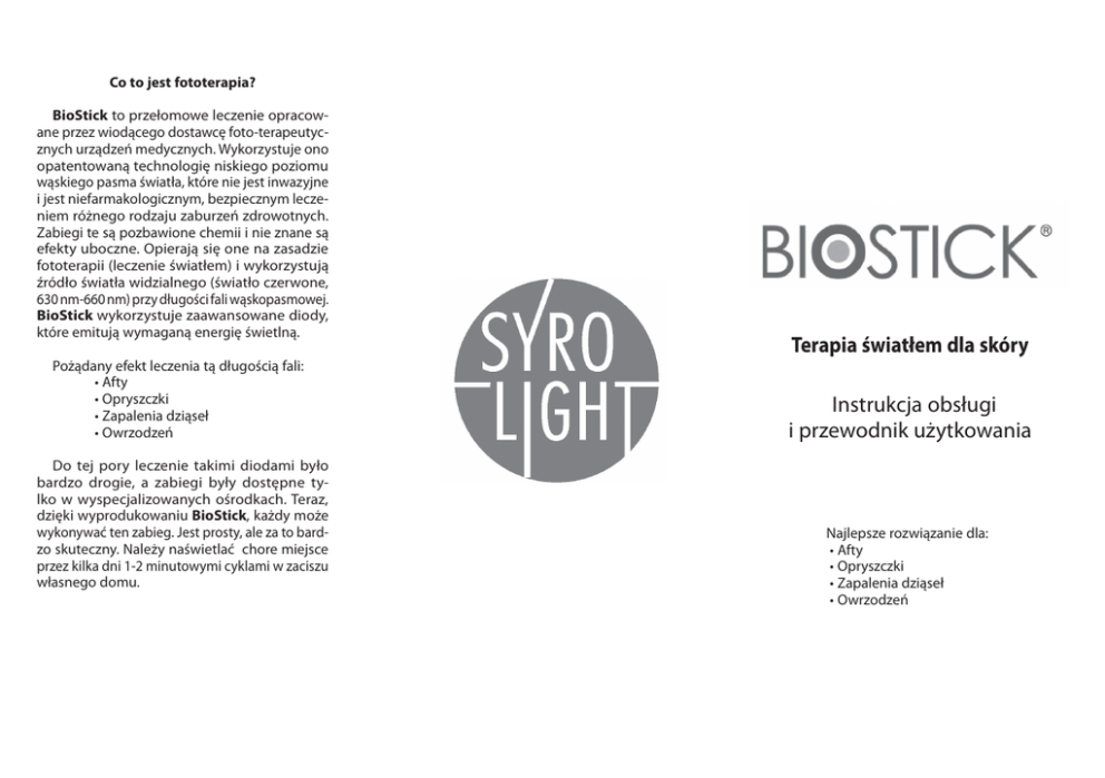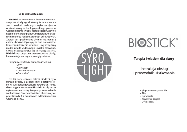 Co to jest fototerapia? BioStick to przełomowe leczenie opracowane przez wiodącego dostawcę foto-terapeutycznych urządzeń medycznych. Wykorzystuje ono opatentowaną technologię niskiego poziomu wąskiego pasma światła, które nie jest inwazyjne i jest niefarmakologicznym, bezpiecznym leczeniem różnego rodzaju zaburzeń zdrowotnych. Zabiegi te są pozbawione chemii i nie znane są efekty uboczne. Opierają się one na zasadzie fototerapii (leczenie światłem) i wykorzystują źródło światła widzialnego (światło czerwone, 630 nm-660 nm) przy długości fali wąskopasmowej. BioStick wykorzystuje zaawansowane diody, które emitują wymaganą energię świetlną. Pożądany efekt leczenia tą długością fali: • Afty • Opryszczki • Zapalenia dziąseł • Owrzodzeń Do tej pory leczenie takimi diodami było bardzo drogie, a zabiegi były dostępne tylko w wyspecjalizowanych ośrodkach. Teraz, dzięki wyprodukowaniu BioStick, każdy może wykonywać ten zabieg. Jest prosty, ale za to bardzo skuteczny. Należy naświetlać chore miejsce przez kilka dni 1-2 minutowymi cyklami w zaciszu własnego domu. Terapia światłem dla skóry Instrukcja obsługi i przewodnik użytkowania Najlepsze rozwiązanie dla: • Afty • Opryszczki • Zapalenia dziąseł • Owrzodzeń Sposób użycia: 1. Usuń BioStick z opakowania. 2. Zdejmij nasadkę u dołu urządzenia i włóż 2 baterie AA w prawidłowej pozycji (baterie nie są dołączone do zestawu). 3. Załóż nasadkę. 4. Aby włączyć urządzenie, należy nacisnąć włącznik ON w górę w kierunku znaku ‘’I’’ 5. Po włączeniu urządzenie zaczyna świecić czerwonym światłem LED. Skutki uboczne, interakcje z lekami, zagrożenia bezpieczeństwa: Czerwone światło emitowane przez BioStick jest całkowicie nieszkodliwe. Nie są znane żadne skutki uboczne korzystania z BioStick trzy razy dziennie. UWAGA: • Nie należy patrzeć bezpośrednio na źródło światła. • Wymagana jest kontrola rodziców w przypadku użytkowania przez dzieci. Czerwone światło nie pali się w pozycji ON/BioStick nie działa ZIELONE światło (wskazuje potrzebę zmiany baterii) OFF/ON przełącznik Zielone światło włącza się Możliwa przyczyna Rozwiązanie 1. Baterie są stare/nie są naładowane 1. Zmień bateria – użyj nowych baterii 2. Baterie są źle włożone 2. Włóż baterie w kolejności jak na rysunku poniżej 3. Przełącznik jest w pozycji OFF 3. Przesuń przełącznik w stronę znaku ‘’I’’ 4. Usterka urządzenia 4. Jeśli wszystkie problemy/rozwiązania nie usuną usterki skontaktuj się ze sprzedawcą 1. Baterie są słabe 1. Baterie musisz wymienić na świeże/nowe Gwarancja 100% satysfakcji Z powodu dystrybucji BioStick do różnych krajów, występują różne gwarancje. W twoim interesie jest skontaktować się ze sprzedawca w celu uzyskania szczegółów gwarancji. Włóż 2AA nowe baterie Leczenie: 1. Włączony BioStick umieść bezpośrednio w miejscu naświetlania i upewnij się że oświetla chore miejsce. 2. Chore miejsce naświetlaj przez1-2 minuty. Jest to jeden cykl leczniczy. 3. Aby rezultat leczenia był najlepszy zaleca się wykonywanie 3 cykli dziennie. 4. Gdy zauważysz pierwsze efekty leczenia, możesz zmniejszyć ilość cykli do 2 dziennie. 5. Po każdym użyciu należy oczyścić końcówkę z diodami łagodnym mydłem i myjką. 6. Nie należy umieszczać urządzenia bezpośrednio pod bieżącą wodą lub zanurzać w wodzie z mydłem, samym mydle lub innej cieczy. 7. Nie udostępniaj BioStick innym osobom. BioStick jest urządzeniem medycznym do indywidualnego stosowania. Problem/Usterka CZERWONE światło NASADKA Użyte światło Wąskie pasmo światła 630nm-660nm Moc światła 18mW (typowy) Uruchamianie Obróć nasadkę zgodnie ze wskazówkami zegara Źródło zasilania Baterie alkaliczne 2AA (nie są dołączone) Pobór prądu 90 mA Żywotność baterii Około 1000 cykli po 1 minucie Sygnalizacja wyczerpania baterii Zielone światło zapala się gdy baterie są słabe Waga urządzenia 75g z bateriami, 28 g bez baterii Rozmiar urządzenia długość 200mm, średnica 19 mm Autoryzowany przedstawiciel w Europie: MEDES LIMITED, 9 Beaumont Gate, Shenley Hill, Rodlett, Herts, WD7 7AR, England, Tel / Fax: + 44 19 23859810 Certified for: ISO 9001 (2000), MDD93/42 (1993), ISO 13485 (2003) Cert. No. 499/499CE CE 0473 Made by SyroLight Ltd 9 Hadror ST. JaffaTel-Aviv, Israel Tel: 972-3-5332274 Fax: 972-3-5332275 www.thebiostick.com