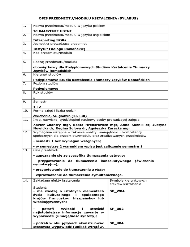 OPIS PRZEDMIOTU/MODUŁU KSZTAŁCENIA (SYLABUS) 1. 2. 3. Nazwa przedmiotu/modułu w języku polskim TŁUMACZENIE USTNE Nazwa przedmiotu/modułu w języku angielskim Interpreting Skills Jednostka prowadząca przedmiot 4. Instytut Filologii Romańskiej Kod przedmiotu/modułu 5. Rodzaj przedmiotu/modułu 6. 7. 8. 9. 10. 11. 12. obowiązkowy dla Podyplomowych Studiów Kształcenia Tłumaczy Języków Romańskich Kierunek studiów Podyplomowe Studia Kształcenia Tłumaczy Języków Romańskich Poziom studiów Podyplomowe Rok studiów I Semestr 1i2 Forma zajęć i liczba godzin ćwiczenia, 56 godzin (26+30) Imię, nazwisko, tytuł/stopień naukowy osoby prowadzącej zajęcia Xavier Chantry mgr, Beata Hrehorowicz mgr, Anna Kuźnik dr, Justyna Nowicka dr, Regina Solova dr, Agnieszka Zarazka mgr Wymagania wstępne w zakresie wiedzy, umiejętności i kompetencji społecznych dla przedmiotu/modułu oraz zrealizowanych przedmiotów - semestr 1 bez wymagań wstępnych; 13. - w semestrze 2 warunkiem wpisu jest zaliczenie semestru 1 Cele przedmiotu - zapoznanie się ze specyfiką tłumaczenia ustnego; - przygotowanie symulacyjne); do tłumaczenia konsekutywnego (ćwiczenia - przygotowanie do tłumaczenia a vista; 14. - wprowadzenie do tłumaczenia symultanicznego. Zakładane efekty kształcenia Student: - ma wiedzę o istotnych elementach życia kulturalnego i społecznego krajów francusko-, hiszpańsko- lub włoskojęzycznych; Symbole kierunkowych efektów kształcenia SP_W04 potrafi wyłonić i streścić najistotniejsze informacje zawarte w wypowiedzi (umiejętność syntezy); SP_U02 - potrafi w obu językach skonstruować stosowną wypowiedź (unikać wtrętów, SP_U04 naleciałości językowych itp.), zna zasady tworzenia poprawnych wypowiedzi w obu językach (ma świadomość najczęściej popełnianych błędów), potrafi śledzić zmiany zachodzące w językach, potrafi używać stylu dopasowanego do danej sytuacji przekładowej; 15. - potrafi stworzyć i wykorzystywać system notacji, zinterpretować wysłuchany tekst, wyodrębnić kluczowe myśli i jak najwierniej w stosunku do oryginału odtworzyć wypowiedź w oparciu o samodzielnie sporządzone notatki w języku wyjściowym i docelowym lub bez notatek; potrafi dokonać tłumaczenia a vista z wybranego języka romańskiego (francuskiego, hiszpańskiego lub włoskiego) na język polski i odwrotnie; SP_U07 - ma świadomość znaczenia zasad etyki zawodowej i uczciwości intelektualnej w działaniach własnych i innych osób, postępuje zgodnie z tymi zasadami; SP_K02 - umie ćwiczyć pamięć i zdolność skupienia się w sytuacji stresu SP_K05 rozumie obowiązujące w obu kulturach reguły bezpośredniej interakcji, rozumie w obu językach treści wyrażone implicite, aluzje, stereotypy, nawiązania intertekstualne; SP_K07 potrafi dokonać samooceny (kwestionuje własne nawyki, przyjmuje nowości, dba o jakość, potrafi się dopasować do danej sytuacji) i być odpowiedzialny. Treści programowe SP_K08 - podstawowe informacje na temat zawodu tłumacza żywego języka; - specyfika tłumaczenia symultanicznego w zależności od otoczenia; - ćwiczenia z zakresu tłumaczenia konsekutywnego i symultanicznego; - ćwiczenia w tłumaczeniu wykorzystujące autentyczne wypowiedzi i nagrania (audio i video); 16. - ćwiczenia z zakresu tłumaczenia a vista. Zalecana literatura Florczak J., Tłumaczenia symultaniczne praktyka, C.H. Beck, Warszawa 2013. i konsekutywne. Teoria i Gillies A., Sztuka notowania. Poradnik dla tłumaczy konferencyjnych, Tertium, Kraków 2007. Gillies A., Tłumaczenie ustne – Conference interpreting, Tertium, Kraków 2004. Poznański J., Tłumacz w postępowaniu karnym, Translegis, Warszawa 2007. Rozan J.-F., Notatki w tłumaczeniu konsekutywnym – Note taking in Consecutive Interpreting, Tertium, Kraków 2002. Tryuk M., Przekład ustny konferencyjny, Wydawnictwo Naukowe PWN, Warszawa 2012. 17. 18. 19. Tryuk M., Przekład ustny środowiskowy, Wydawnictwo Naukowe PWN, Warszawa 2006. Forma zaliczenia poszczególnych komponentów przedmiotu/modułu, sposób sprawdzenia osiągnięcia zamierzonych efektów kształcenia zaliczenie na ocenę na podstawie wykonywanych na zajęciach tłumaczeń symultanicznych, konsekutywnych i a vista oraz prac wykonywanych w domu (np. cotygodniowe przeglądy aktualności w prasie, glosariusze, przygotowanie zadanych wystąpień) Język wykładowy polski i wybrany język romański (francuski, hiszpański lub włoski) Obciążenie pracą studenta Forma aktywności studenta Średnia liczba godzin na zrealizowanie aktywności Godziny zajęć (wg planu studiów) z nauczycielem - ćwiczenia: Praca własna studenta: czytanie wskazanej literatury oraz przygotowanie do zajęć (samodzielnie lub w konsultacji z prowadzącym): Suma godzin Liczba punktów ECTS 56 240 296 12 (5+7)