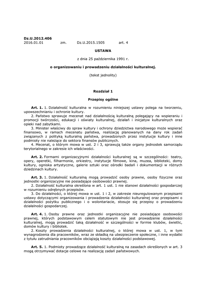 Dz.U.2012.406 2016.01.01 zm. Dz.U.2015.1505 art. 4 USTAWA z dnia 25 października 1991 r. o organizowaniu i prowadzeniu działalności kulturalnej. (tekst jednolity) Rozdział 1 Przepisy ogólne Art. 1. 1. Działalność kulturalna w rozumieniu niniejszej ustawy polega na tworzeniu, upowszechnianiu i ochronie kultury. 2. Państwo sprawuje mecenat nad działalnością kulturalną polegający na wspieraniu i promocji twórczości, edukacji i oświaty kulturalnej, działań i inicjatyw kulturalnych oraz opieki nad zabytkami. 3. Minister właściwy do spraw kultury i ochrony dziedzictwa narodowego może wspierać finansowo, w ramach mecenatu państwa, realizację planowanych na dany rok zadań związanych z polityką kulturalną państwa, prowadzonych przez instytucje kultury i inne podmioty nie należące do sektora finansów publicznych. 4. Mecenat, o którym mowa w ust. 2 i 3, sprawują także organy jednostek samorządu terytorialnego w zakresie ich właściwości. Art. 2. Formami organizacyjnymi działalności kulturalnej są w szczególności: teatry, opery, operetki, filharmonie, orkiestry, instytucje filmowe, kina, muzea, biblioteki, domy kultury, ogniska artystyczne, galerie sztuki oraz ośrodki badań i dokumentacji w różnych dziedzinach kultury. Art. 3. 1. Działalność kulturalną mogą prowadzić osoby prawne, osoby fizyczne oraz jednostki organizacyjne nie posiadające osobowości prawnej. 2. Działalność kulturalna określona w art. 1 ust. 1 nie stanowi działalności gospodarczej w rozumieniu odrębnych przepisów. 3. Do działalności, o której mowa w ust. 1 i 2, w zakresie nieuregulowanym przepisami ustawy dotyczącymi organizowania i prowadzenia działalności kulturalnej oraz przepisami o działalności pożytku publicznego i o wolontariacie, stosuje się przepisy o prowadzeniu działalności gospodarczej. Art. 4. 1. Osoby prawne oraz jednostki organizacyjne nie posiadające osobowości prawnej, których podstawowym celem statutowym nie jest prowadzenie działalności kulturalnej, mogą prowadzić taką działalność w szczególności w formie klubów, świetlic, domów kultury i bibliotek. 2. Koszty prowadzenia działalności kulturalnej, o której mowa w ust. 1, w tym wynagrodzenia dla pracowników, wraz ze składką na ubezpieczenie społeczne, i inne wydatki z tytułu zatrudniania pracowników obciążają koszty działalności podstawowej. Art. 5. 1. Podmioty prowadzące działalność kulturalną na zasadach określonych w art. 3 mogą otrzymywać dotacje celowe na realizację zadań państwowych. 2. Organizacje pozarządowe prowadzące działalność kulturalną mogą otrzymywać dotacje celowe z budżetu państwa z części, której dysponentem jest minister właściwy do spraw kultury i ochrony dziedzictwa narodowego, na zadania objęte mecenatem państwa, w tym dotacje celowe na finansowanie lub dofinansowanie kosztów realizacji inwestycji. Art. 6. (uchylony). Art. 6a. 1. Osobom wyróżniającym się w tworzeniu, upowszechnianiu i ochronie kultury nadaje się odznakę honorową "Zasłużony dla Kultury Polskiej". 2. Odznakę honorową "Zasłużony dla Kultury Polskiej" nadaje minister właściwy do spraw kultury i ochrony dziedzictwa narodowego. 3. Minister właściwy do spraw kultury i ochrony dziedzictwa narodowego określi, w drodze rozporządzenia: 1) tryb nadawania odznaki "Zasłużony dla Kultury Polskiej", 2) warunki jakie musi spełniać wniosek o nadanie odznaki, 3) wzór i sposób noszenia odznaki - biorąc pod uwagę wzornictwo stosowane w polskiej falerystyce. Art. 7. 1. Osobom wyróżniającym się w dziedzinie twórczości artystycznej, działalności kulturalnej lub ochronie kultury i dziedzictwa narodowego minister właściwy do spraw kultury i ochrony dziedzictwa narodowego nadaje Medal "Zasłużony Kulturze Gloria Artis", zwany dalej "Medalem". 2. Medal posiada trzy stopnie: 1) I stopień - Złoty Medal "Zasłużony Kulturze Gloria Artis"; 2) II stopień - Srebrny Medal "Zasłużony Kulturze Gloria Artis"; 3) III stopień - Brązowy Medal "Zasłużony Kulturze Gloria Artis". 3. Medal nadaje minister właściwy do spraw kultury i ochrony dziedzictwa narodowego z własnej inicjatywy lub na wniosek: 1) ministrów lub kierowników urzędów centralnych; 2) rektorów szkół wyższych; 3) marszałków województw; 4) wojewodów; 5) władz statutowych ogólnopolskich organizacji społecznych lub stowarzyszeń prowadzących statutową działalność kulturalną; 6) kierowników placówek dyplomatycznych lub konsularnych Rzeczypospolitej Polskiej. 4. Medal stopnia wyższego można otrzymać po upływie 5 lat od nadania Medalu stopnia bezpośrednio niższego. W przypadkach uzasadnionych wybitnymi osiągnięciami kandydata można odstąpić od powyższego wymogu. 5. Minister właściwy do spraw kultury i ochrony dziedzictwa narodowego określi, w drodze rozporządzenia: 1) wzór odznaki Medalu oraz miniatury Medalu, 2) wzór wniosku o nadanie Medalu oraz wzór legitymacji potwierdzającej nadanie Medalu, 3) tryb wydawania legitymacji potwierdzającej nadanie Medalu i warunki wydawania jej duplikatu, 4) sposób noszenia odznaki Medalu oraz miniatury Medalu - z uwzględnieniem stopni Medalu oraz warunków, jakie powinny spełniać wnioski o nadanie Medalu. Art. 7a. 1. Minister właściwy do spraw kultury i ochrony dziedzictwa narodowego oraz inni ministrowie, w odniesieniu do podległych im ośrodków i instytucji kultury, w uzgodnieniu z ministrem właściwym do spraw kultury i ochrony dziedzictwa narodowego, a także jednostki samorządu terytorialnego mogą ustanawiać i przyznawać doroczne nagrody za osiągnięcia w dziedzinie twórczości artystycznej, upowszechniania i ochrony kultury. 2. Nagrody mogą być przyznawane osobom fizycznym lub prawnym, a także innym podmiotom na podstawie oceny całokształtu działalności lub osiągnięć o istotnym znaczeniu. 3. Minister właściwy do spraw kultury i ochrony dziedzictwa narodowego, w drodze 
