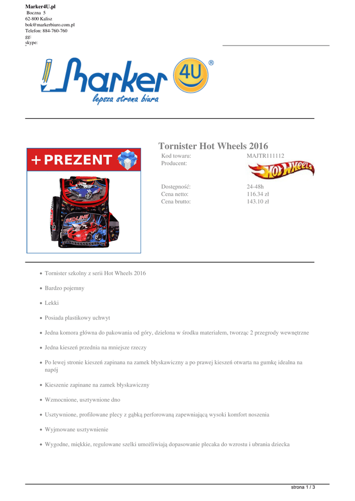 Marker4U.pl Boczna 5 62-800 Kalisz [email protected] Telefon: 884-760-760 gg: skype: Tornister Hot Wheels 2016 Kod towaru: Producent: MAJTR111112 Dostępność: Cena netto: Cena brutto: 24-48h 116.34 zł 143.10 zł Tornister szkolny z serii Hot Wheels 2016 Bardzo pojemny Lekki Posiada plastikowy uchwyt Jedna komora główna do pakowania od góry, dzielona w środku materiałem, tworząc 2 przegrody wewnętrzne Jedna kieszeń przednia na mniejsze rzeczy Po lewej stronie kieszeń zapinana na zamek błyskawiczny a po prawej kieszeń otwarta na gumkę idealna na napój Kieszenie zapinane na zamek błyskawiczny Wzmocnione, usztywnione dno Usztywnione, profilowane plecy z gąbką perforowaną zapewniającą wysoki komfort noszenia Wyjmowane usztywnienie Wygodne, miękkie, regulowane szelki umożliwiają dopasowanie plecaka do wzrostu i ubrania dziecka strona 1 / 3 Marker4U.pl Boczna 5 62-800 Kalisz [email protected] Telefon: 884-760-760 gg: skype: Plecak posiada elementy odblaskowe Tornister jest nieprzemakalny Wymiary: 37 x 32 x 22 cm Bezpieczny tornister dla Twojego dziecka, wyposażony w technologię Venti Stream: Produkt wykonany z bezpiecznych materiałów zgodnych z REACH (ang. Registration, Evaluation and Authorisation of Chemicals) - rozporządzeniem Parlamentu Europejskie i Rady (WE) nr 1907/2006 dotyczącym bezpiecznego stosowania chemikaliów. Produkty firmy St. Majewski nie zawierają substancji alergizujących i rakotwórczych. Anatomicznie wyprofilowane panele pleców, wykonane z wysokiej jakości materiałów pokrytych powłoką Air Mesh, tworzą kanały wentylacyjne, dzięki którym odbywa się przepływ powietrza pomiędzy tornistrem a plecami dziecka. System Venti Stream zapewnia maksymalny komfort użytkowania tornistra przez cały rok, niezależnie od warunków atmosferycznych i ubioru dziecka. System Venti Stream w połączeniu z lekkim stelażem i odpowiednim usztywnieniem komory głównej i spodu tornistra, pomaga w kształtowaniu prawidłowej sylwetki dziecka w okresie, kiedy rośnie ono najszybciej. Tornistry szkolne produkowane przez firmę St-Majewki umożliwiają równomierne rozłożenie ciężaru na ramionach, dzięki czemu chronią delikatne mięśnie pleców przed nadwyrężeniem. DO KAŻDEGO TORNISTRA HOT WHEELS OTRZYMASZ WYPRAWKĘ SZKOLNĄ! (TECZKA Z GUMKĄ, 5 ZESZYTÓW, BLOK RYSUNKOWY, OŁÓWEK, ODBLASK) strona 2 / 3 Marker4U.pl Boczna 5 62-800 Kalisz [email protected] Telefon: 884-760-760 gg: skype: strona 3 / 3 Powered by TCPDF (www.tcpdf.org)