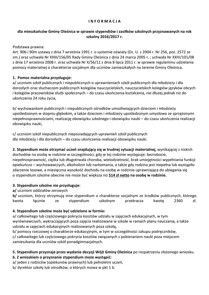 INFORMACJA dla mieszkańców Gminy Oleśnica w sprawie stypendiów i zasiłków szkolnych przyznawanych na rok szkolny 2016/2017 r. Podstawa prawna: Art. 90b i 90m ustawy z dnia 7 września 1991 r. o systemie oświaty (Dz. U. z 2004 r. Nr 256, poz. 2572 ze zm.) oraz uchwała Nr XXIII/156/05 Rady Gminy Oleśnica z dnia 24 marca 2005 r. ; uchwała Nr XXIV/101/08 z dnia 17 września 2008 r. oraz uchwała Nr X/56/11 z dnia 8 lipca 2011 r. w sprawie regulaminu udzielania pomocy materialnej o charakterze socjalnym dla uczniów zamieszkałych na terenie Gminy Oleśnica. 1. Pomoc materialna przysługuje: a/ uczniom szkół publicznych i niepublicznych o uprawnieniach szkół publicznych dla młodzieży i dla dorosłych oraz słuchaczom publicznych kolegiów nauczycielskich, nauczycielskich kolegiów języków obcych i kolegiów pracowników służb społecznych – do czasu ukończenia kształcenia, nie dłużej jednak niż do ukończenia 24 roku życia, b/ wychowankom publicznych i niepublicznych ośrodków umożliwiających dzieciom i młodzieży upośledzonym w stopniu głębokim, a także dzieciom i młodzieży upośledzonym umysłowo ze sprzężonymi niepełnosprawnościami, realizację obowiązku szkolnego i obowiązku nauki – do czasu ukończenia realizacji obowiązku nauki, c/ uczniom szkół niepublicznych nieposiadających uprawnień szkół publicznych dla młodzieży i dla dorosłych – do czasu ukończenia realizacji obowiązku nauki. 2. Stypendium może otrzymać uczeń znajdujący się w trudnej sytuacji materialnej, wynikającej z niskich dochodów na osobę w rodzinie w szczególności, gdy w tej rodzinie występuje: bezrobocie, niepełnosprawność, ciężka lub długotrwała choroba, wielodzietność, brak umiejętności wypełniania funkcji opiekuńczo – wychowawczych, alkoholizm lub narkomania, a także gdy rodzina jest niepełna lub wystąpiło zdarzenie losowe, a miesięczna wysokość dochodu na osobę w rodzinie uprawniająca do ubiegania się o stypendium szkolne obecnie nie może być większa niż 514 zł netto na osobę w rodzinie. 3. Stypendium szkolne nie przysługuje: a/ uczniom oddziałów zerowych b/ uczniom, którzy otrzymują inne stypendium o charakterze socjalnym ze środków publicznych, którego kwota łącznie ze stypendium szkolnym przekracza kwotę 2360 zł. 4. Stypendium szkolne może być udzielone w formie: a/ całkowitego lub częściowego pokrycia kosztów udziału w zajęciach edukacyjnych, w tym wyrównawczych, wykraczających poza zajęcia realizowane w szkole w ramach planu nauczania, a także udziału w zajęciach edukacyjnych realizowanych poza szkołą, b/ pomocy rzeczowej o charakterze edukacyjnym, w tym w szczególności zakupu podręczników, c/ całkowitego lub częściowego pokrycia kosztów związanych z pobieraniem nauki poza miejscem zamieszkania dla uczniów szkół ponadgimnazjalnych. 5. Stypendium przyznaje przez wydanie decyzji Wójt Gminy Oleśnica po rozpatrzeniu złożonego wniosku. 6. Z wnioskiem o przyznanie stypendium może wystąpić: a/ jeden z rodziców (opiekunów prawnych) lub pełnoletni uczeń, b/ dyrektor szkoły lub ośrodków, o których mowa w pkt 1 b. 7. Procedura składania wniosków: a) zainteresowani określeni w pkt 6 składają wniosek wraz z niezbędnymi dokumentami w sekretariacie Urzędu Gminy Oleśnica do dnia 15 września 2016 r., a słuchacze kolegium do dnia 15 października 2016 r. Formularze wniosków można pobierać w Referacie Promocji Współpracy i Pozyskiwania Funduszy Urzędu Gminy Oleśnica, ul. 11 Listopada 24 ( pok. 23, I piętro) a także na stronie internetowej Urzędu Gminy. 8. Do wniosku załącza się zaświadczenie lub oświadczenie o dochodach NETTO wszystkich osób będących we wspólnym gospodarstwie domowym ucznia lub słuchacza, uzyskanych w miesiącu poprzedzającym złożenie wniosku. Dokumenty informujące o dochodach to m.in.: 1. od pracodawcy o uzyskanych dochodach, 2. z Powiatowego Urzędu Pracy o pozostawaniu bez pracy (z prawem lub bez prawa do zasiłku), 3. odcinek renty / emerytury, 4. o podejmowaniu prac dorywczych i wysokości otrzymywanych środków z tego tytułu, 5. wyroki sądowe (ugody) dotyczące alimentów wraz z potwierdzeniem ich otrzymywania (przekaz pocztowy, wyciąg bankowy) lub zaświadczenia komornika o nieściągalności alimentów, 6. zaświadczenie lub decyzja z Gminnego Ośrodka Pomocy Społecznej o otrzymywanych świadczeniach (zasiłek stały, zasiłek okresowy, zasiłek rodzinny, zasiłek pielęgnacyjny, dodatek mieszkaniowy, fundusz alimentacyjny itp.), 7. oświadczenie o otrzymywanych innych stypendiach o charakterze socjalnym ze środków publicznych w roku szkolnym, 8. zaświadczenie ze szkoły o realizowaniu obowiązku szkolnego, 9. oświadczenie o prowadzeniu działalności gospodarczej lub gospodarstwa rolnego. 9. Przyjmuje się, że z 1 hektara przeliczeniowego uzyskuje się dochód miesięczny w wysokości 288 zł. 10. Rodziną w rozumieniu ustawy z dnia 12 marca 2004 r. o pomocy społecznej (Dz. U. z 2016 r. poz. 930 ze zm.) są osoby spokrewnione lub niespokrewnione pozostające w faktycznym związku, wspólnie zamieszkujące i gospodarujące. 11. Zasiłek szkolny może być przyznany uczniowi znajdującemu się przejściowo w trudnej sytuacji materialnej z powodu zdarzenia losowego, tj.: 1) śmierć rodzica lub opiekuna prawnego, 2) długotrwała choroba ucznia lub najbliższego członka rodziny, 3) szkoda wyrządzona uczniowi oraz jego rodzinie nagłym wypadkiem lub klęską żywiołową, 4) inna, szczególna okoliczność. 12. O zasiłek szkolny można ubiegać się (składając wniosek w sekretariacie Urzędu Gminy Oleśnica) w ciągu dwóch miesięcy od dnia, w którym nastąpiło zdarzenie uzasadniające przyznanie zasiłku. 13. Zasiłek szkolny: a) może być przyznany w formie świadczenia pieniężnego na pokrycie wydatków związanych z procesem edukacyjnym lub w formie pomocy rzeczowej o charakterze edukacyjnym, b) re