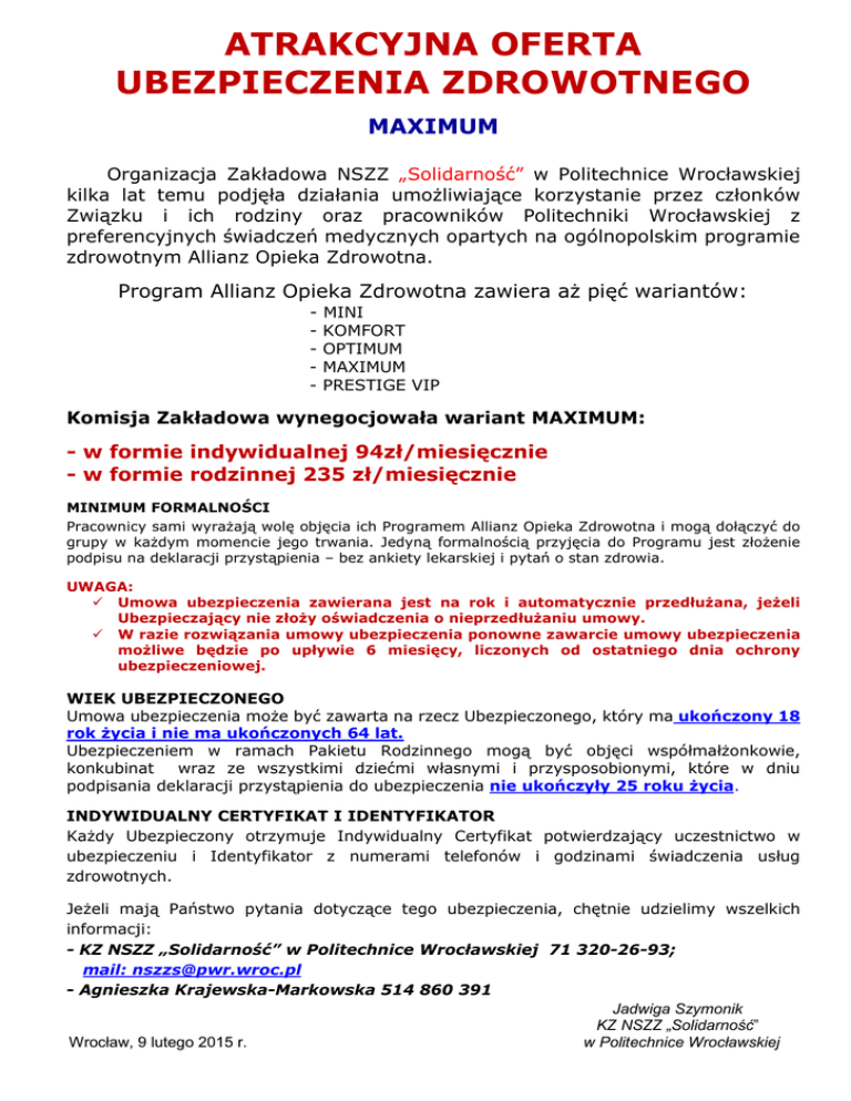 ATRAKCYJNA OFERTA UBEZPIECZENIA ZDROWOTNEGO MAXIMUM Organizacja Zakładowa NSZZ „Solidarność” w Politechnice Wrocławskiej kilka lat temu podjęła działania umożliwiające korzystanie przez członków Związku i ich rodziny oraz pracowników Politechniki Wrocławskiej z preferencyjnych świadczeń medycznych opartych na ogólnopolskim programie zdrowotnym Allianz Opieka Zdrowotna. Program Allianz Opieka Zdrowotna zawiera aż pięć wariantów: - MINI KOMFORT OPTIMUM MAXIMUM PRESTIGE VIP Komisja Zakładowa wynegocjowała wariant MAXIMUM: - w formie indywidualnej 94zł/miesięcznie - w formie rodzinnej 235 zł/miesięcznie MINIMUM FORMALNOŚCI Pracownicy sami wyrażają wolę objęcia ich Programem Allianz Opieka Zdrowotna i mogą dołączyć do grupy w każdym momencie jego trwania. Jedyną formalnością przyjęcia do Programu jest złożenie podpisu na deklaracji przystąpienia – bez ankiety lekarskiej i pytań o stan zdrowia. UWAGA: Umowa ubezpieczenia zawierana jest na rok i automatycznie przedłużana, jeżeli Ubezpieczający nie złoży oświadczenia o nieprzedłużaniu umowy. W razie rozwiązania umowy ubezpieczenia ponowne zawarcie umowy ubezpieczenia możliwe będzie po upływie 6 miesięcy, liczonych od ostatniego dnia ochrony ubezpieczeniowej. WIEK UBEZPIECZONEGO Umowa ubezpieczenia może być zawarta na rzecz Ubezpieczonego, który ma ukończony 18 rok życia i nie ma ukończonych 64 lat. Ubezpieczeniem w ramach Pakietu Rodzinnego mogą być objęci współmałżonkowie, konkubinat wraz ze wszystkimi dziećmi własnymi i przysposobionymi, które w dniu podpisania deklaracji przystąpienia do ubezpieczenia nie ukończyły 25 roku życia. INDYWIDUALNY CERTYFIKAT I IDENTYFIKATOR Każdy Ubezpieczony otrzymuje Indywidualny Certyfikat potwierdzający uczestnictwo w ubezpieczeniu i Identyfikator z numerami telefonów i godzinami świadczenia usług zdrowotnych. Jeżeli mają Państwo pytania dotyczące tego ubezpieczenia, chętnie udzielimy wszelkich informacji: - KZ NSZZ „Solidarność” w Politechnice Wrocławskiej 71 320-26-93; mail: [email protected] - Agnieszka Krajewska-Markowska 514 860 391 Jadwiga Szymonik KZ NSZZ „Solidarność” Wrocław, 9 lutego 2015 r. w Politechnice Wrocławskiej