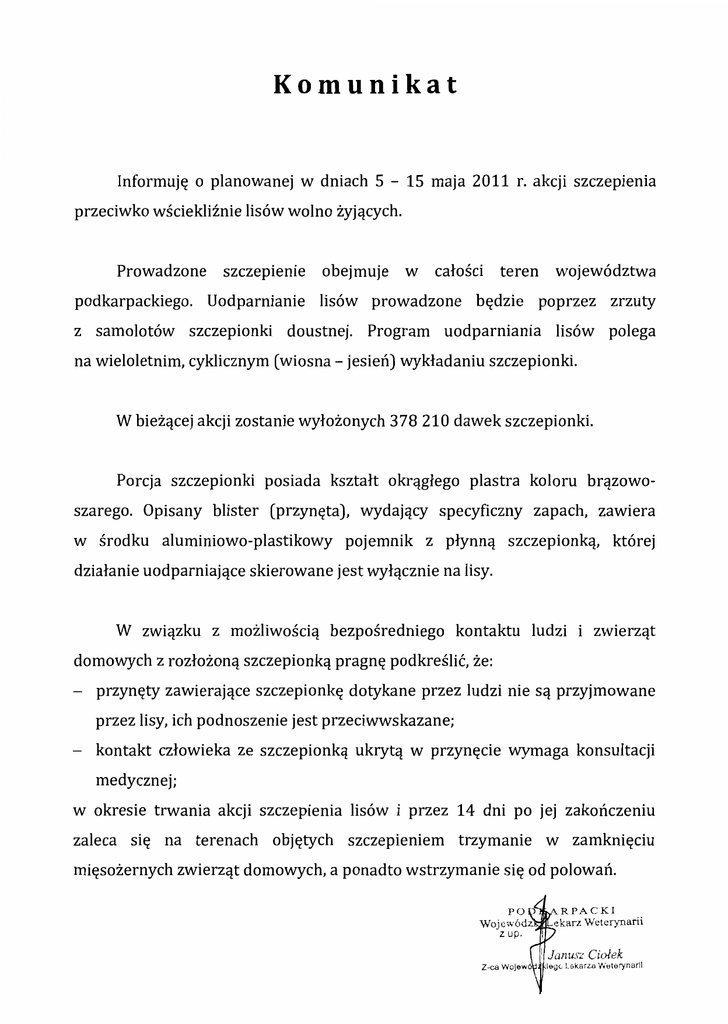Wskazówki dla mieszkańców terenów, na których zostaną wyłożone immunoprzynęty do zwalczania wścieklizny u lisów Wskazówki dla mieszkańców terenów, na których zostaną wyłożone immunoprzynęty do zwalczania wścieklizny u lisów ¾ Do zwalczania wścieklizny zostaną zrzucone z samolotu przynęty, które po przyjęciu przez lisy wytworzą immunologiczną odporność. ¾ Przynęty zawierające szczepionkę przeciw wściekliźnie mają kształt ściętego stożka o wymiarach ∅ 39 mm na dole, ∅ 35 mm na górze, grubość ok. 15 mm. W środku umieszczony jest plastikowy pojemnik zawierający płynna szczepionkę. ¾ Prosimy nie podnosić i nie dotykać przynęt. Przynęty, które były dotykane przez ludzi są omijane przez lisy. ¾ Dla zachowania ostrożności, prosimy przy ewentualnym kontakcie przynęty z otwartą raną, oczami, jamą ustną czy nosem gruntownie przemyć te miejsca wodą z mydłem. W dalszym postępowaniu zgłosić się do lekarza. ¾ Szczepionka jest nieszkodliwa dla zwierząt domowych i innych zwierząt wolnożyjących. ¾ Po wyłożeniu przynęt przez 3 tygodnie nie wolno puszczać psów. W przypadku kontaktu zwierząt domowych z przynętą należy skontaktować się z lekarzem weterynarii. ¾ Przynęty ze szczepionką doustną są dopuszczone do szczepienia lisów. ¾ Do zwalczania wścieklizny zostaną zrzucone z samolotu przynęty, które po przyjęciu przez lisy wytworzą immunologiczną odporność. ¾ Przynęty zawierające szczepionkę przeciw wściekliźnie mają kształt ściętego stożka o wymiarach ∅ 39 mm na dole, ∅ 35 mm na górze, grubość ok. 15 mm. W środku umieszczony jest plastikowy pojemnik zawierający płynna szczepionkę. ¾ Prosimy nie podnosić i nie dotykać przynęt. Przynęty, które były dotykane przez ludzi są omijane przez lisy. ¾ Dla zachowania ostrożności, prosimy przy ewentualnym kontakcie przynęty z otwartą raną, oczami, jamą ustną czy nosem gruntownie przemyć te miejsca wodą z mydłem. W dalszym postępowaniu zgłosić się do lekarza. ¾ Szczepionka jest nieszkodliwa dla zwierząt domowych i innych zwierząt wolnożyjących. ¾ Po wyłożeniu przynęt przez 3 tygodnie nie wolno puszczać psów. W przypadku kontaktu zwierząt domowych z przynętą należy skontaktować się z lekarzem weterynarii. ¾ Przynęty ze szczepionką doustną są dopuszczone do szczepienia lisów. Prosimy o pomoc w skutecznym przeprowadzeniu akcji zwalczania wścieklizny. Dziękujemy Prosimy o pomoc w skutecznym przeprowadzeniu akcji zwalczania wścieklizny. Dziękujemy Producent szczepionki: Importer i dystrybutor: Bioveta a.s. Ivanovice na Hane, Republika Czeska PPHU Inex Sp. J., Giżycko Producent szczepionki: Importer i dystrybutor: Bioveta a.s. Ivanovice na Hane, Republika Czeska PPHU Inex Sp. J., Giżycko