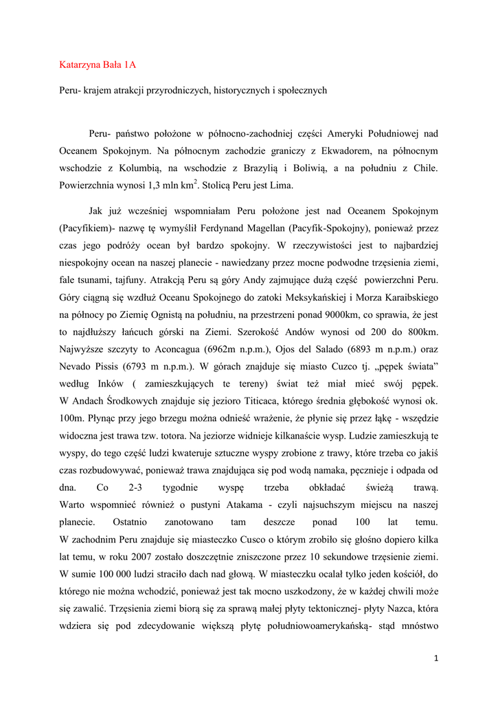 Katarzyna Bała 1A Peru- krajem atrakcji przyrodniczych, historycznych i społecznych Peru- państwo położone w północno-zachodniej części Ameryki Południowej nad Oceanem Spokojnym. Na północnym zachodzie graniczy z Ekwadorem, na północnym wschodzie z Kolumbią, na wschodzie z Brazylią i Boliwią, a na południu z Chile. Powierzchnia wynosi 1,3 mln km2. Stolicą Peru jest Lima. Jak już wcześniej wspomniałam Peru położone jest nad Oceanem Spokojnym (Pacyfikiem)- nazwę tę wymyślił Ferdynand Magellan (Pacyfik-Spokojny), ponieważ przez czas jego podróży ocean był bardzo spokojny. W rzeczywistości jest to najbardziej niespokojny ocean na naszej planecie - nawiedzany przez mocne podwodne trzęsienia ziemi, fale tsunami, tajfuny. Atrakcją Peru są góry Andy zajmujące dużą część powierzchni Peru. Góry ciągną się wzdłuż Oceanu Spokojnego do zatoki Meksykańskiej i Morza Karaibskiego na północy po Ziemię Ognistą na południu, na przestrzeni ponad 9000km, co sprawia, że jest to najdłuższy łańcuch górski na Ziemi. Szerokość Andów wynosi od 200 do 800km. Najwyższe szczyty to Aconcagua (6962m n.p.m.), Ojos del Salado (6893 m n.p.m.) oraz Nevado Pissis (6793 m n.p.m.). W górach znajduje się miasto Cuzco tj. „pępek świata” według Inków ( zamieszkujących te tereny) świat też miał mieć swój pępek. W Andach Środkowych znajduje się jezioro Titicaca, którego średnia głębokość wynosi ok. 100m. Płynąc przy jego brzegu można odnieść wrażenie, że płynie się przez łąkę - wszędzie widoczna jest trawa tzw. totora. Na jeziorze widnieje kilkanaście wysp. Ludzie zamieszkują te wyspy, do tego część ludzi kwateruje sztuczne wyspy zrobione z trawy, które trzeba co jakiś czas rozbudowywać, ponieważ trawa znajdująca się pod wodą namaka, pęcznieje i odpada od dna. Co 2-3 tygodnie wyspę trzeba obkładać świeżą trawą. Warto wspomnieć również o pustyni Atakama - czyli najsuchszym miejscu na naszej planecie. Ostatnio zanotowano tam deszcze ponad 100 lat temu. W zachodnim Peru znajduje się miasteczko Cusco o którym zrobiło się głośno dopiero kilka lat temu, w roku 2007 zostało doszczętnie zniszczone przez 10 sekundowe trzęsienie ziemi. W sumie 100 000 ludzi straciło dach nad głową. W miasteczku ocalał tylko jeden kościół, do którego nie można wchodzić, ponieważ jest tak mocno uszkodzony, że w każdej chwili może się zawalić. Trzęsienia ziemi biorą się za sprawą małej płyty tektonicznej- płyty Nazca, która wdziera się pod zdecydowanie większą płytę południowoamerykańską- stąd mnóstwo 1 wybuchów wulkanów, mocnych trzęsień ziemi. Nie ma miesiąca, żeby ziemia się tam nie ruszała. Na podsumowanie atrakcji przyrodniczych opiszę bardzo ciekawe zjawisko. Archipelag Małe Galapagos zamieszkuje mnóstwo ciekawych zwierząt tj. pingwiny, foki, ryby morskie oraz ogrom ptaków, które produkują niesamowite bogactwo tych terenów - a mianowicie guano, według niektórych najlepszy nawóz naturalny na świecie. Raz w roku Peruwiańczycy lądują na wyspach aby nazbierać nawóz. Pakują w worki i wysyłają do Niemiec, Japonii. Niebywałe jest to iż 1 kg ptasich odchodów kosztuje ponad 200zł. Myślę, że każdy chciałby mieć takie ptaszki, zeskrobywać kupki i dostawać za to niemałą sumę. Niestety ptaki żyją tylko tam ze względu na klimat oraz natłok ryb. W południowo-zachodniej części Peru wzbijając się w niebo nad pustyniami można dostrzec niezwykłe znaki np. małpę, psa, kolibra, kosmonautę, wieloryba, pająka itd. Znaków jest wiele. Rozsiane są na pustyniach w okolicy Nazca. Do dzisiaj nie wiadomo kto i w jakim celuje stworzył?- są przeróżne niektóre mają kilka metrów, inne zaś kilka kilometrów. Znaki powstały tysiące lat temu, ludzie zamieszkujący te tereny rozgrzebywali ciemne kamienie wydobywając pomiędzy nimi jaśniejszy piasek. Powstała linia szeroka na kilku do kilkunastu metrów. Stojąc na tej linii nic nie widać, tylko zakręt w pewnym momencie. Aby dostrzec znak trzeba wzbić się przynajmniej kilkaset metrów nad ziemię. Jest wiele teorii dotyczących tych znaków, najbardziej popularna mówi, że znaki to jest mapa nieba, że każda figura ma odpowiadać jakiemuś gwiazdozbiorowi. Następna teoria zakłada, że ludzie którzy to stworzyli mieli mieć kontakt z UFO, bo jak wytłumaczyć znak w kształcie kosmonauty? Przecież w kosmos latamy od kilkudziesięciu lat, on jest tam od ponad 2 000 lat. Najnowsza teoria mówi, że znaki to miejsce do pielgrzymowania. Przez każdy znak możemy przejść nie przecinając go w żadnym miejscu. Po kilkunastu lub kilkudziesięciu minutach wychodzimy w tym samym miejscu. Naukowcy mówią, że ludzie żyjący tam kiedy brakowało wody pielgrzymowali - w ten sposób próbowali wybłagać u swoich bogów opady deszczu. W odległości 112km od Cuzco znajduje się najlepiej zachowane miasto inkaskie Machu Picchu (stary szczyt)- strzeżone przez ogromne masywy górskie. Ludzie żyli tam bardzo krótko, niecałe 100 lat po czym bardzo szybko do dziś nie wiadomo dlaczego opuścili swoją górską siedzibę. Niektórzy mówią, że mieszkańców mogła zainfekować jakaś epidemia, zaraza. Biali przez ponad 400 lat nie mieli pojęcia o istnieniu Machu Picczhu. Hiszpanie nigdy tam nie dotarli. Miasto zostało odkryte zupełnie przez przypadek 103 lata temu przez amerykańskiego archeologa. Niewiarygodne jest to, że gdy archeolog wszedł na teren Machu Pichu wszystko wyglądało tak jakby ludzie nie zniknęli setki lat temu, tylko zaledwie kilka tygodni opuścili 2 ten teren. W domach na stołach były misy z resztkami jedzenia, ubrania, sprzęty codziennego użytku. Na pierwszym planie miasta znajduje się część mieszkalna - domu budowlane z kamienia, dalej coś w stylu naszego rynku, jeszcze dalej świątynie, znowu domy, cmentarzysko. Jeszcze dalej mniej znany, ale również niesamowity Hu