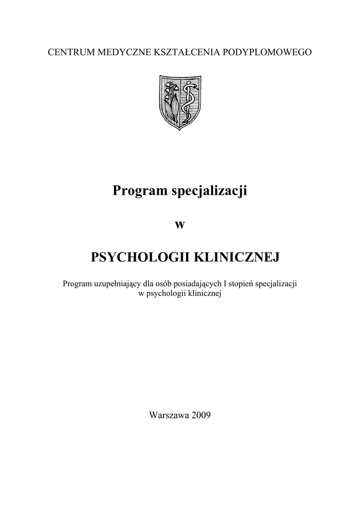 CENTRUM MEDYCZNE KSZTAŁCENIA PODYPLOMOWEGO Program specjalizacji w PSYCHOLOGII KLINICZNEJ Program uzupełniający dla osób posiadających I stopień specjalizacji w psychologii klinicznej Warszawa 2009 Program uzupełniający specjalizacji w psychologii klinicznej ZAŁOŻENIA ORGANIZACYJNO-PROGRAMOWE A) Cele kształcenia i uzyskane kompetencje zawodowe 1. Rozwój wiedzy z zakresu psychologii klinicznej, nauk medycznych i humanistycznospołecznych umożliwiającej rozumienie i rozwiązywanie problemów psychologicznych osób chorych. 2. Nabywanie i doskonalenie umiejętności wykorzystywania wiedzy w działalności diagnostycznej, terapeutyczno-rehabilitacyjnej, eksperckiej, orzeczniczej. 3. Nabywanie i doskonalenie wiedzy i umiejętności potrzebnych do stosowania psychologicznych metod terapii. 4. Rozwój świadomości metodologicznej. 5. Rozwijanie wysokich standardów funkcjonowania zawodowego (etyka zawodowa) w kontakcie z pacjentem i jego rodziną oraz we współpracy z pracownikami służby zdrowia. Uzyskane kompetencje zawodowe. Absolwent studiów specjalizacyjnych w dziedzinie psychologii klinicznej uzyska szczególne kwalifikacje umożliwiające: 1. samodzielne definiowanie, stawianie klinicznej diagnozy psychologicznej 2. wskazywanie i planowanie postępowania terapeutycznego i/ lub rehabilitacyjnego w zakresie wyznaczonym psychologiczną diagnozą pacjenta 3. stosowanie psychologicznych metod leczenia 4. stosowanie psychologicznych metod rehabilitacji 5. wydawanie opinii psychologicznych w sprawach cywilnych, karnych 6. opracowanie programów profilaktyki i promocji zdrowia psychicznego Ponadto psycholog kliniczny będzie uprawniony do: - udzielania konsultacji - wystawiania specjalistycznych opinii i zaświadczeń - konsultacji w kwestiach zdrowia publicznego i polityki społecznej - edukacji personelu medycznego W zależności od wybranej ścieżki kształcenia specjalizacyjnego szczegółowego absolwent studiów specjalizacyjnych w psychologii klinicznej uzyska także dodatkowe kompetencje szczegółowe: Uzyskane kompetencje zawodowe po ukończeniu specjalizacji w zakresie PSYCHOLOGIA KLINICZNA ZABURZEŃ PSYCHICZNYCH: • samodzielna praca diagnostyczno-terapeutyczna z osobami leczonymi z powodu zaburzeń psychicznych i uzależnień • prowadzenie badań • wydawanie opinii potrzebnych dla celów orzecznictwa sądowego i dla innych celów prowadzenie programów promocji zdrowia psychicznego i profilaktyki zaburzeń psychicznych i uzależnień CMKP 2009 2 Program uzupełniający specjalizacji w psychologii klinicznej Uzyskane kompetencje zawodowe po ukończeniu specjalizacji w zakresie PSYCHOLOGIA KLINICZNA CHORÓB SOMATYCZNYCH: • Samodzielne diagnozowanie w oparciu o standardowe metody psychologiczne udziału czynników psychologicznych w etiologii choroby somatycznej. Ocena zależności pomiędzy specyficznymi zespołami cech i wzorami zachowań a stanem somatycznym organizmu (zaburzeniami czynności i chorobą organiczną). • samodzielna praca diagnostyczno-terapeutyczna w zakresie chorób somatycznych • Samodzielne planowanie strategii postępowania psychologicznego ukierunkowanego na redukcję czynników ryzyka choroby somatycznej. • Samodzielne planowanie i prowadzenie postępowania psychologicznego mającego na celu regulację procesów neurowegetatywnych (formy treningów psychologicznych). • Konstruowanie programów ukierunkowanych na modyfikację zachowań szkodzących zdrowiu. Praca w ramach prewencji wtórnej i rehabilitacji. Uzyskane kompetencje zawodowe po ukończeniu specjalizacji w zakresie NEUROPSYCHOLOGIA KLINICZNA: • samodzielna praca diagnostyczno-terapeutyczna w zakresie neuropsychologii • prowadzenie badań teoretycznych w dziedzinie neuropsychologii, współpraca w interdyscyplinarnych zespołach klinicznych • wydawanie opinii potrzebnych dla celów orzecznictwa sądowego i dla innych celów Uzyskane kompetencje zawodowe po ukończeniu specjalizacji w zakresie PSYCHOLOGIA KLINICZNA DZIECI I MŁODZIEŻY: • Samodzielna praca diagnostyczno-terapeutyczna z dziećmi i młodzieżą • Praca badawcza w dziedzinie psychologii dzieci i młodzieży • Wydawanie opinii i orzeczeń potrzebnych dla celów orzecznictwa sądowego i dla innych celów • Prowadzenie programów promocji zdrowia psychicznego i profilaktyki zaburzeń wieku rozwojowego B) Czas trwania specjalizacji W trakcie specjalizacji kandydat powinien odbyć staż podstawowy w wysokości 550 godzin wykonywania czynności zawodowych zgodnych z programem specjalizacji. W programie uzupełniającym Specjalizacja dla osób posiadających I stopień specjalizacji w psychologii klinicznej trwa 2 lata, a osoby specjalizujące się uzyskują tytuł specjalisty w psychologii klinicznej po ukończeniu jednego(wybranego) z czterech bloków szczegółowych. C) Sposób organizacji specjalizacji Kształcenie specjalizacyjne prowadzone jest zgodnie z programem specjalizacji i kończy się egzaminem. Kierownik specjalizacji na podstawie programu przygotowuje indywidualny plan specjalizacji określający warunki i przebieg specjalizacji zapewniający opanowanie wiadomości i nabycie umiejętności praktycznych określonych w programie specjalizacji. Kształcenie specjalizacyjne odbywa się poprzez uczestniczenie w kursach, udział w stażach w wytypowanych instytucjach, samokształcenie drogą studiowania piśmiennictwa oraz nabywanie doświadczenia w wyniku realizacji zadań praktycznych. CMKP 2009 3 Program uzupełniający specjalizacji w psychologii klinicznej W trybie programu uzupełniającego specjalizacja składa się z wybranej ścieżki specjalistycznego bloku szczegółowego. Bloki szczegółowe dotyczą zastosowania psychologii klinicznej w czterech działach medycyny: - psychiatrii, - pediatrii, - neurologii, - chorób somatycznych. W bloku szczegółowym specjalizujący się wybiera jedną z wyżej wymienionych ścieżek specjalistycznych i pogłębia swoją wiedzę i umiejętnoś